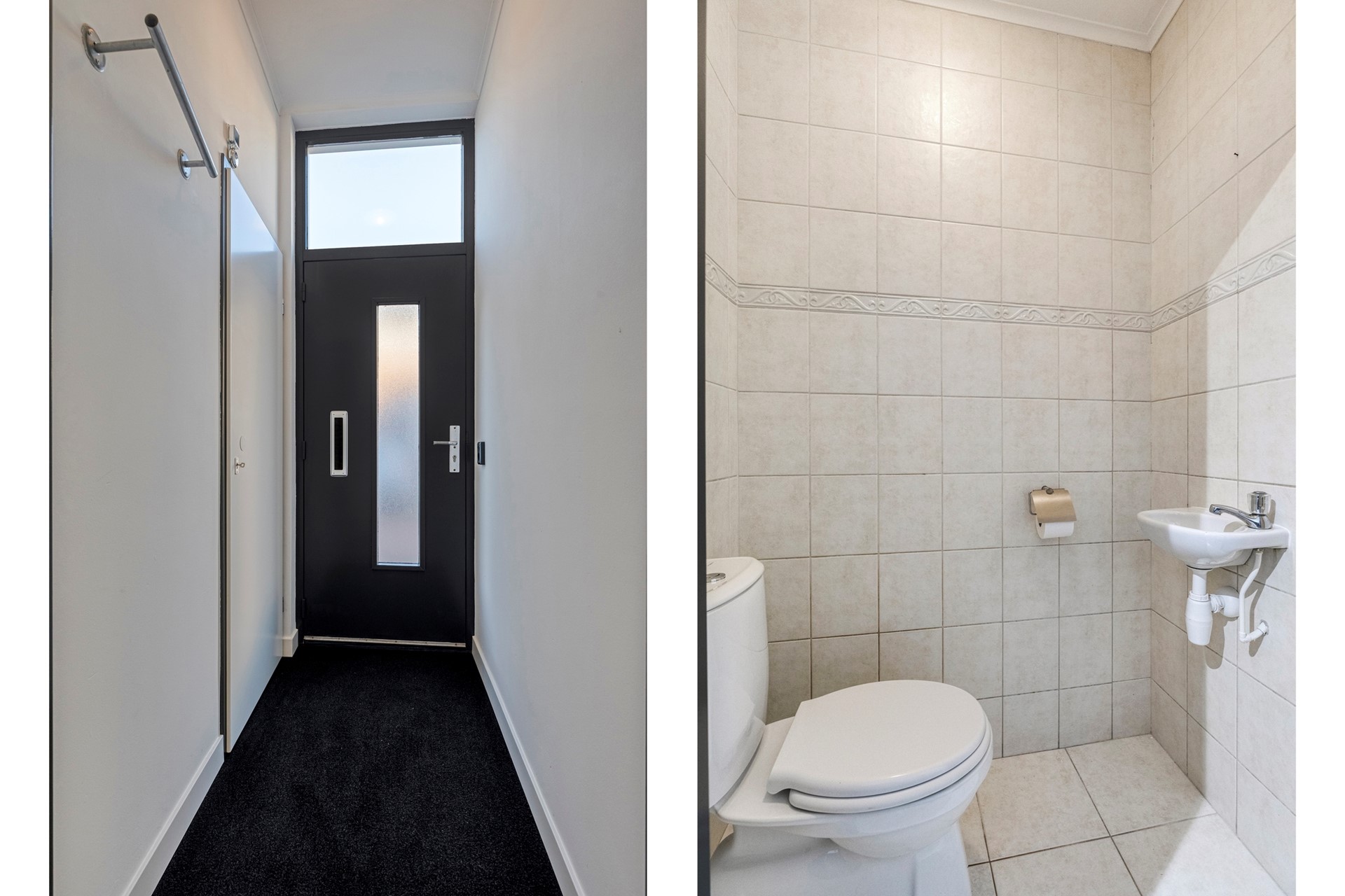 Jullie komen aan bij deze modern afgewerkte benedenwoning en lopen middels de voordeur naar binnen. Zodra je binnenstapt, word je direct verrast door de strakke afwerking en het open, ruimtelijke gevoel. De entree biedt toegang tot de woonkamer en de meterkast.