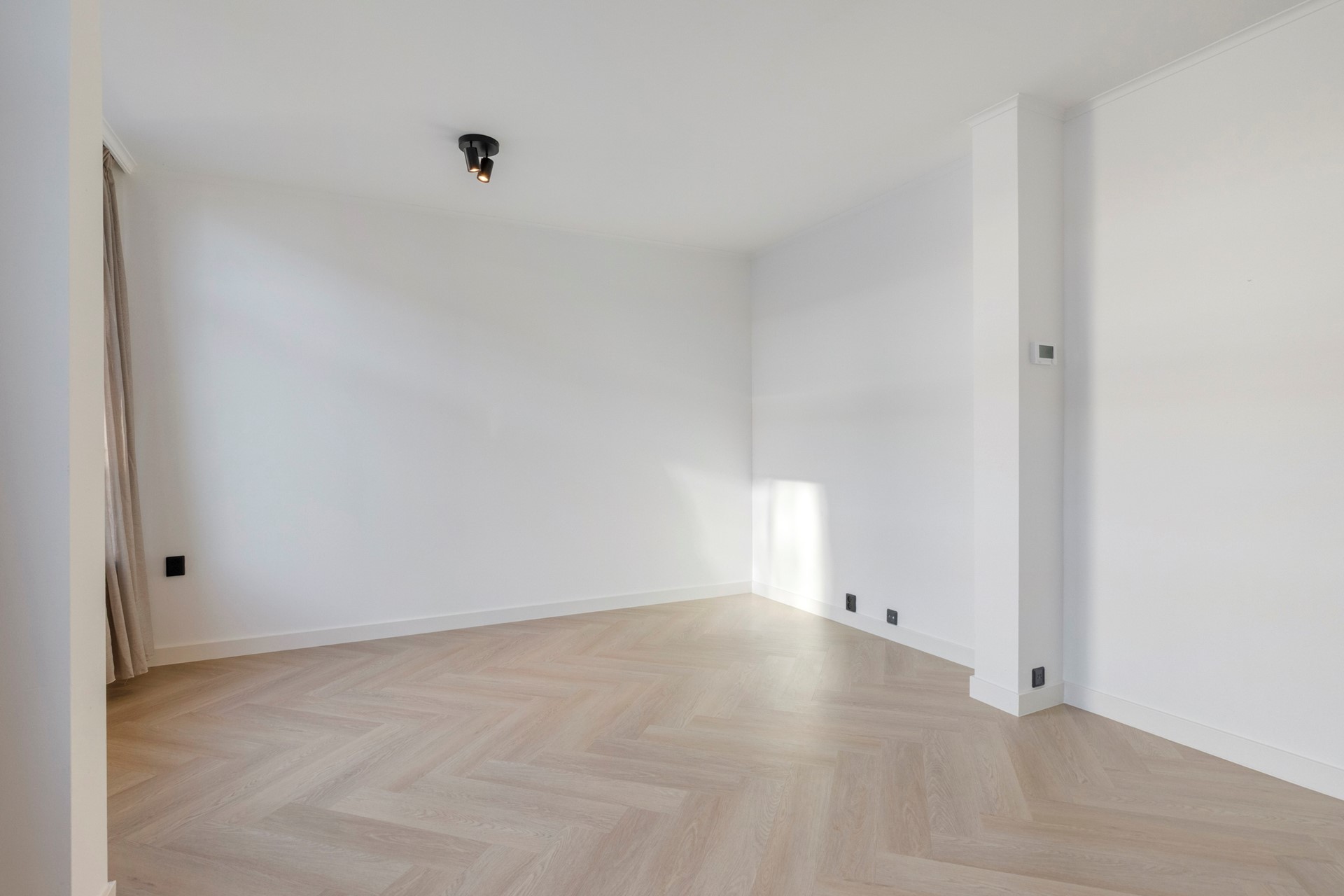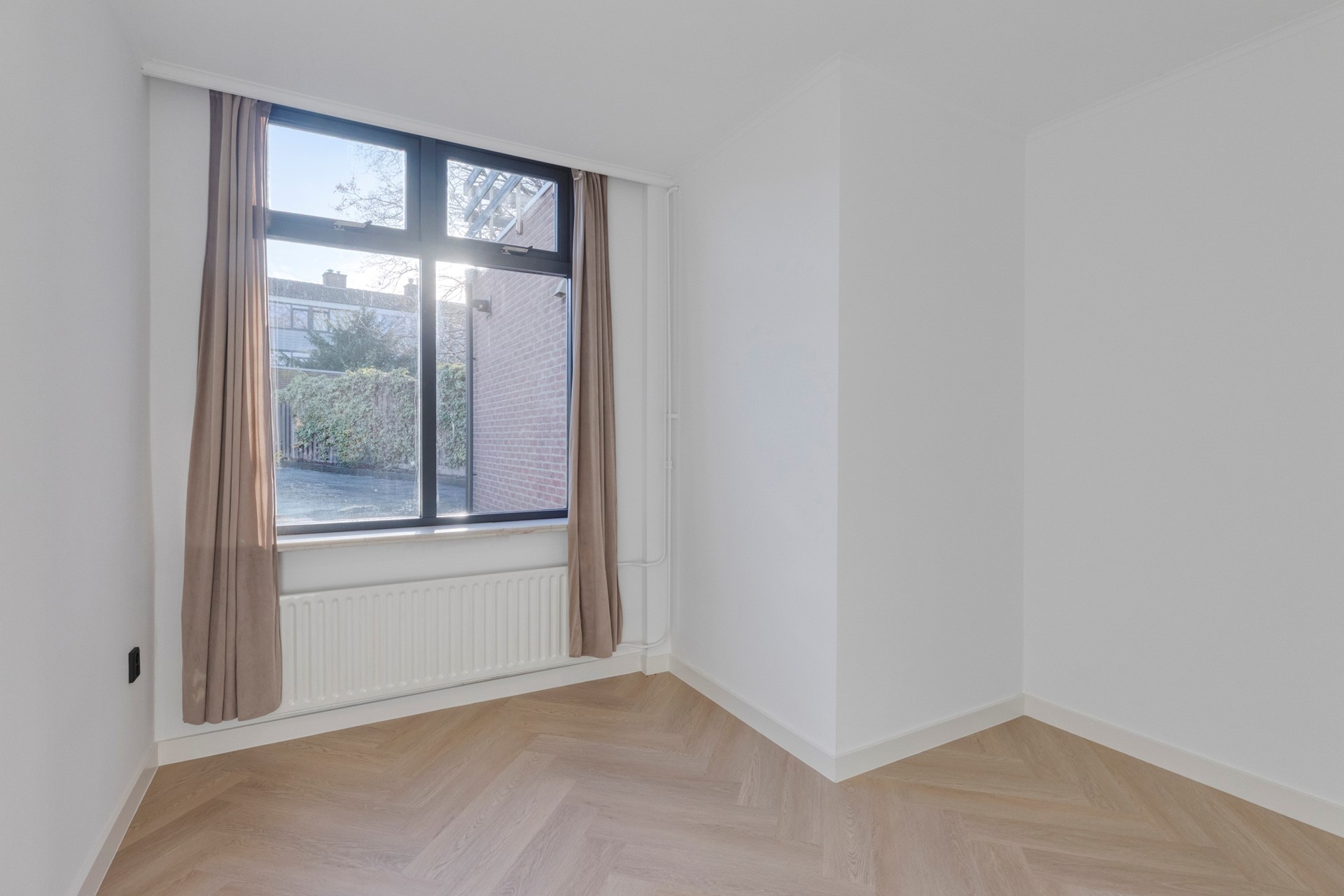 Slaapkamer 1 is afgewerkt met een in visgraat gelegde PVC vloer, gestucte wanden en een gestuct plafond.