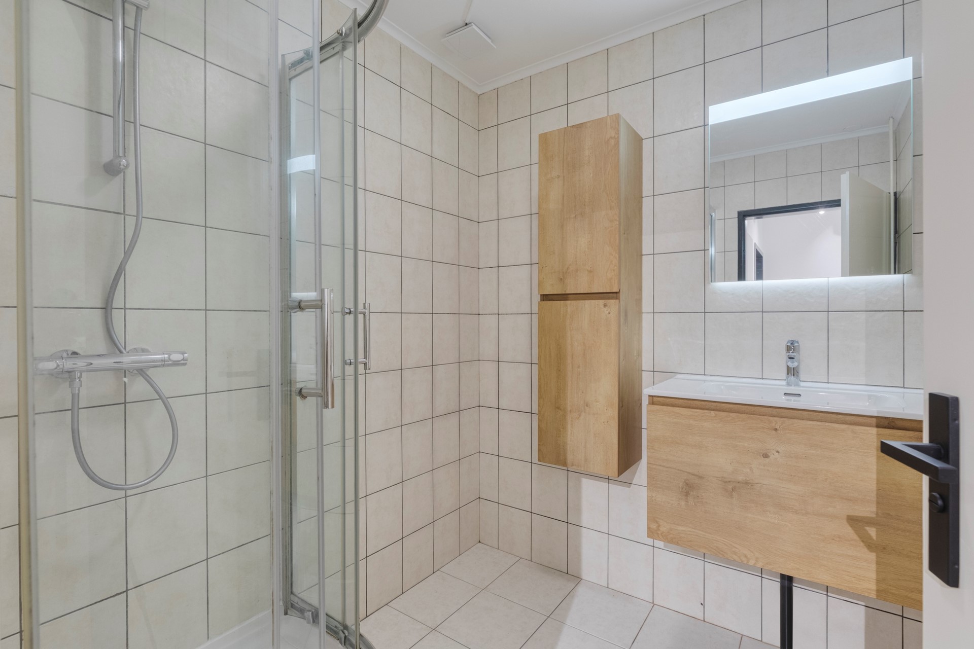 De badkamer is afgewerkt met een betegelde vloer, betegelde wanden en een gestuct plafond. De badkamer is voorzien van een douche en wastafelmeubel (2025).