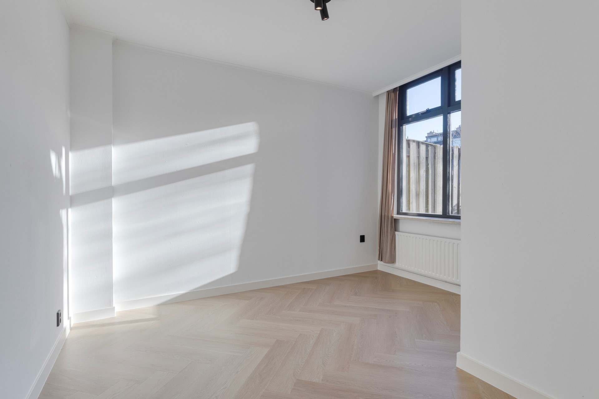 Slaapkamer 2 is afgewerkt met een in visgraat gelegde PVC vloer, gestucte wanden en een gestuct plafond.