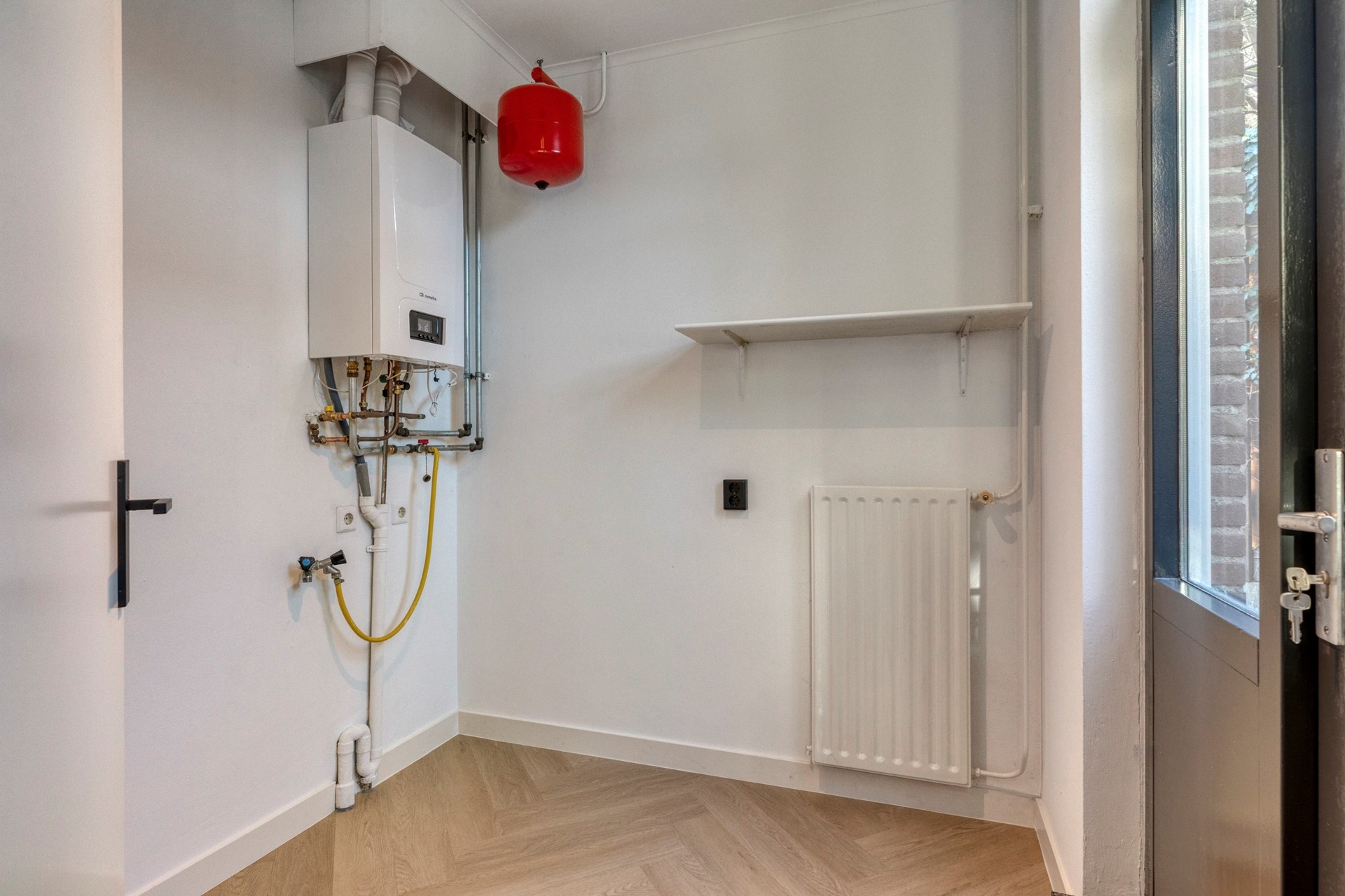 De bijkeuken is afgewerkt met een in visgraat gelegde PVC vloer, gestucte wanden en een gestuct plafond. De bijkeuken beschikt over de aansluiting witgoed, CV-Ketel (Remeha, Tzerra Ace Matic 28 C CW4 25Kw, 2025) en biedt toegang tot de achtertuin.