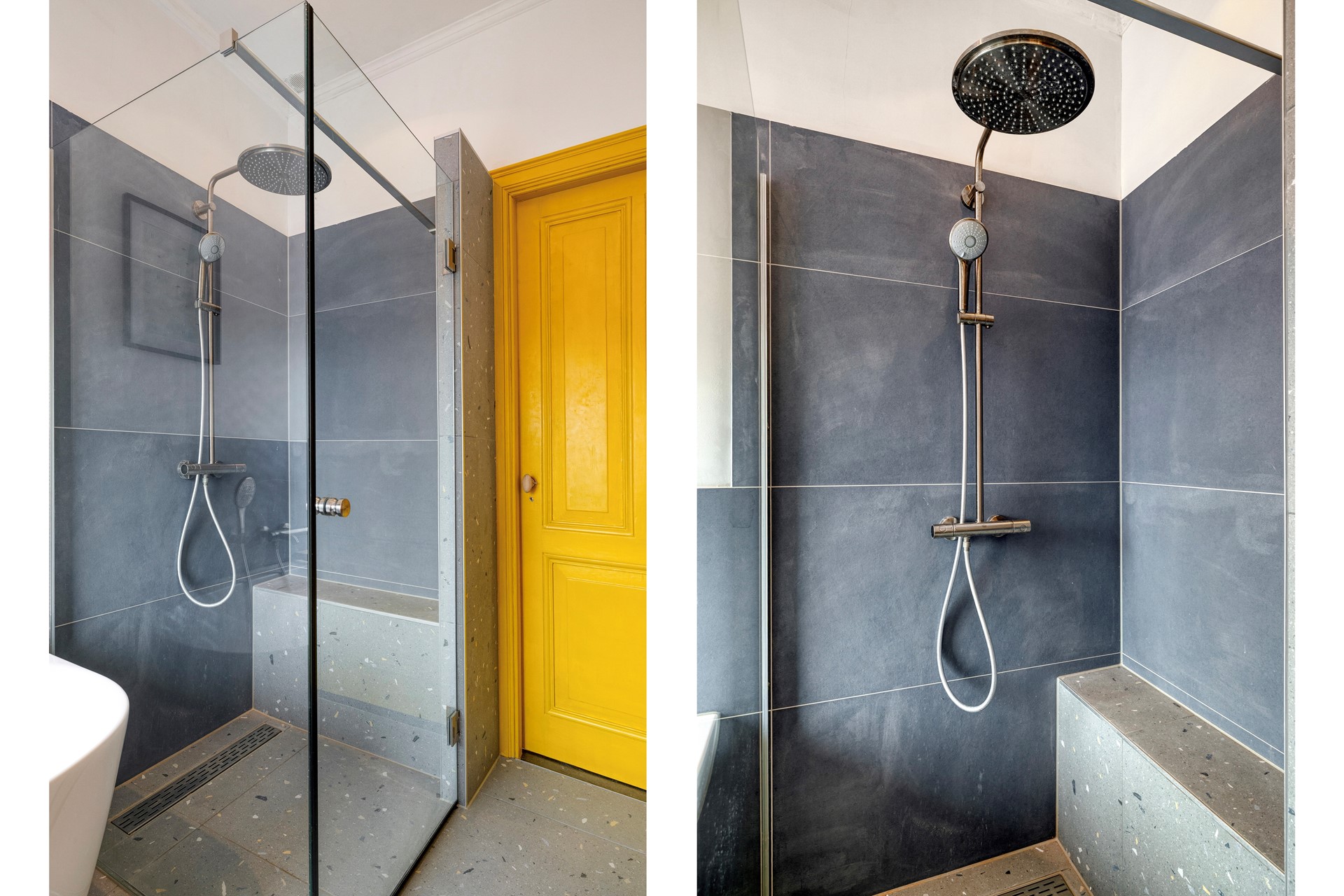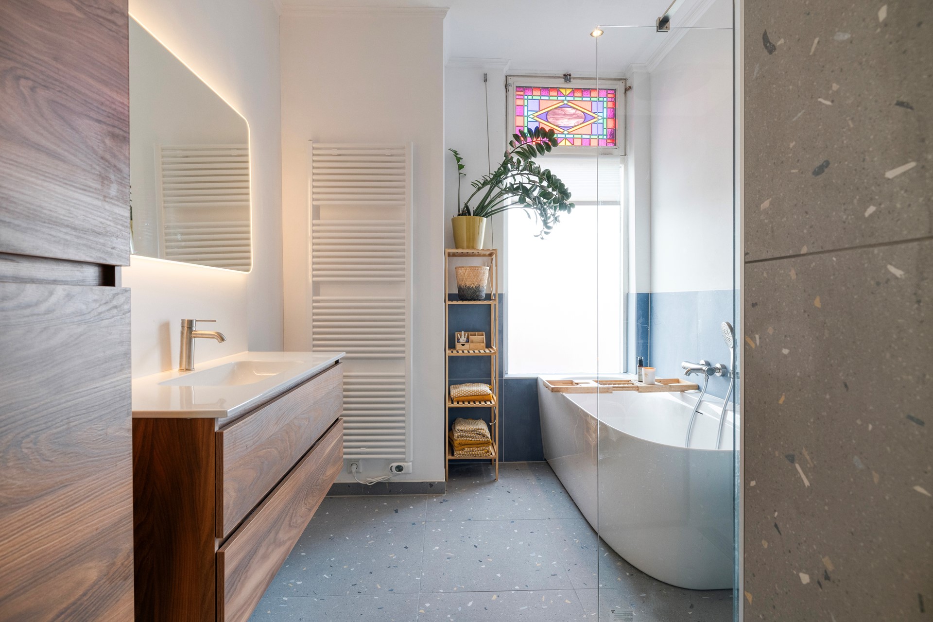 Wat een eyecatcher! Jullie wanen je in een 5-sterren hotel met deze parel van een badkamer. De badkamer (2025) is afgewerkt met een betegelde vloer, deels betegelde en deels gestucte wanden en een gestuct plafond. De badkamer is voorzien van een royale douche met bankje, ligbad, wastafelmeubel, designradiator en natuurlijke ventilatie.
