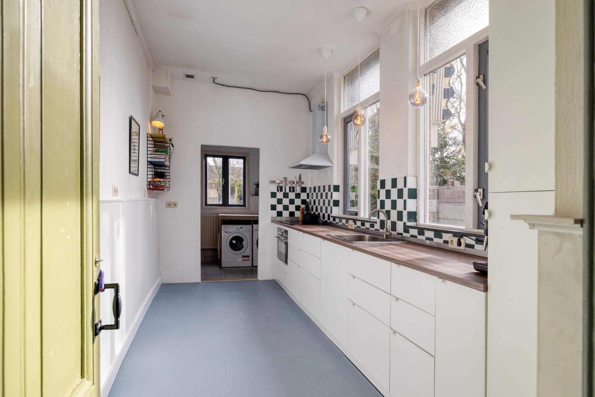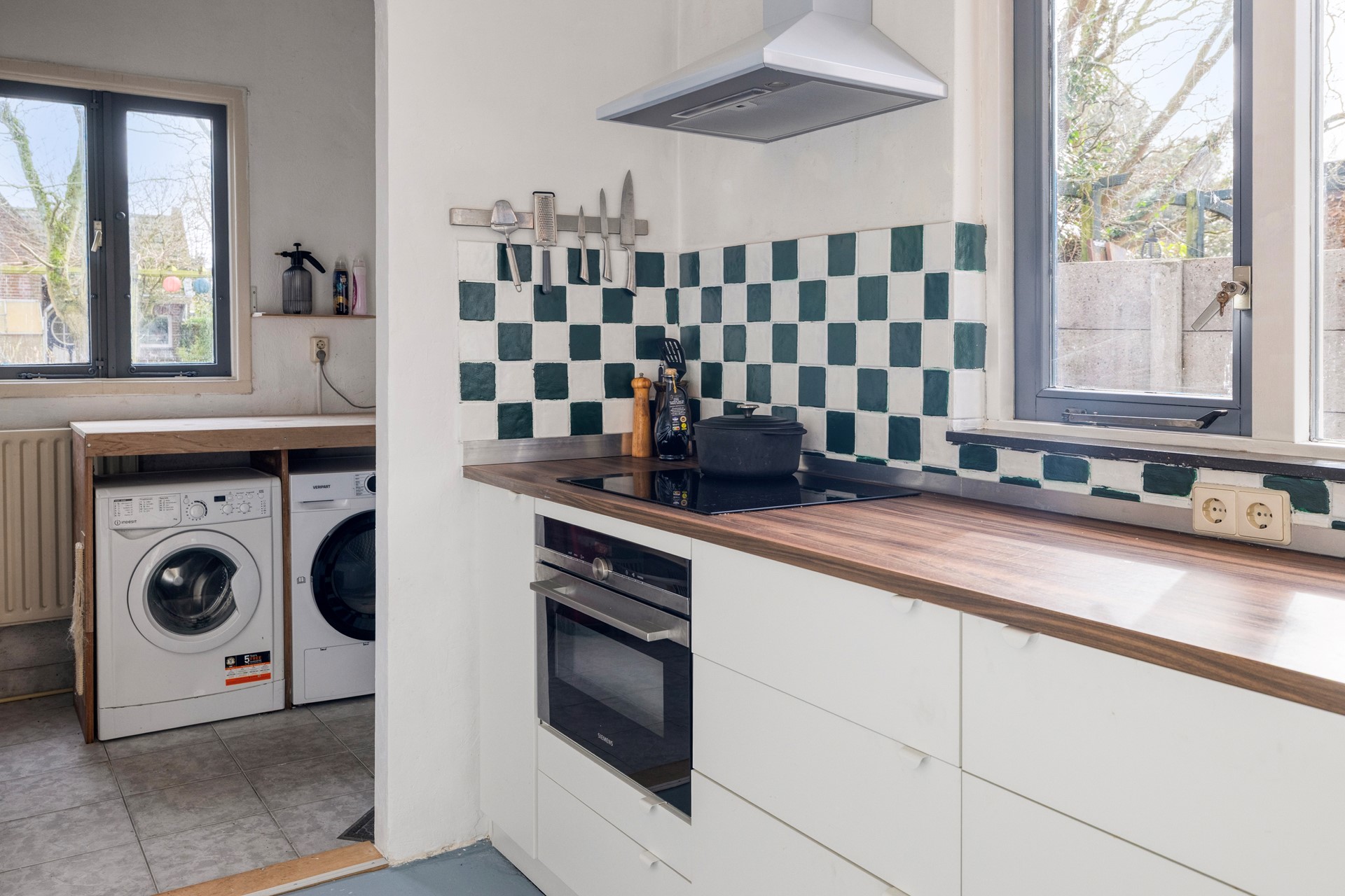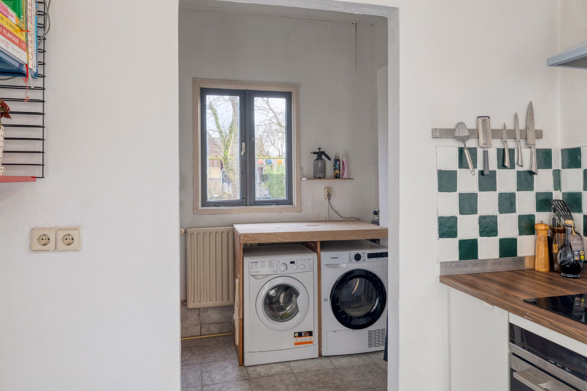 De bijkeuken beschikt over een aansluiting voor witgoed en geeft toegang tot de achtertuin.