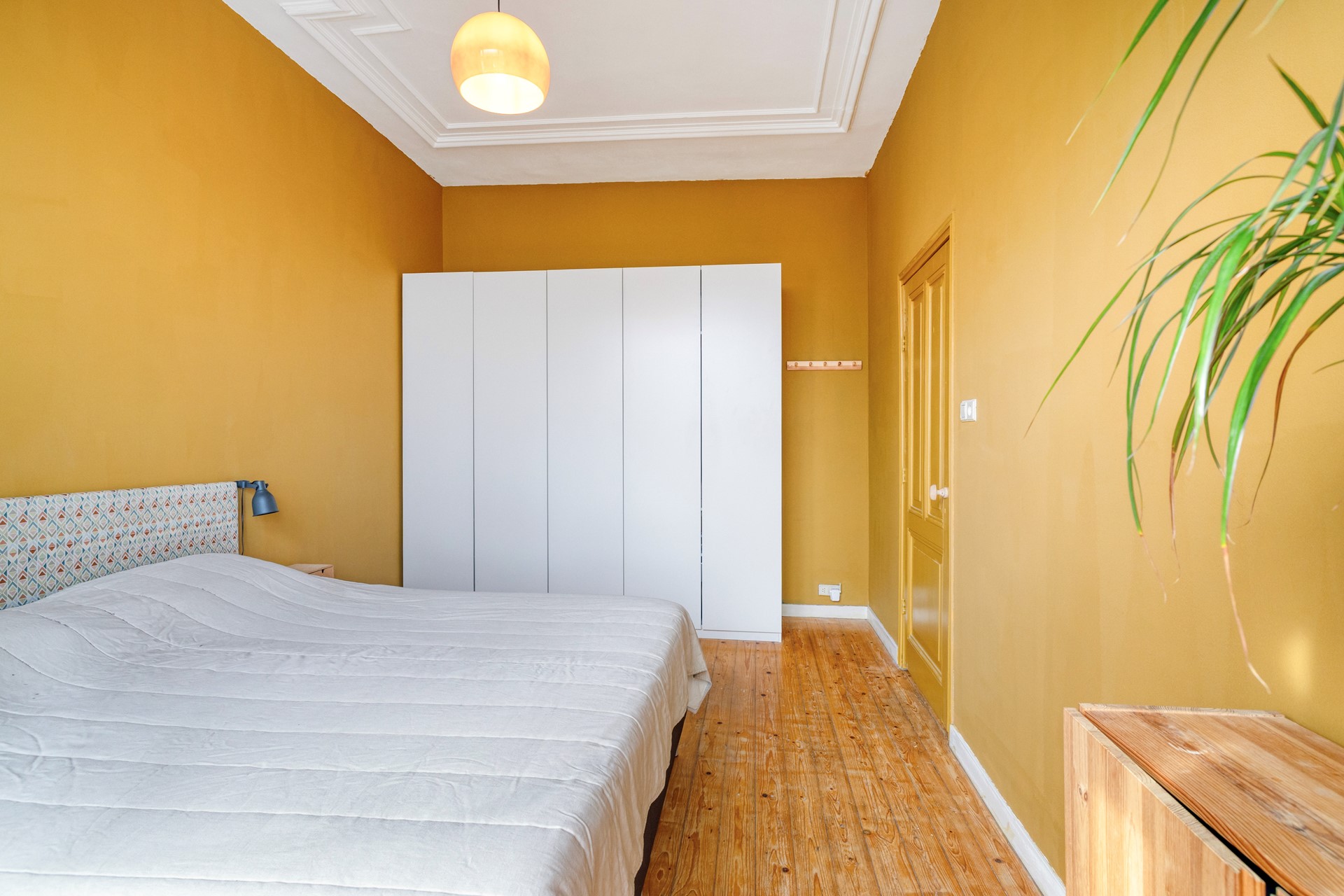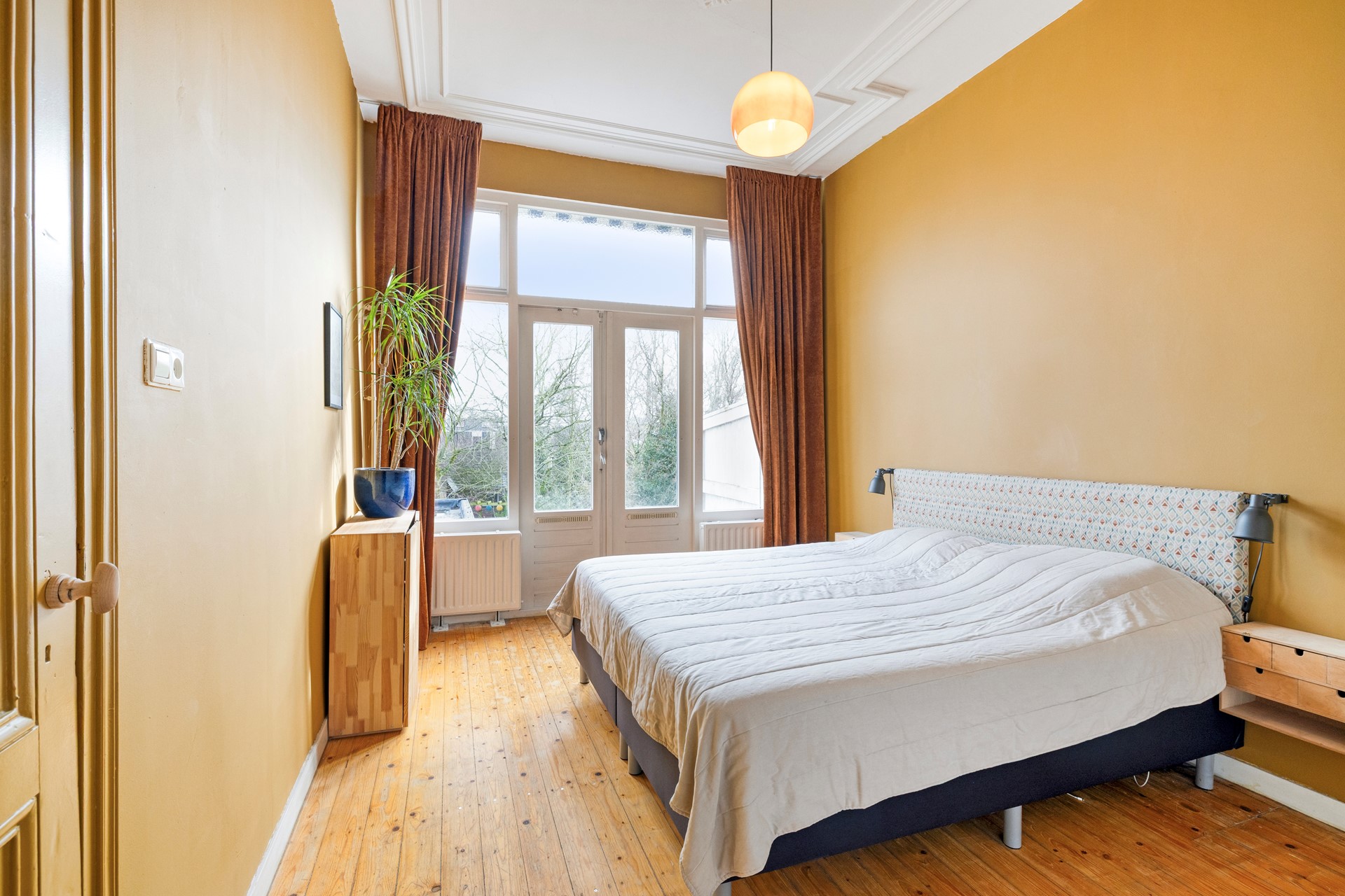 Slaapkamer 1 is afgewerkt met een houten vloer, gestucte wanden en een gestuct plafond met sierlijke lijsten. De slaapkamer geeft toegang tot een dakterras middels openslaande deuren.