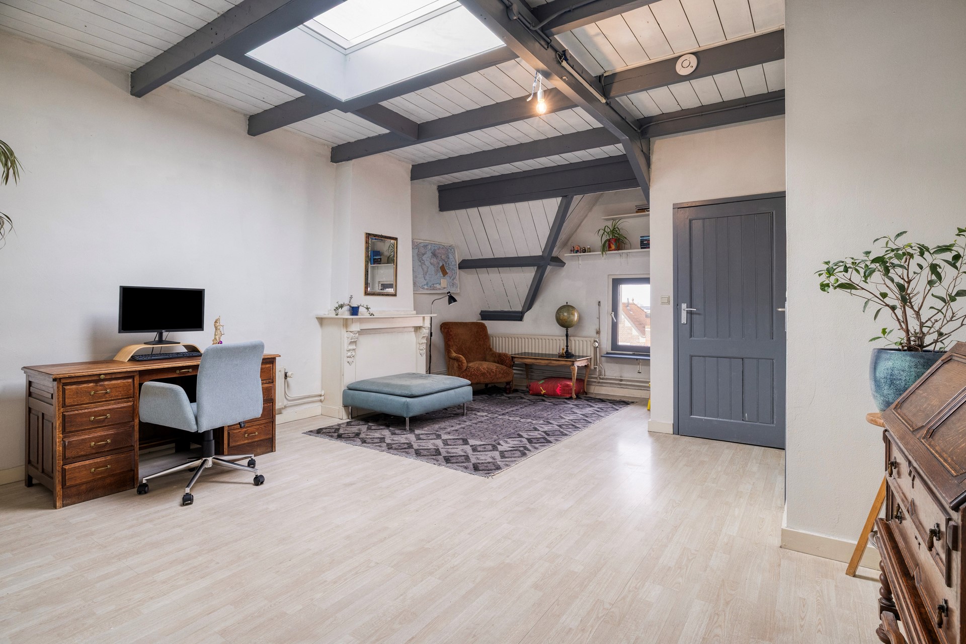 Slaapkamer 3 is afgewerkt met een laminaatvloer, gestucte wanden een houten balken plafond. De slaapkamer biedt toegang tot de 4e slaapkamer, een berging en de technische ruimte voorzien van de CV-Ketel (Remeha, 2019)