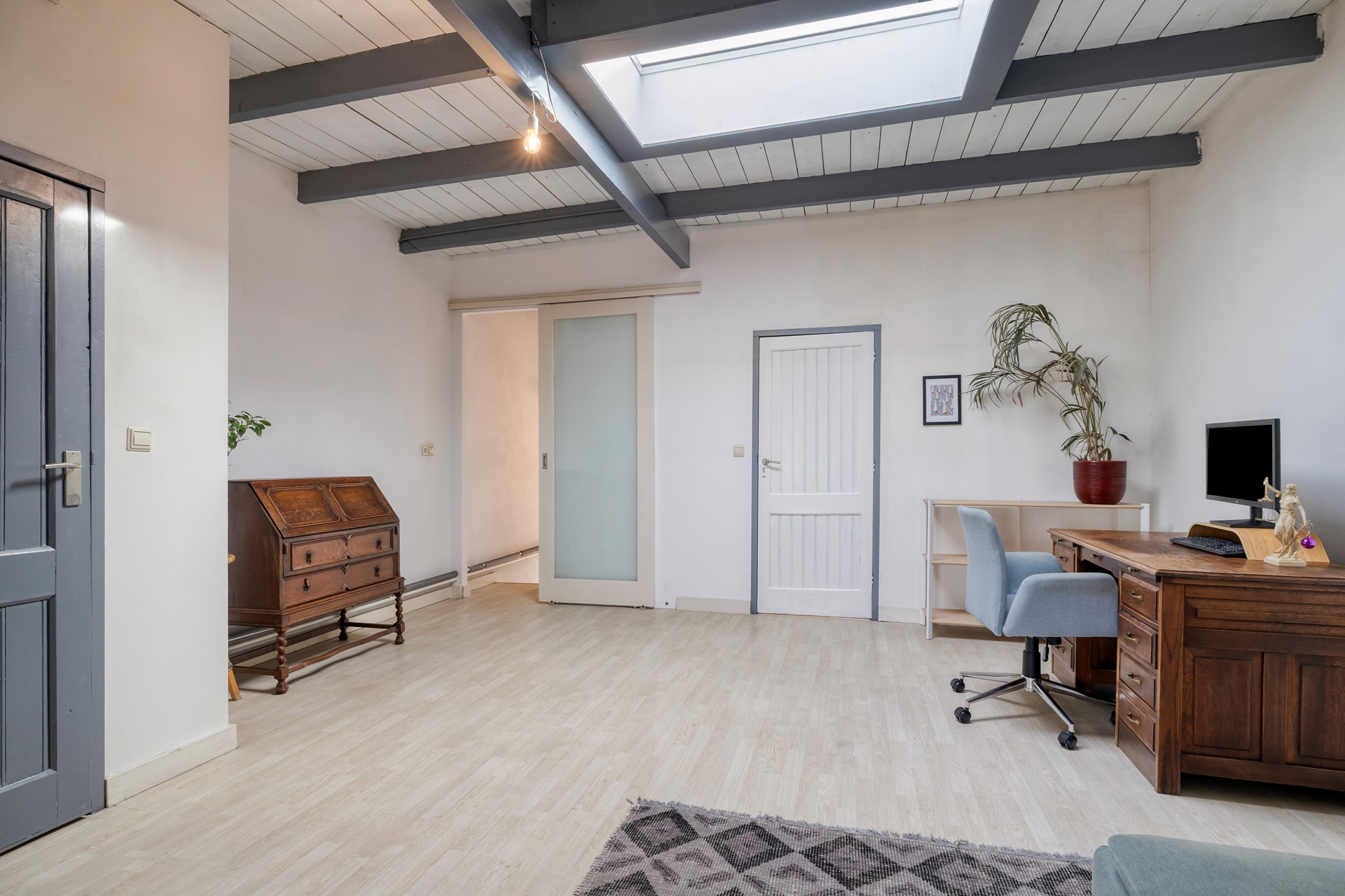 Slaapkamer 4 is afgewerkt met een laminaat vloer, gestucte wanden en een houten balken plafond.