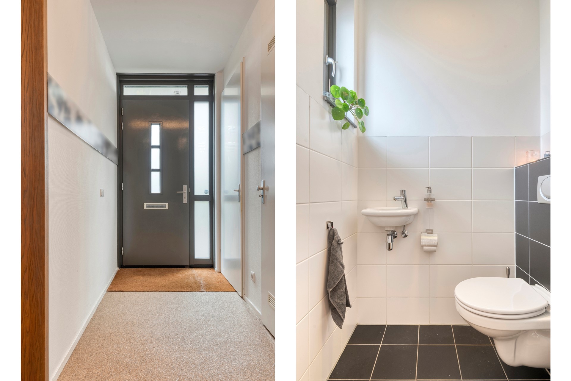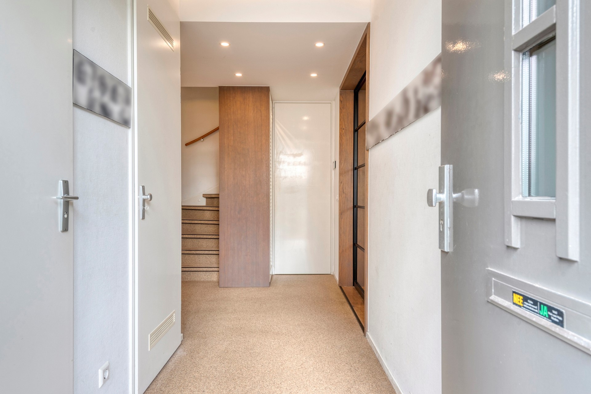De hal/entree is afgewerkt met steentapijt vloer, deels stucwerk wanden en plafond. De hal biedt toegang tot de woonkamer, keuken, meterkast, toilet en de eerste verdieping middels een vaste trapopgang.