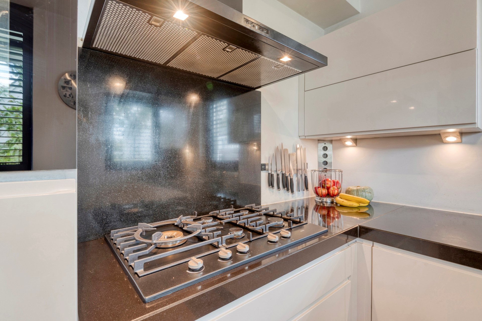 De moderne open keuken is afgewerkt met steentapijt vloer, wanden die geverfd en gestuct zijn en een stucwerkplafond. De in een hoek opgestelde keuken is voorzien van diverse inbouwapparatuur, gasfornuis, koelkast, vaatwasser en hete luchtoven. Hier kunnen jullie met het gezin, familie of vrienden heerlijk samen koken terwijl jullie genieten van een wijntje.