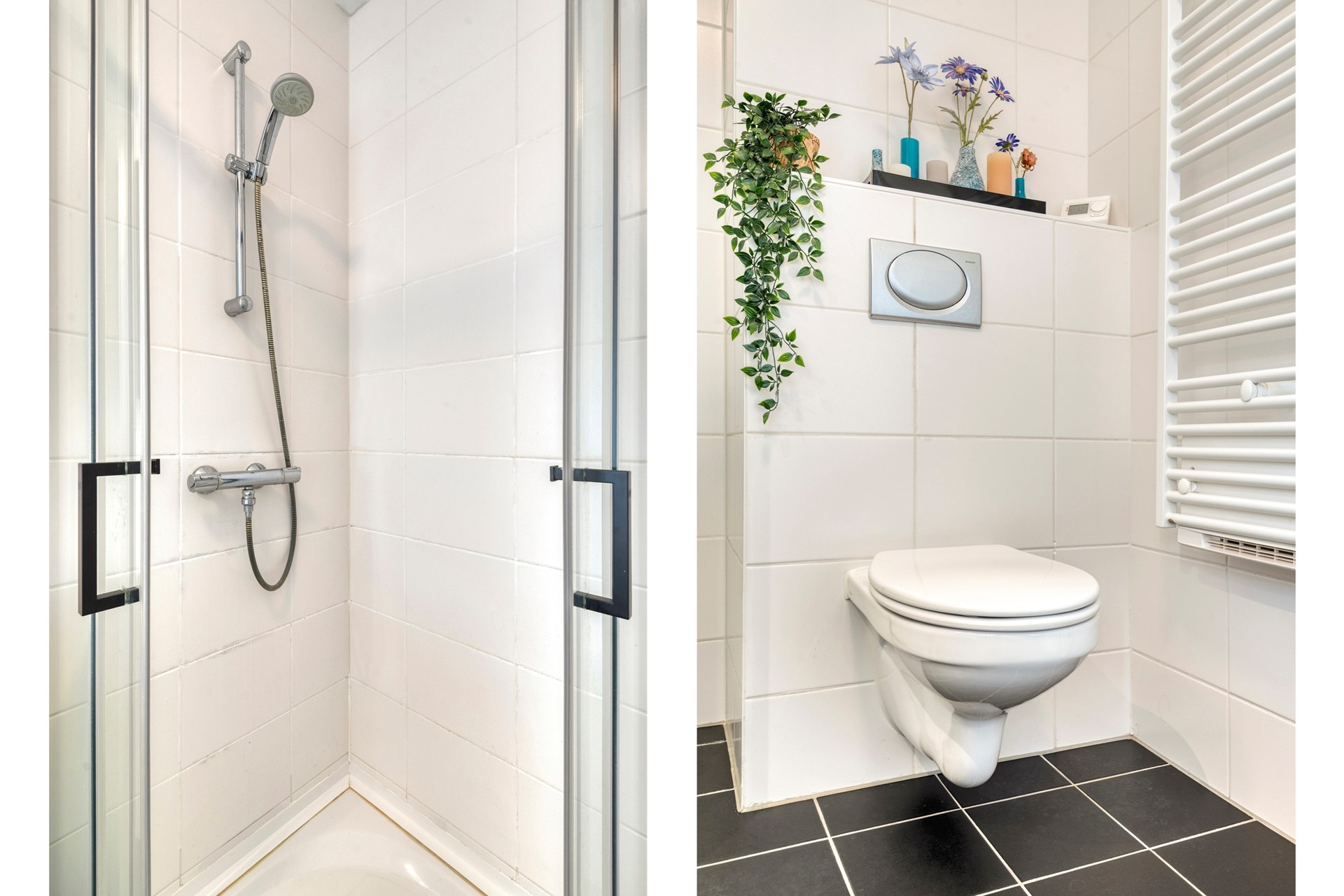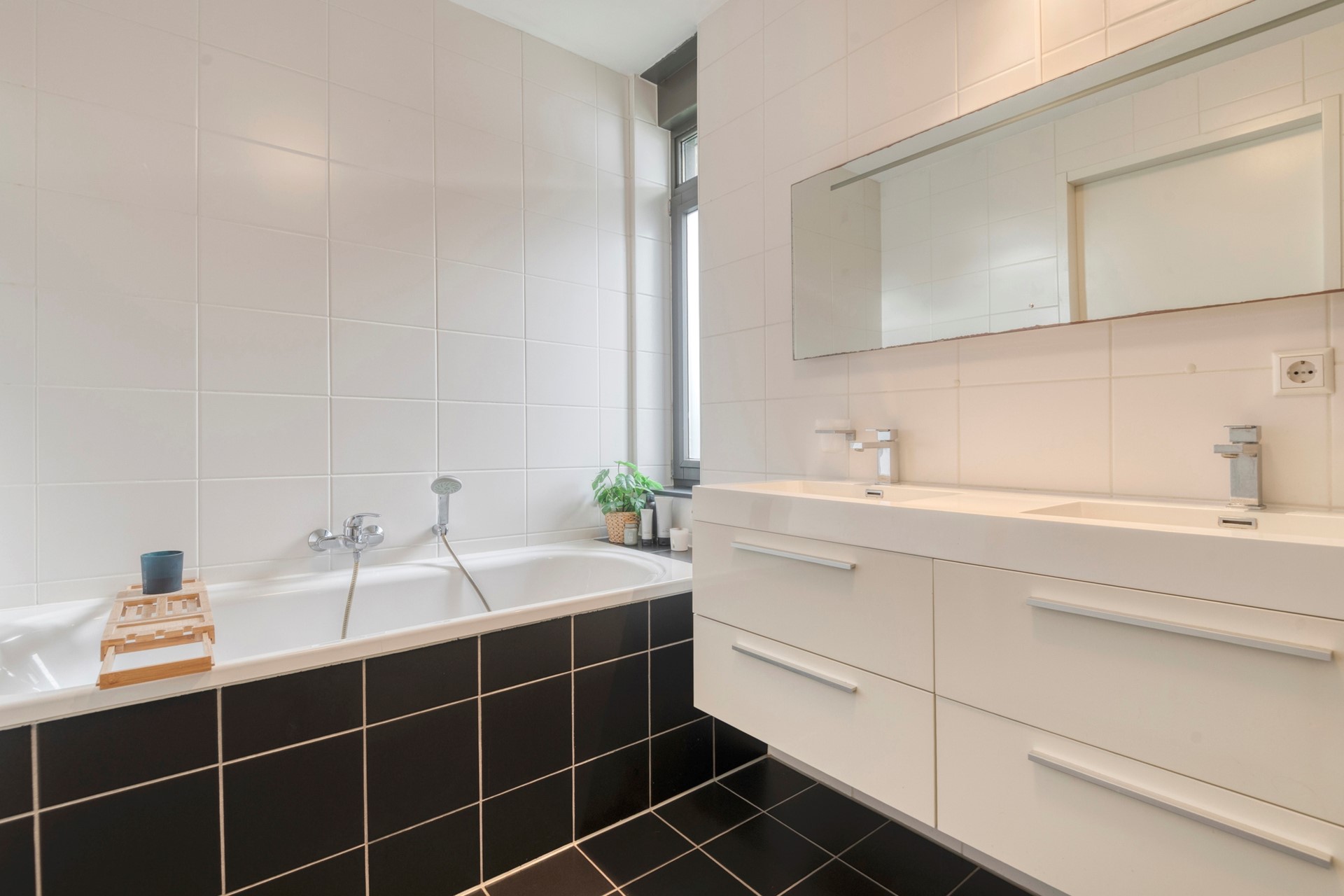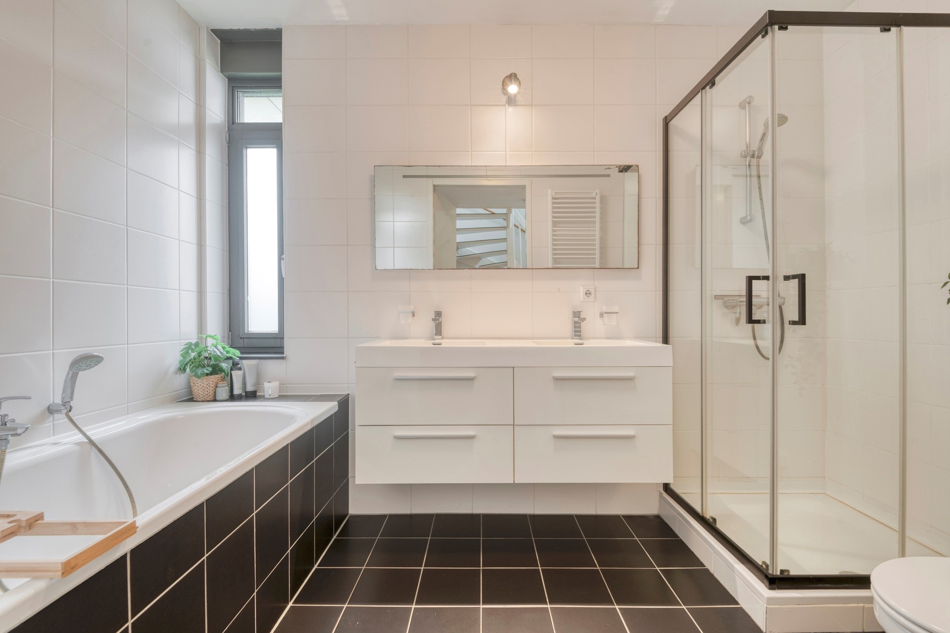 De moderne ruime badkamer is afgewerkt met een betegelde vloer, betegelde wanden en gestuct plafond. De ruime badkamer is voorzien van een ligbad waar jullie lekker in kunnen wegdromen, douche, dubbel wastafelmeubel, 2e toilet, design radiator, natuurlijke en mechanische ventilatie.