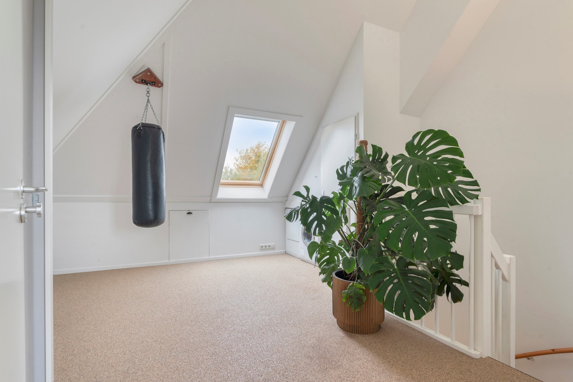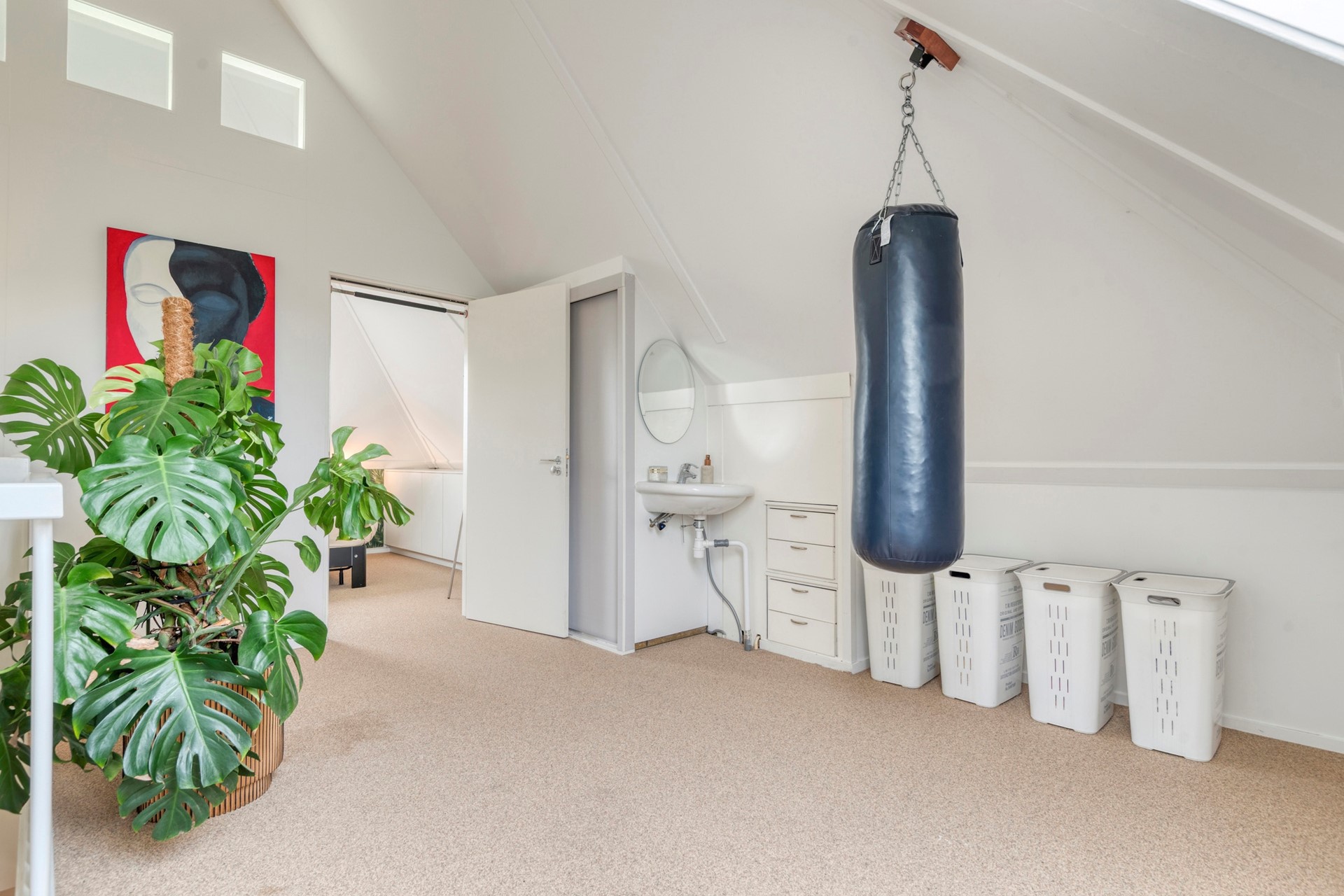 De ideale plek voor een gym aan huis. De voorzolder is afgewerkt met steentapijt vloer, deels gestucte wanden. Hier zijn de wasmachine en droger opgesteld, tevens is hier een wasbak. De voorzolder is ook voorzien van een dakraam en een inbouwkast waar de CV-ketel (Remeha calenta 40c,2019) is opgesteld.