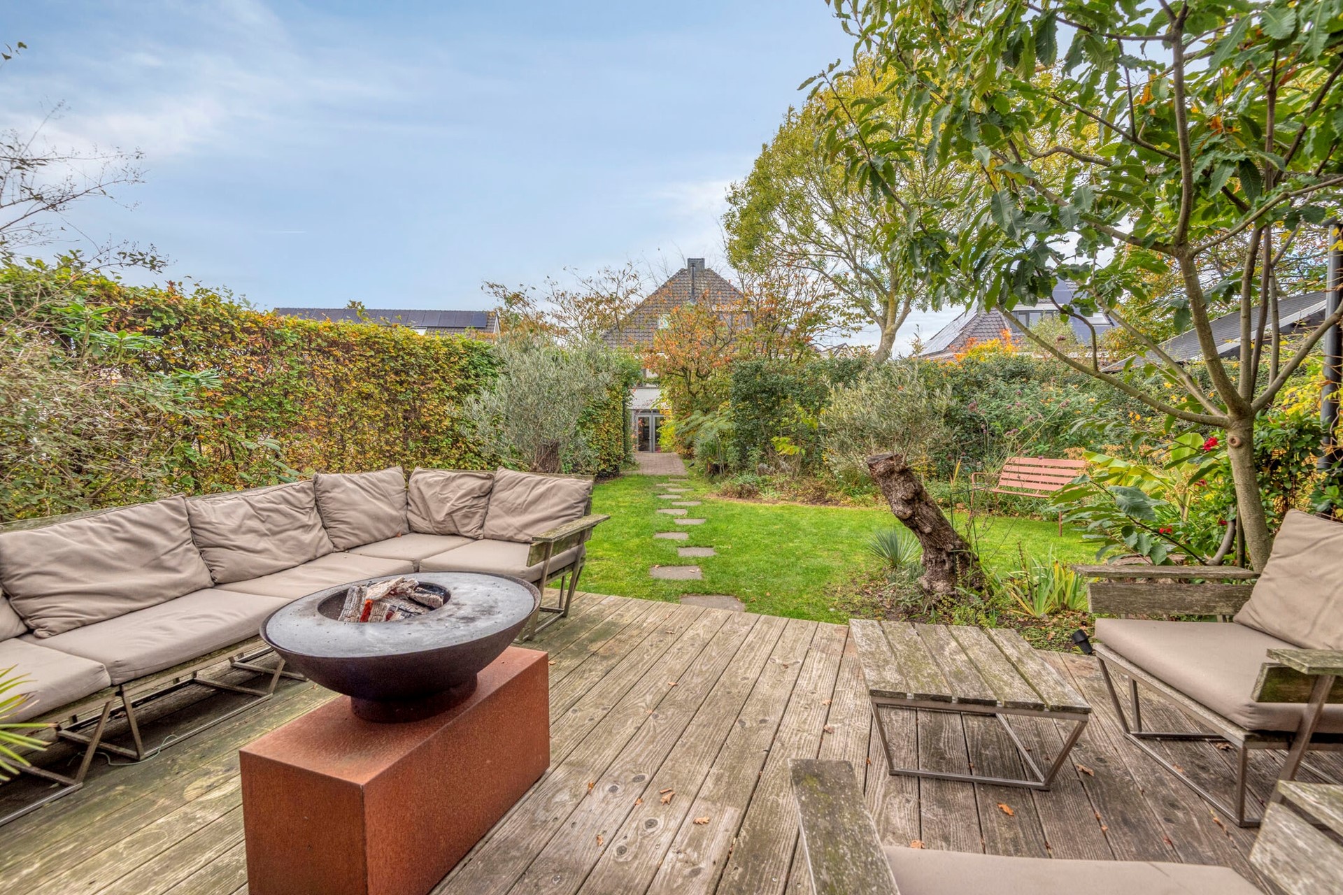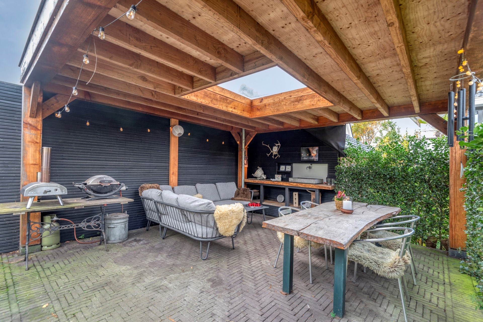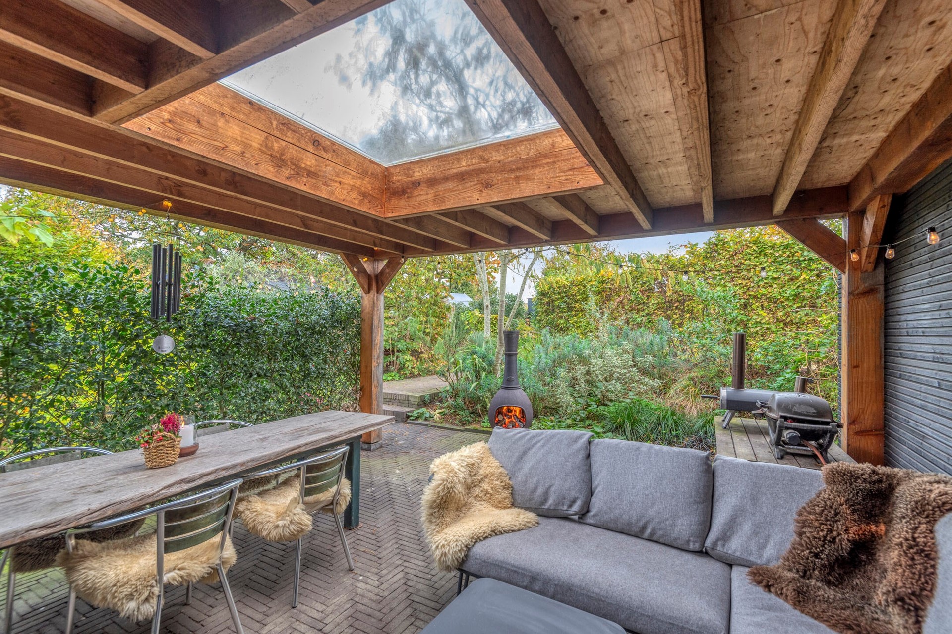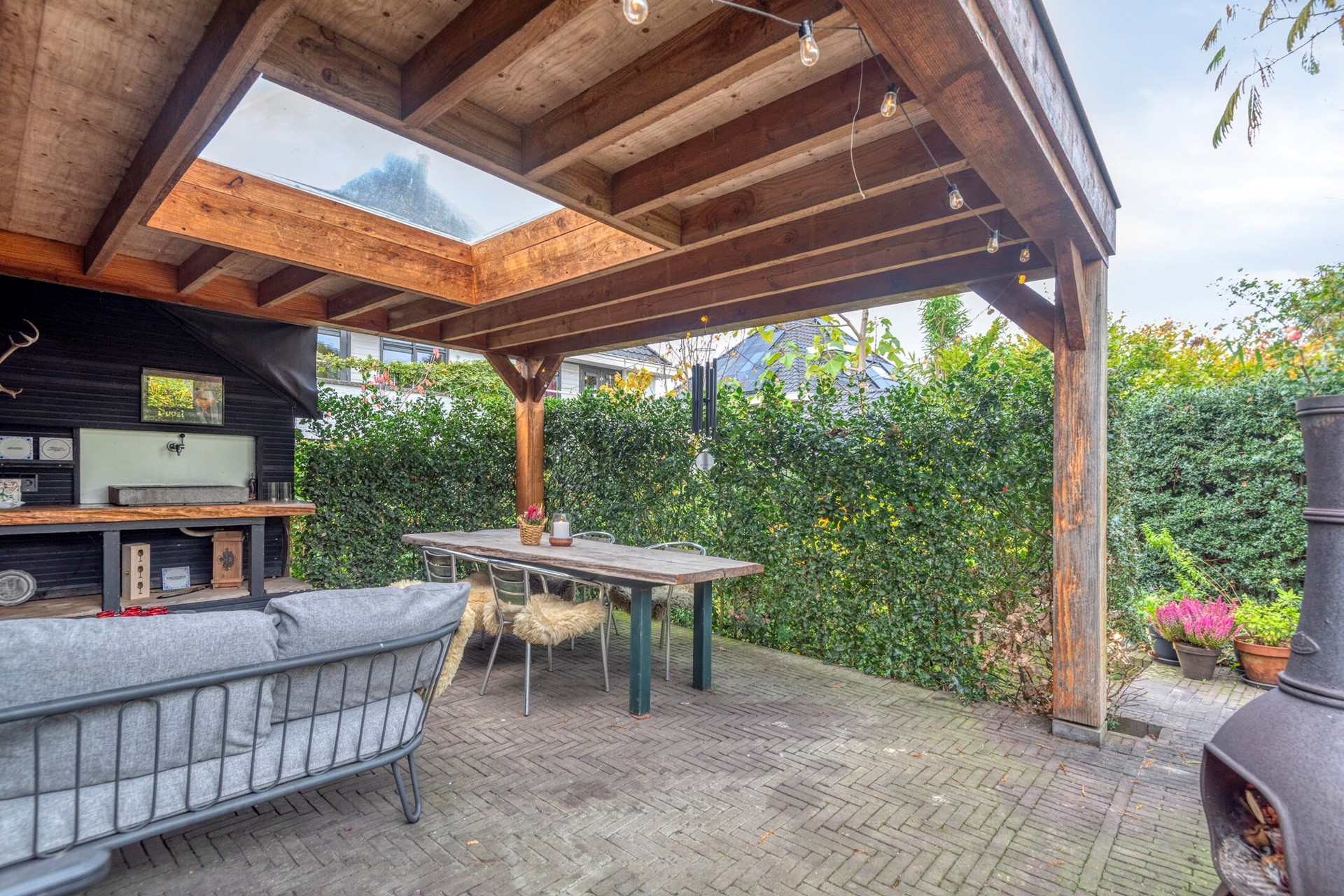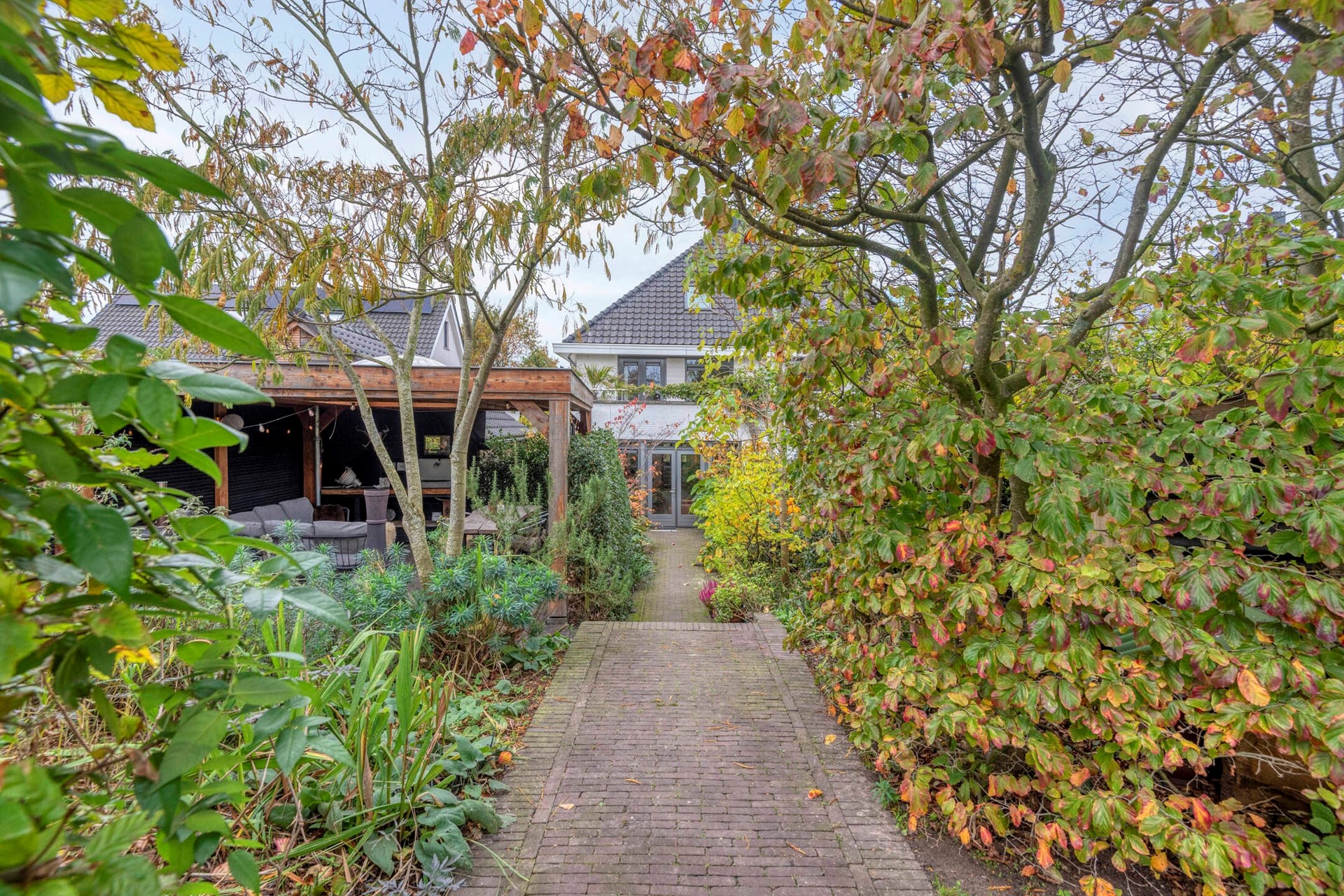 De woning beschikt over een riante voor- en achtertuin. De achtertuin is voorzien van een terras, sierbestrating, gazon en overkapping met verlichting. In deze tuin geniet je het hele jaar door van het buitenleven, ongeacht het weer. Dankzij de ligging en grootte van het perceel kun je optimaal ontspannen met een hapje en een drankje in de zon. De tuin is volledig omheind met een combinatie van houten panelen, hekwerk en een groene haag, wat zorgt voor privacy en een prettige, groene uitstraling.