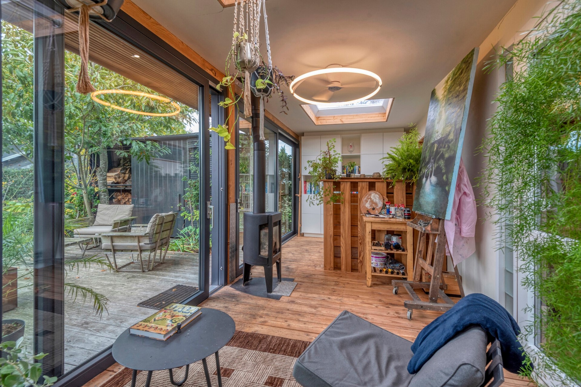 Het moderne atelier biedt talloze mogelijkheden. Gebruik het als rustige werkplek, creatieve studio of gezellige hobbyruimte – midden in het groen, maar met alle comfort van thuis. Dankzij de ligging in de tuin geniet u hier van privacy én inspiratie.
