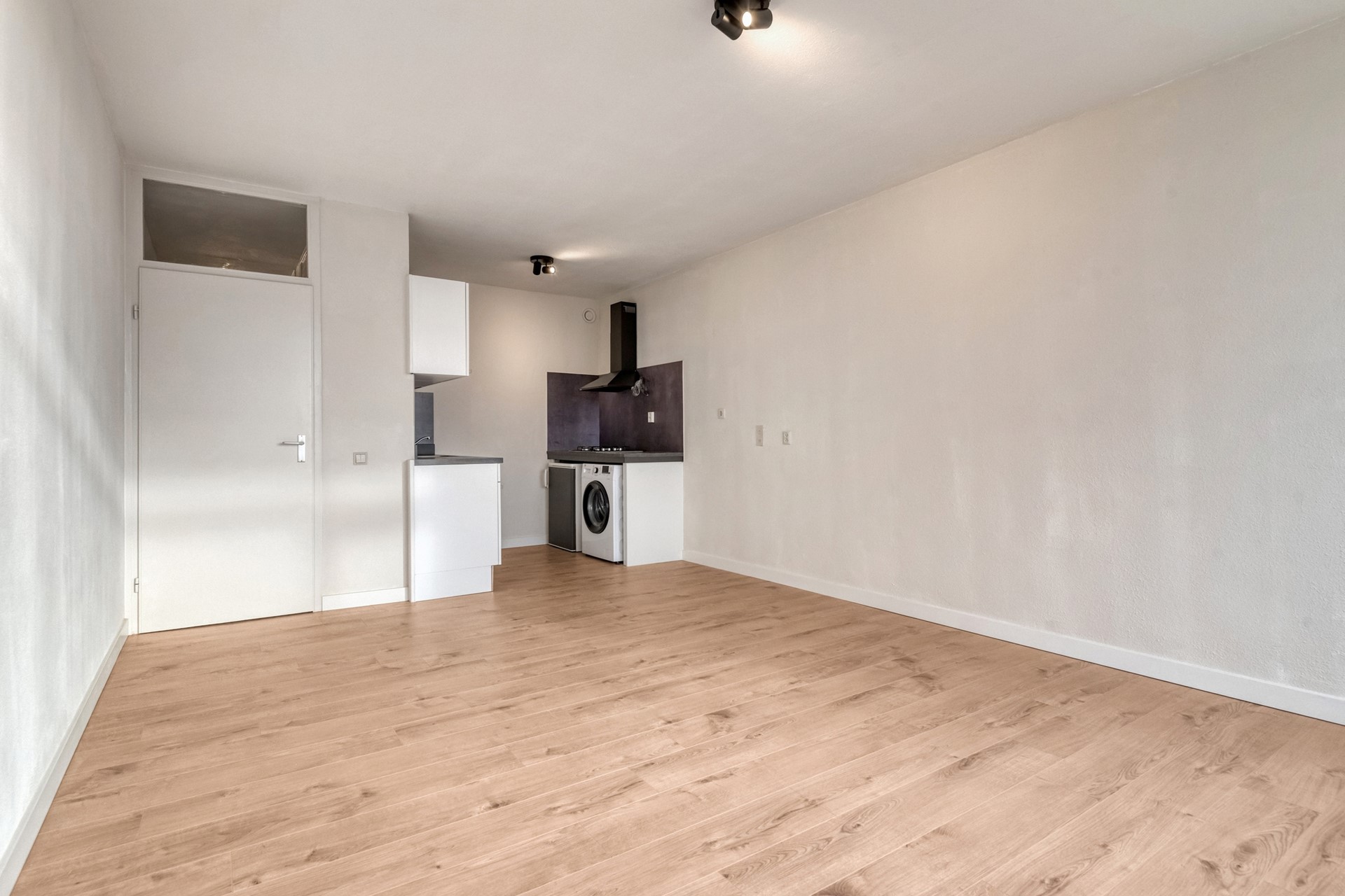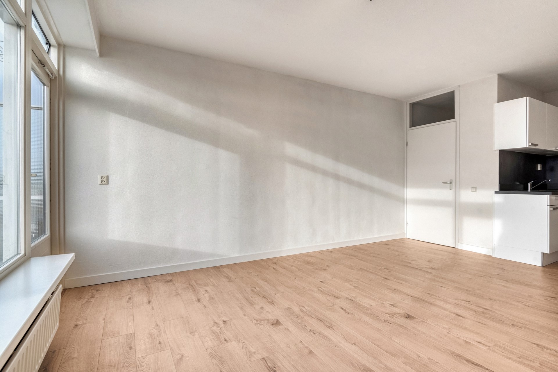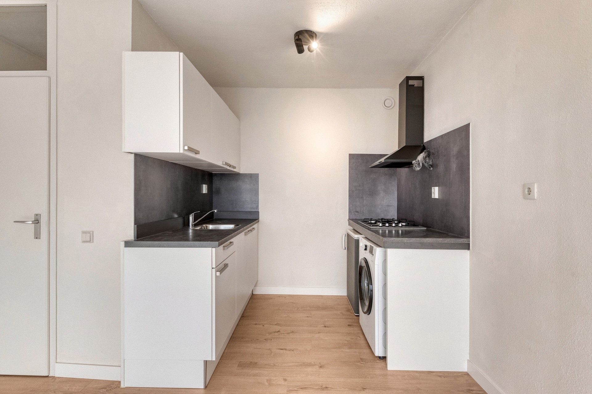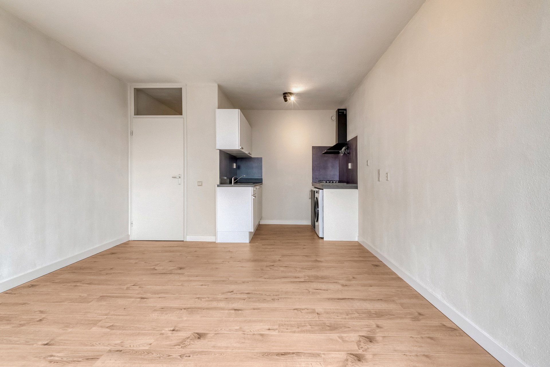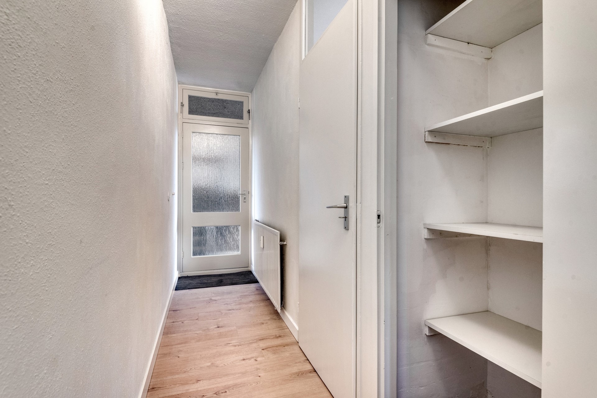 De lift brengt je naar de vierde verdieping en bijna voor de ingang van het appartement. De entree is afgewerkt met een laminaat vloer (2025), gesauste wanden en een spuitwerk plafond. De hal biedt toegang tot de living met open keuken, provisieruimte, slaapkamer en badkamer.