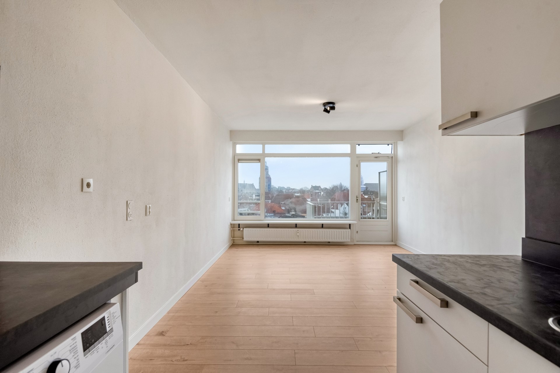 De living bestaat uit een lichte woonkamer en een open keuken. Vanuit de woonkamer geniet je van een uniek uitzicht over Bergen op Zoom (en natuurlijk de Peperbus). De woonkamer is afgewerkt met een laminaat vloer (2025), gesauste wanden en een spuitwerk plafond. De woonkamer biedt toegang tot het balkon.