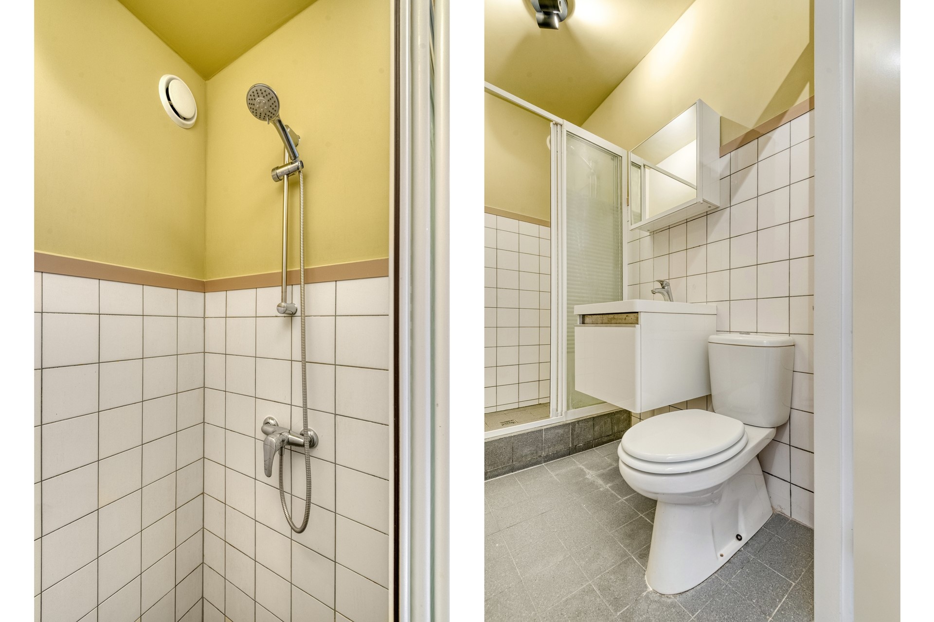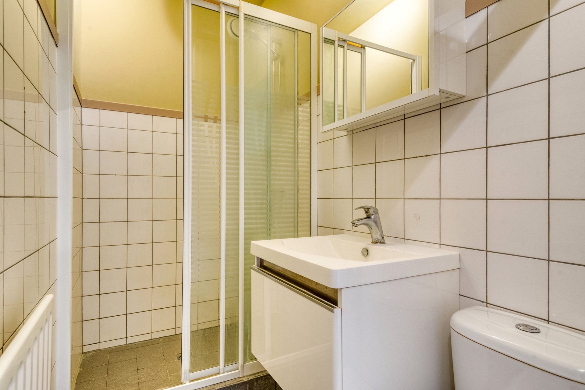 De badkamer is afgewerkt met een betegelde vloer, deels betegeld en deels gesauste wanden en een gesaust plafond. De badkamer is voorzien van een douche, wastafelmeubel, toilet en mechanische ventilatie.