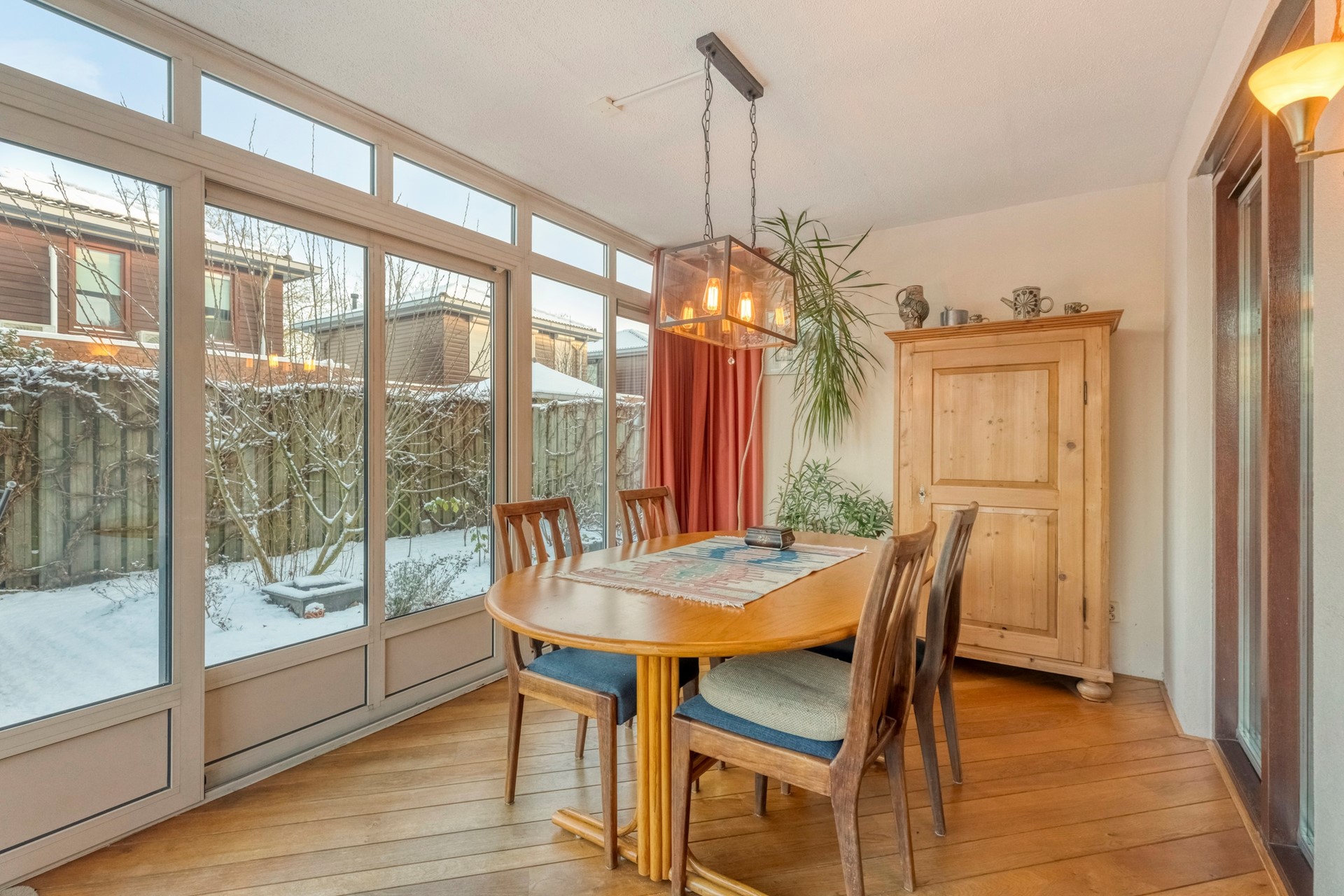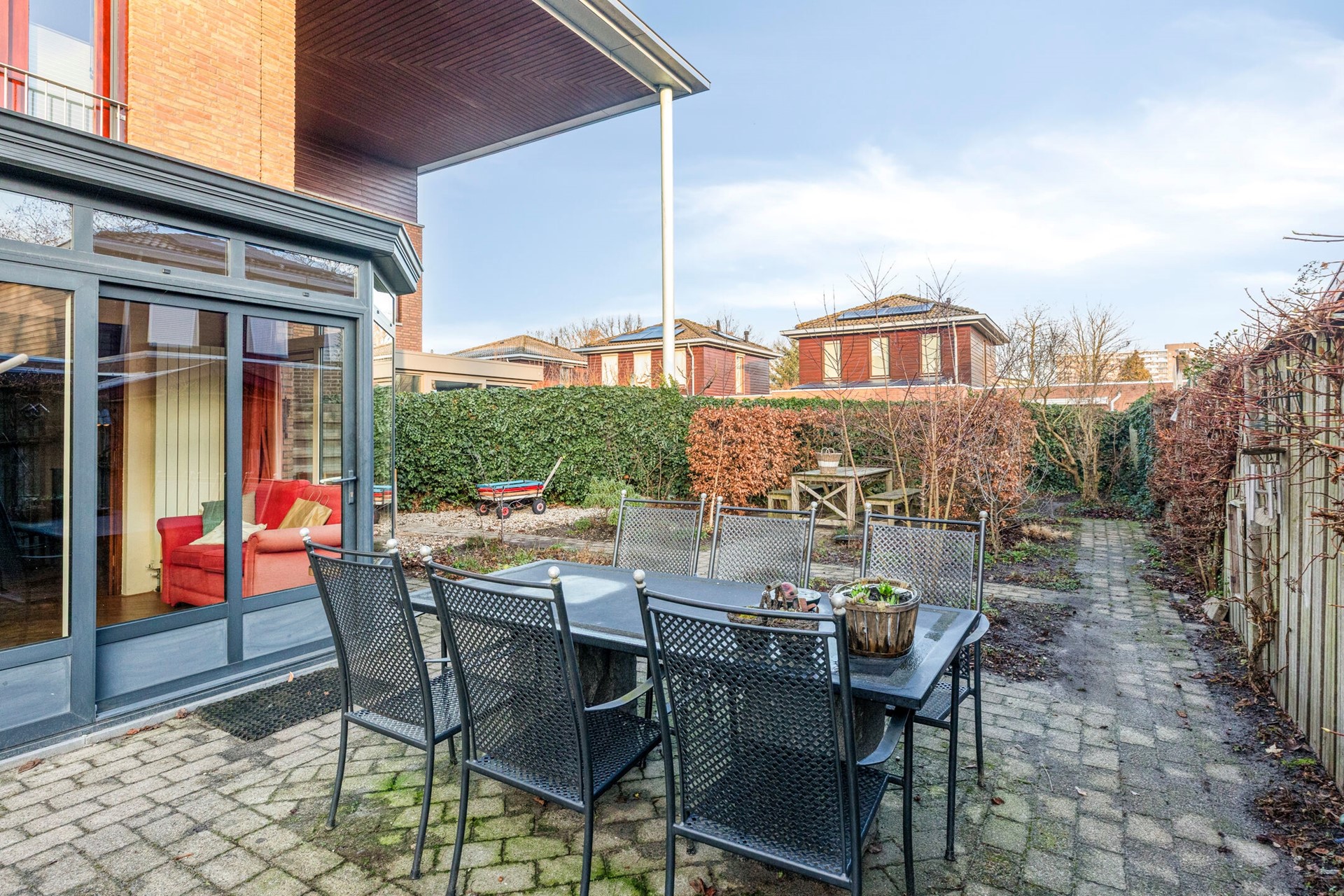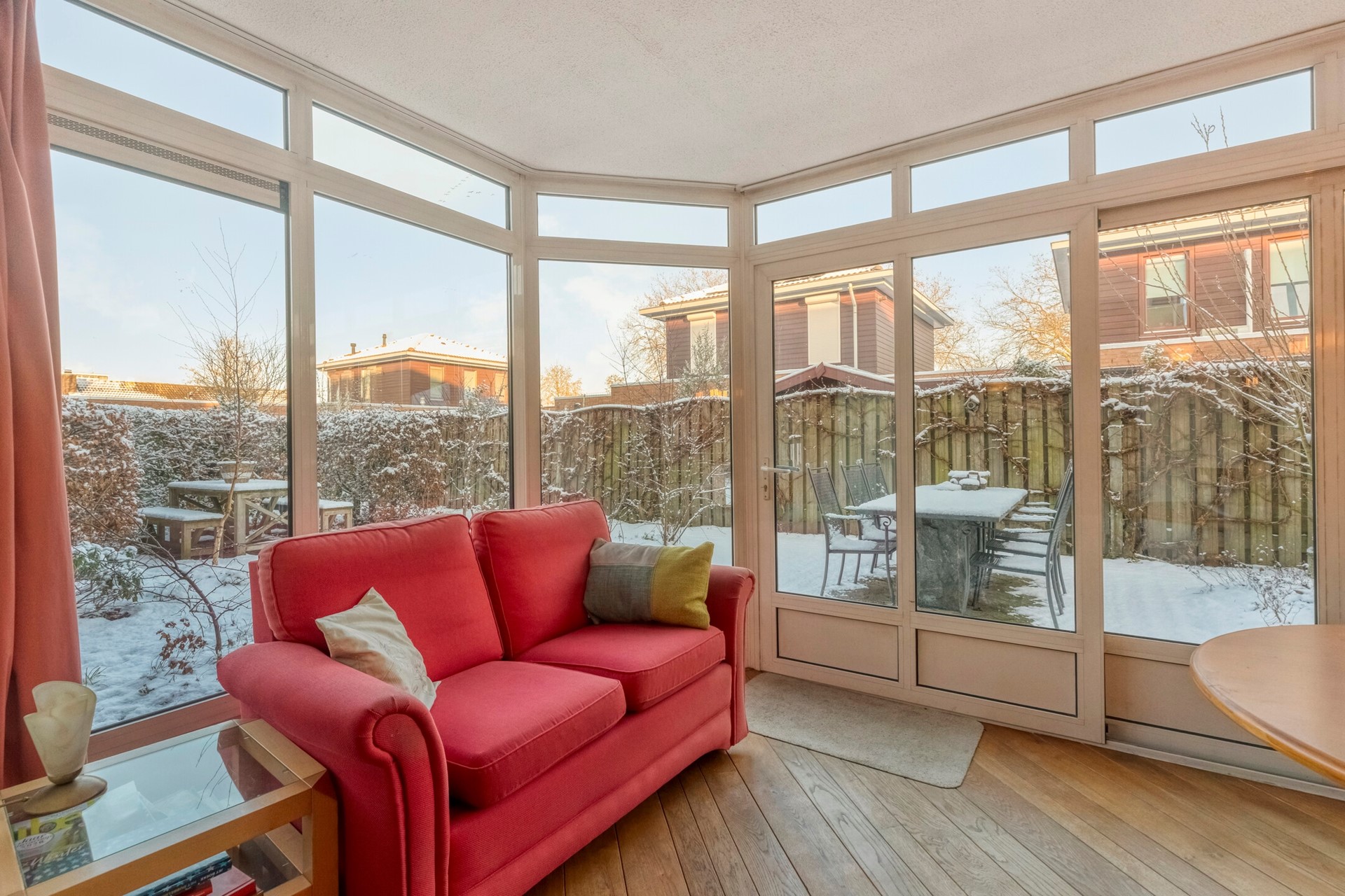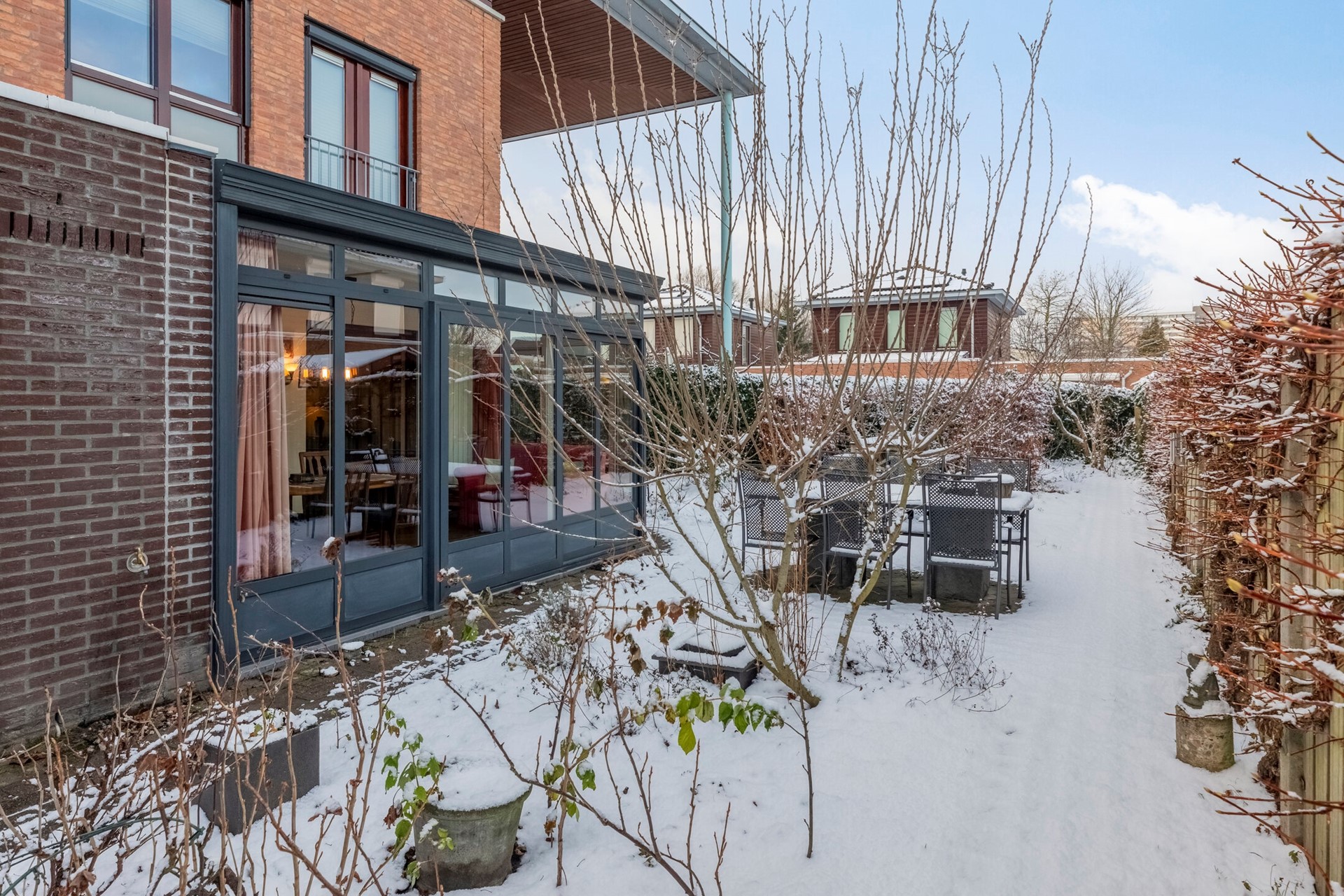 De serre geeft een prachtig uitzicht over de tuin. Dit is een plek die direct uitnodigt voor gezellige diners en borrels met vrienden en familie.