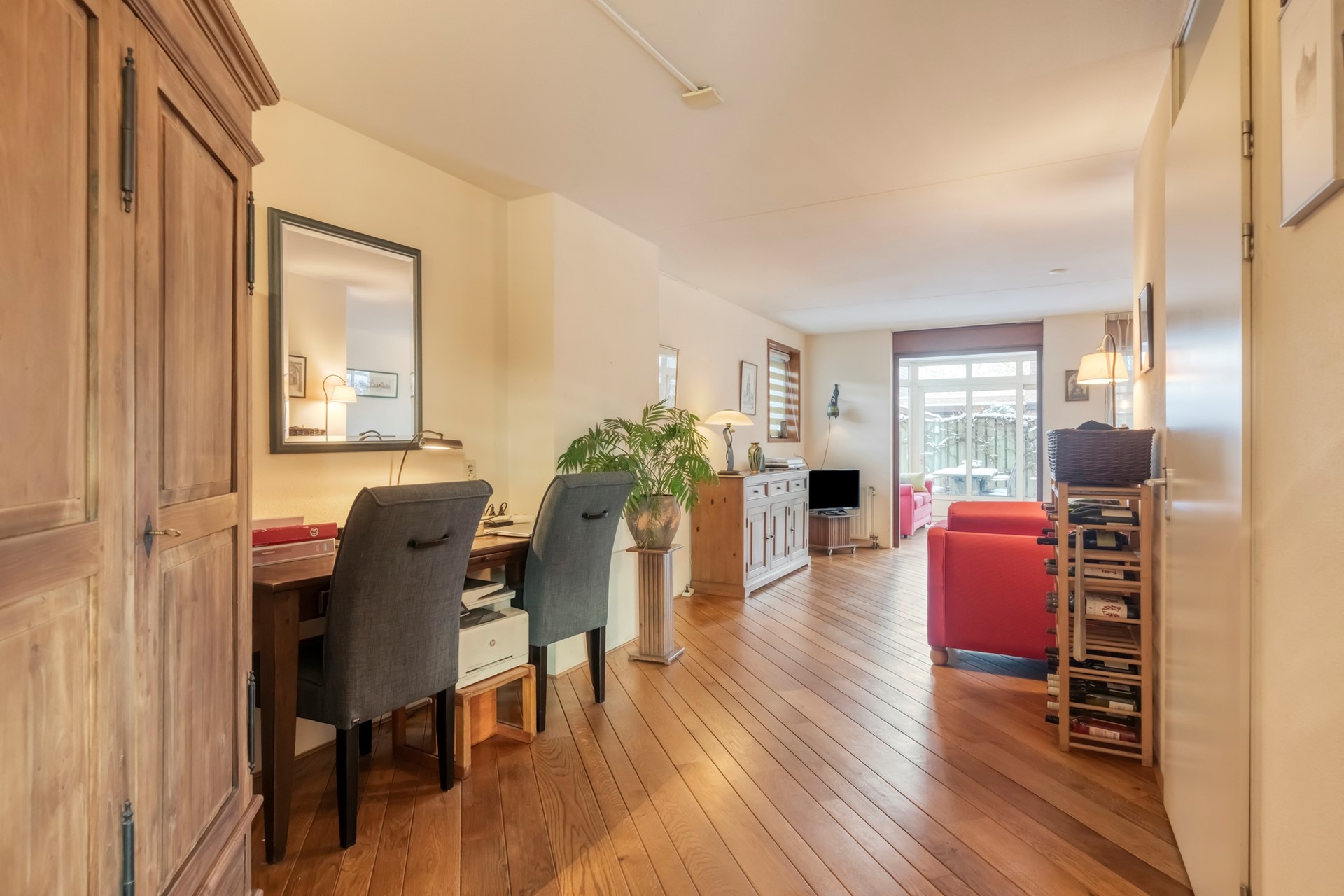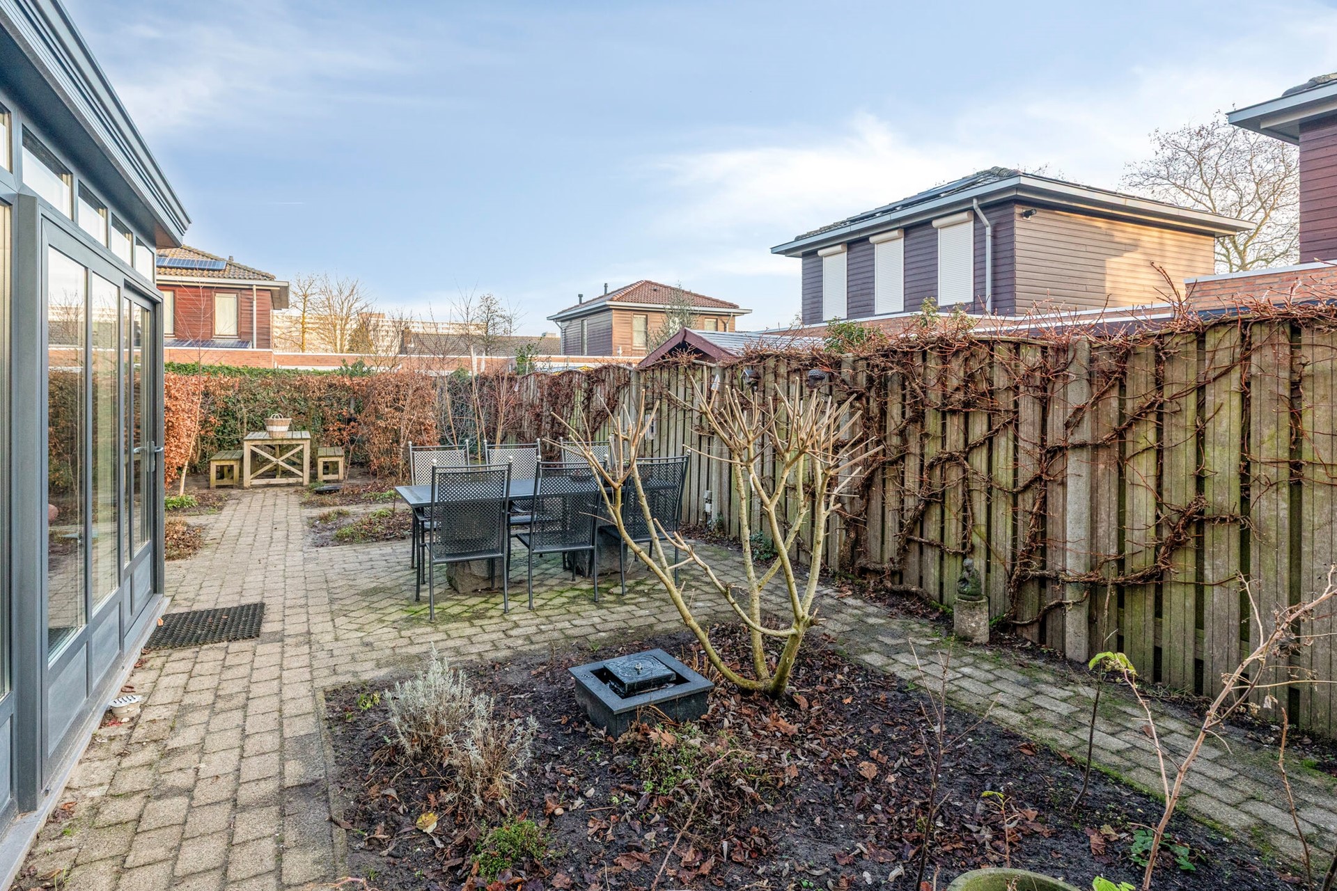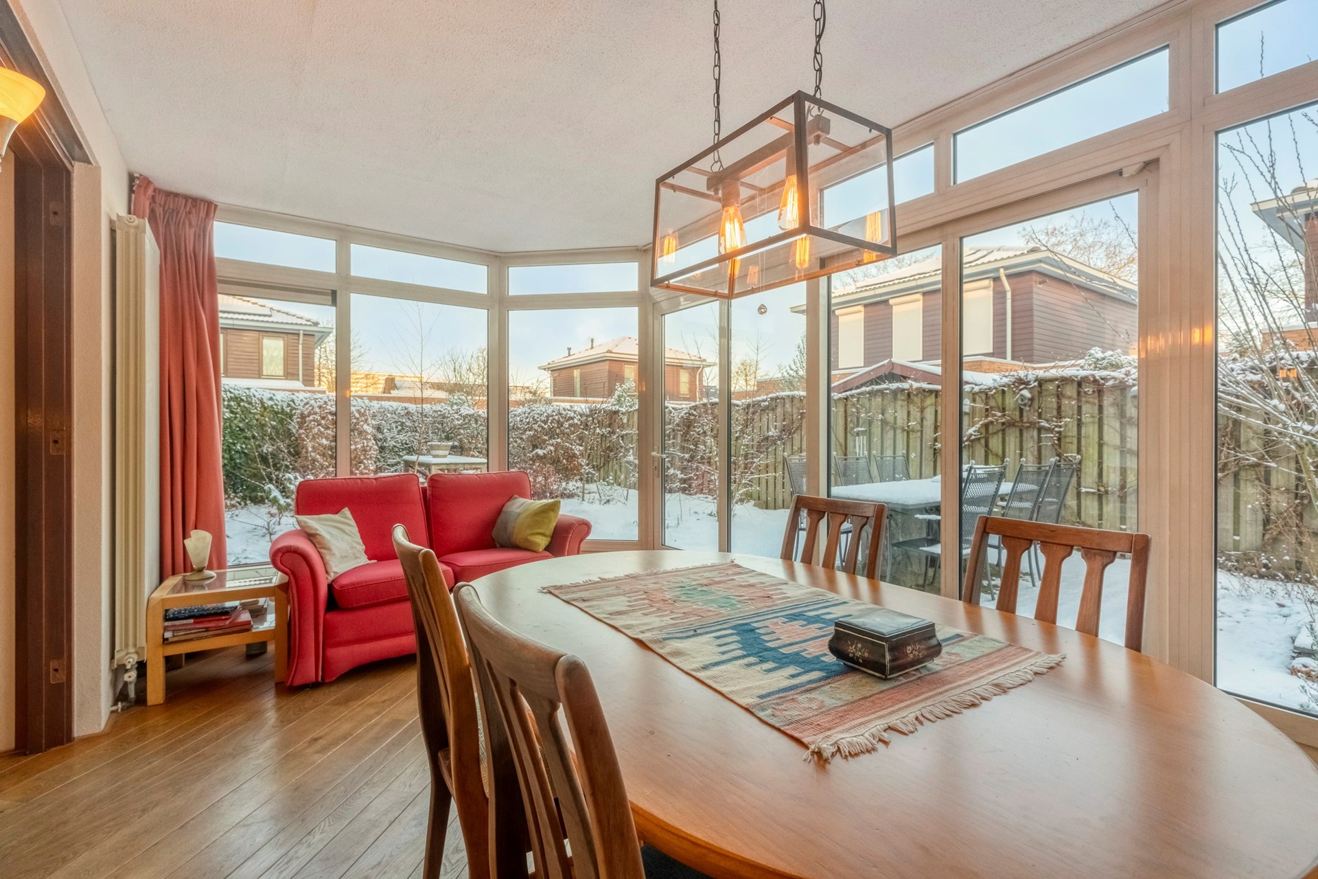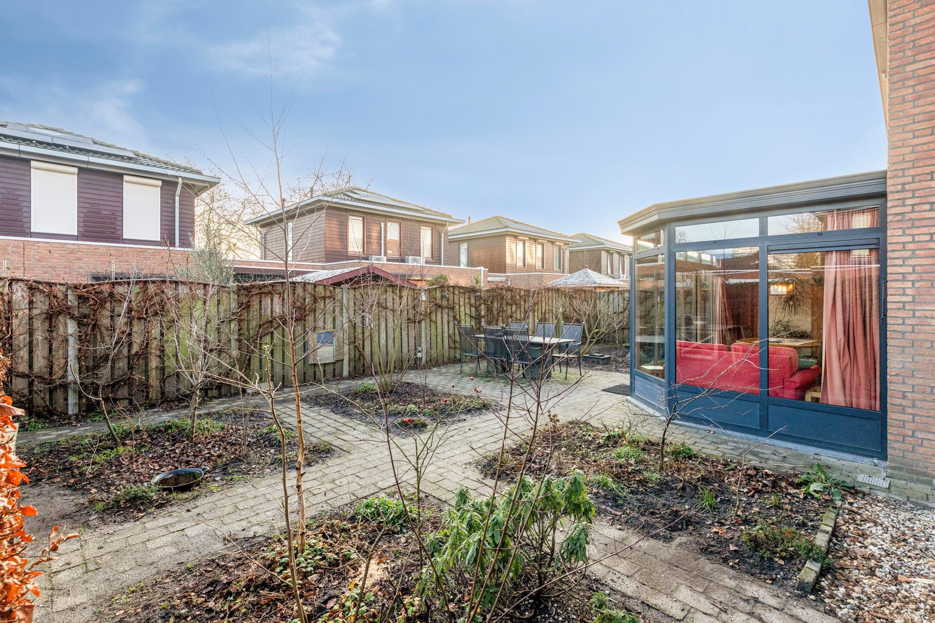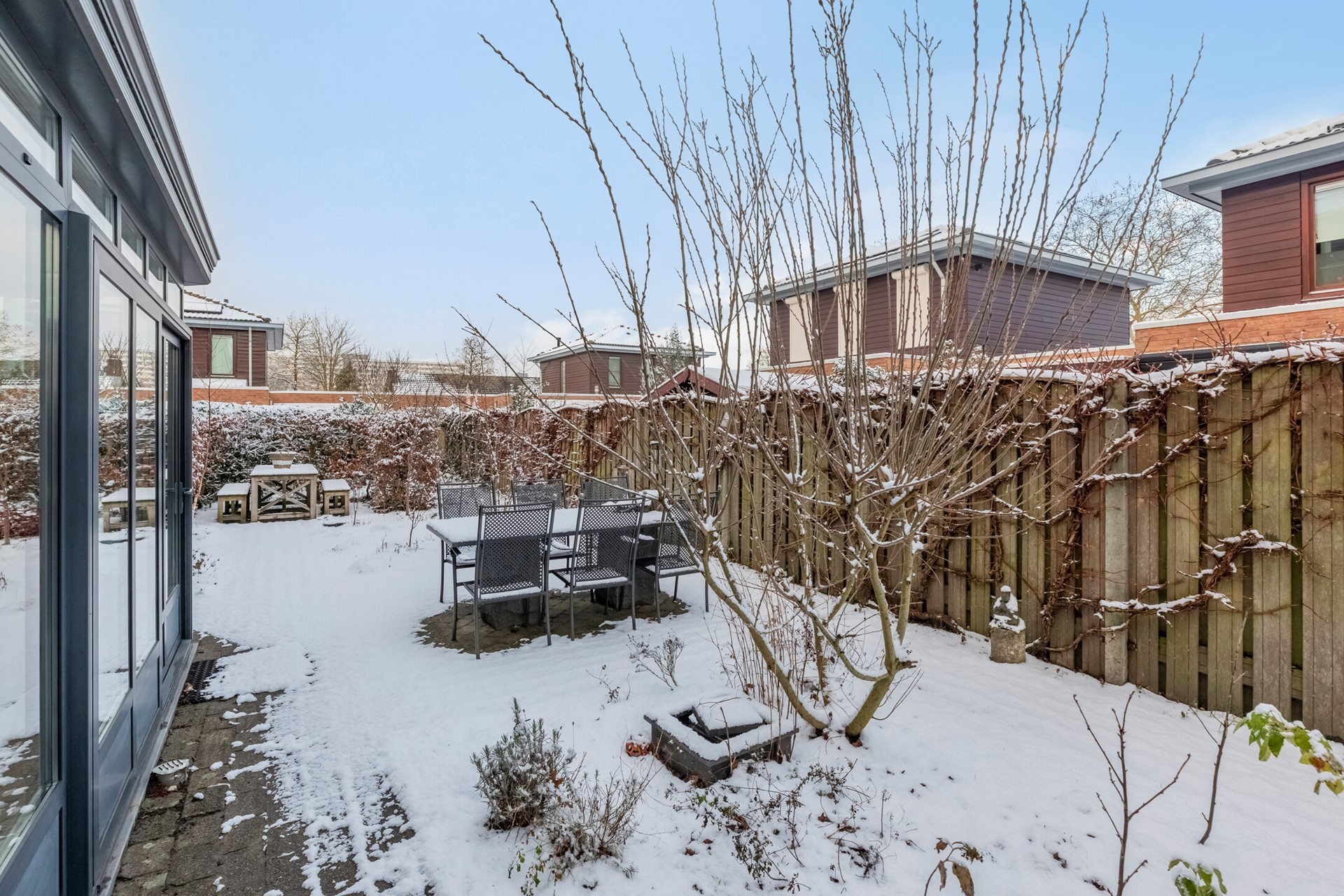 De serre geeft een prachtig uitzicht over de tuin. Dit is een plek die direct uitnodigt voor gezellige diners en borrels met vrienden en familie.