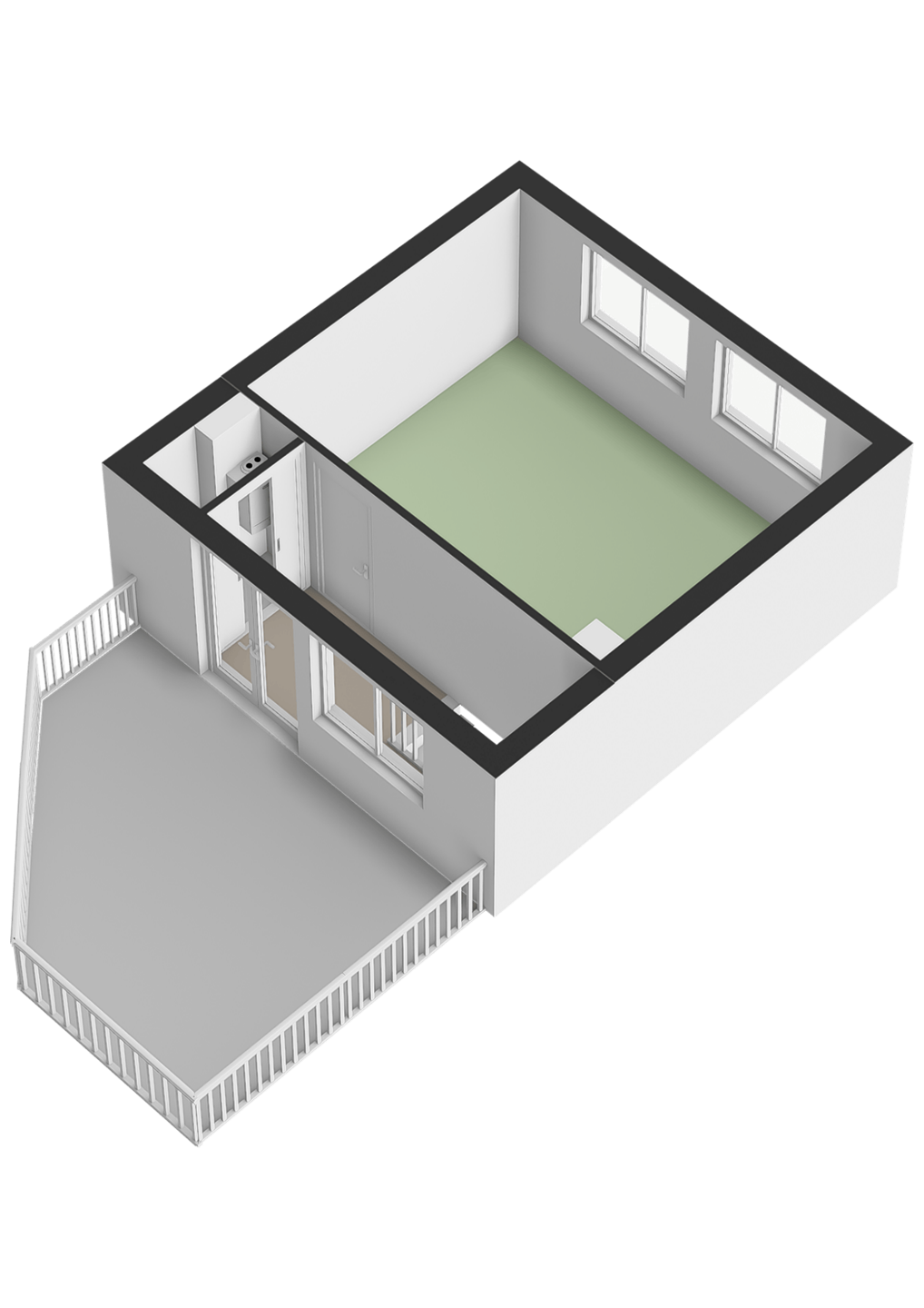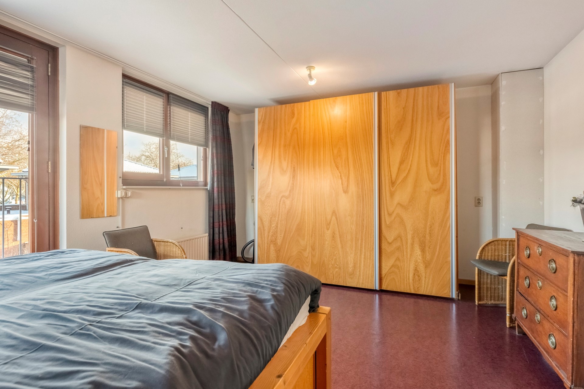 Slaapkamer 3 is afgewerkt met een zeilvloer, spachtelputz wanden en een spuitwerk plafond. De slaapkamer is voorzien van elektrisch bedienbare zonwering.