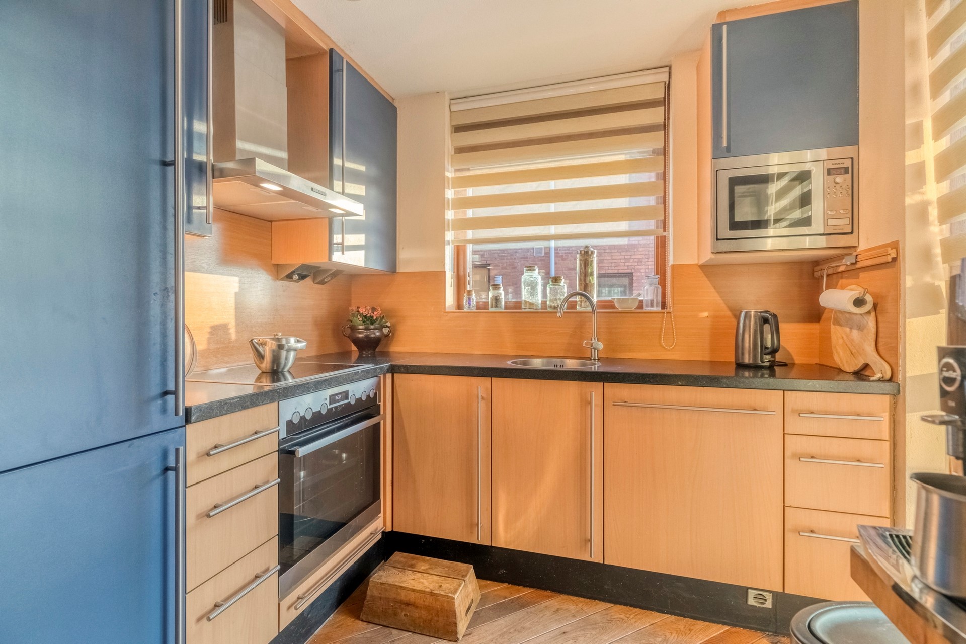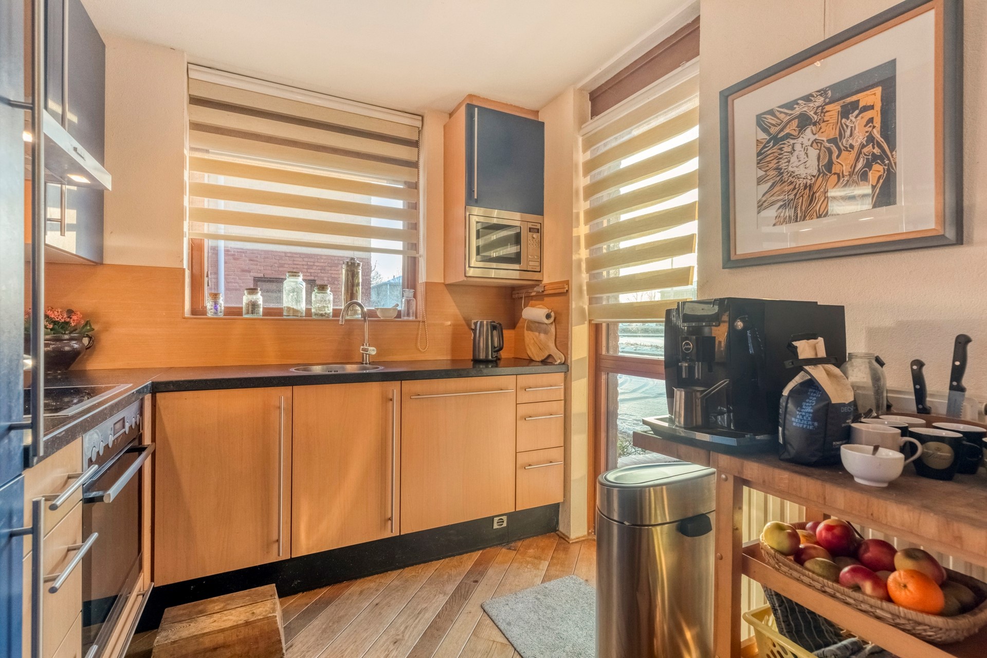 De keuken is de perfecte plek om heerlijke gerechten te bereiden! De keuken is afgewerkt met een houten vloer, spachtelputz wanden en een spuitwerk plafond. De in hoek opgestelde keukeninrichting is voorzien van diverse kastruimte, inductieplaat, afzuigkap, oven, magnetron, vaatwasser, koelkast en een spoelbak.