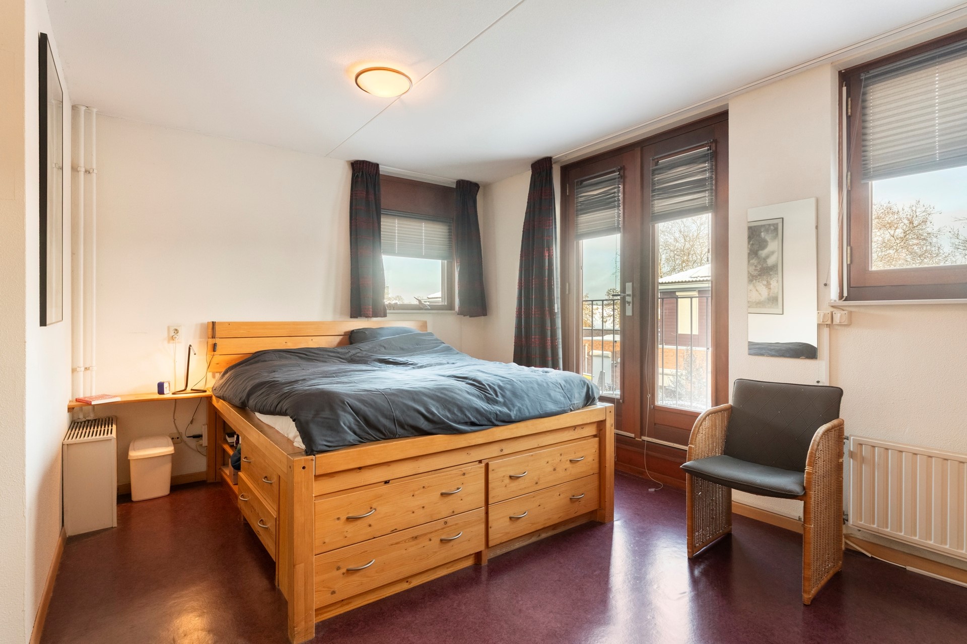 Slaapkamer 1 is afgewerkt met een zeilvloer, spachtelputz wanden en een spuitwerk plafond. De slaapkamer is voorzien van een frans balkon en elektrisch bedienbare zonwering.