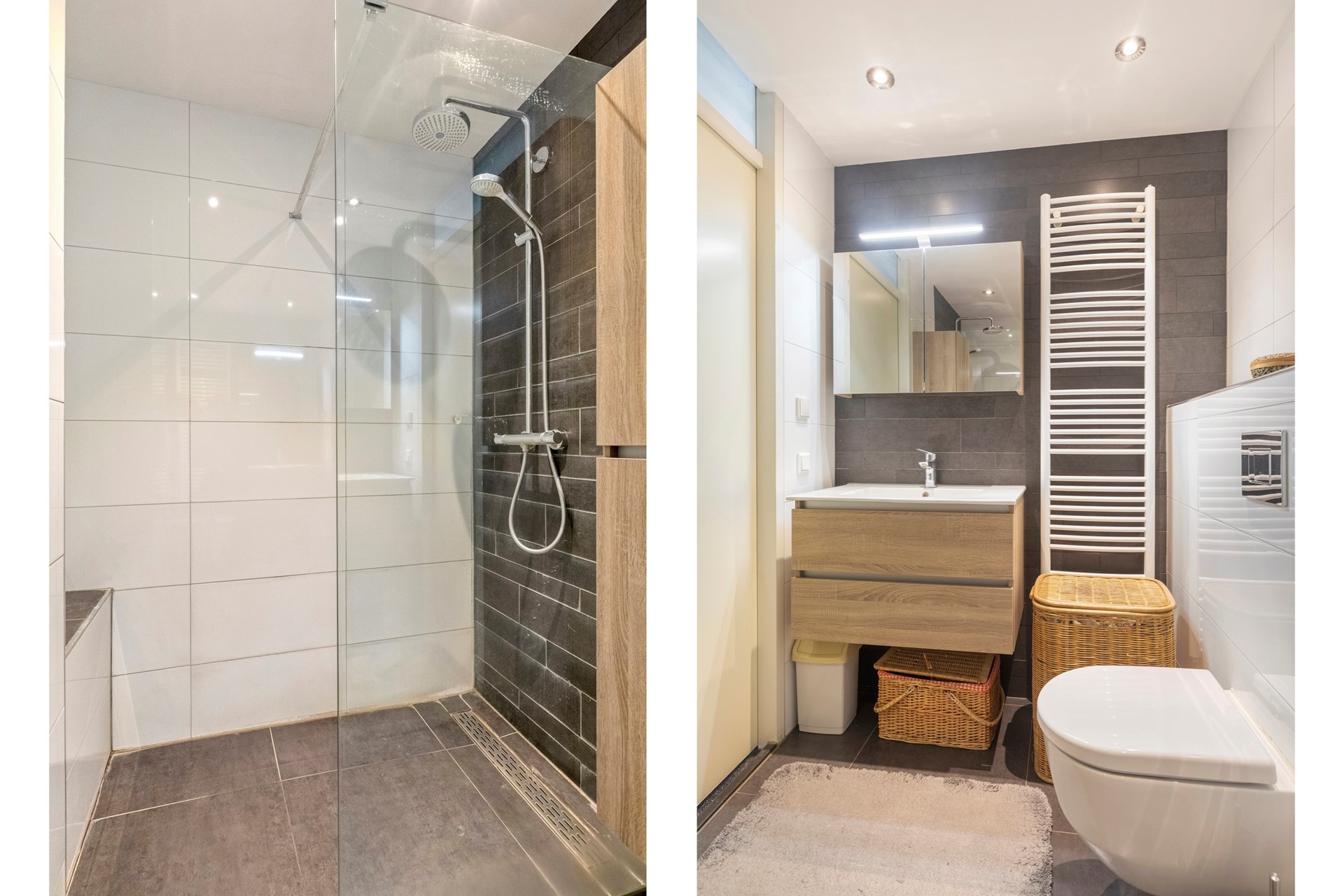 Ontspan na een drukke dag in de moderne badkamer uit 2016. De badkamer is afgewerkt met een betegelde vloer, betegelde wanden en een gestuct plafond met inbouwverlichting. De badkamer is voorzien van een wastafelmeubel, 2e toilet, inloopdouche, mechanische- en natuurlijke ventilatie en een design radiator.