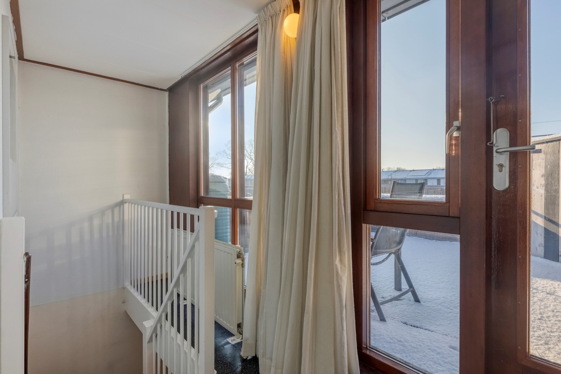 Middels de vaste trap op de eerste verdieping bereiken jullie de overloop op de tweede verdieping. De overloop is afgewerkt met een zeilvloer, spachtelputz wanden en een spuitwerk plafond. De overloop biedt toegang tot het dakterras, de derde slaapkamer en kast met CV-Ketel (Nefit, 2016) en aansluiting voor de wasmachine en droger. Voorzien van zonwering handmatig te bedienen vanaf het balkon.