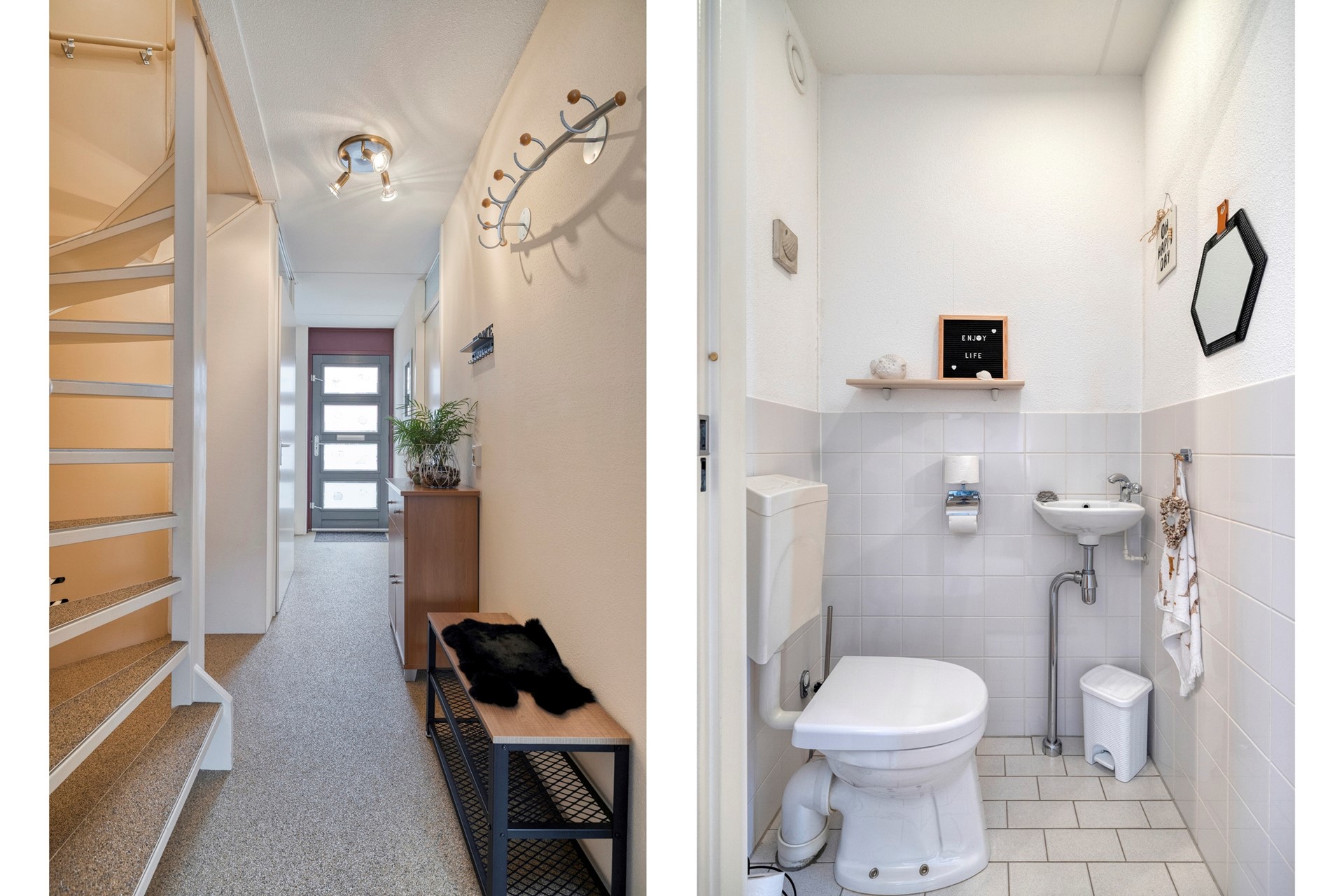 U komt aan in deze geliefde woonwijk op de Bergse Plaat, parkeert de auto en loopt middels de fraai aangelegde voortuin de woning binnen. De hal is afgewerkt met een grindvloer, spachtelputz wanden en een spuitwerk plafond. De hal biedt toegang tot de meterkast, betegeld toilet met fonteintje, woonkamer en de eerste verdieping middels een vaste trapopgang.