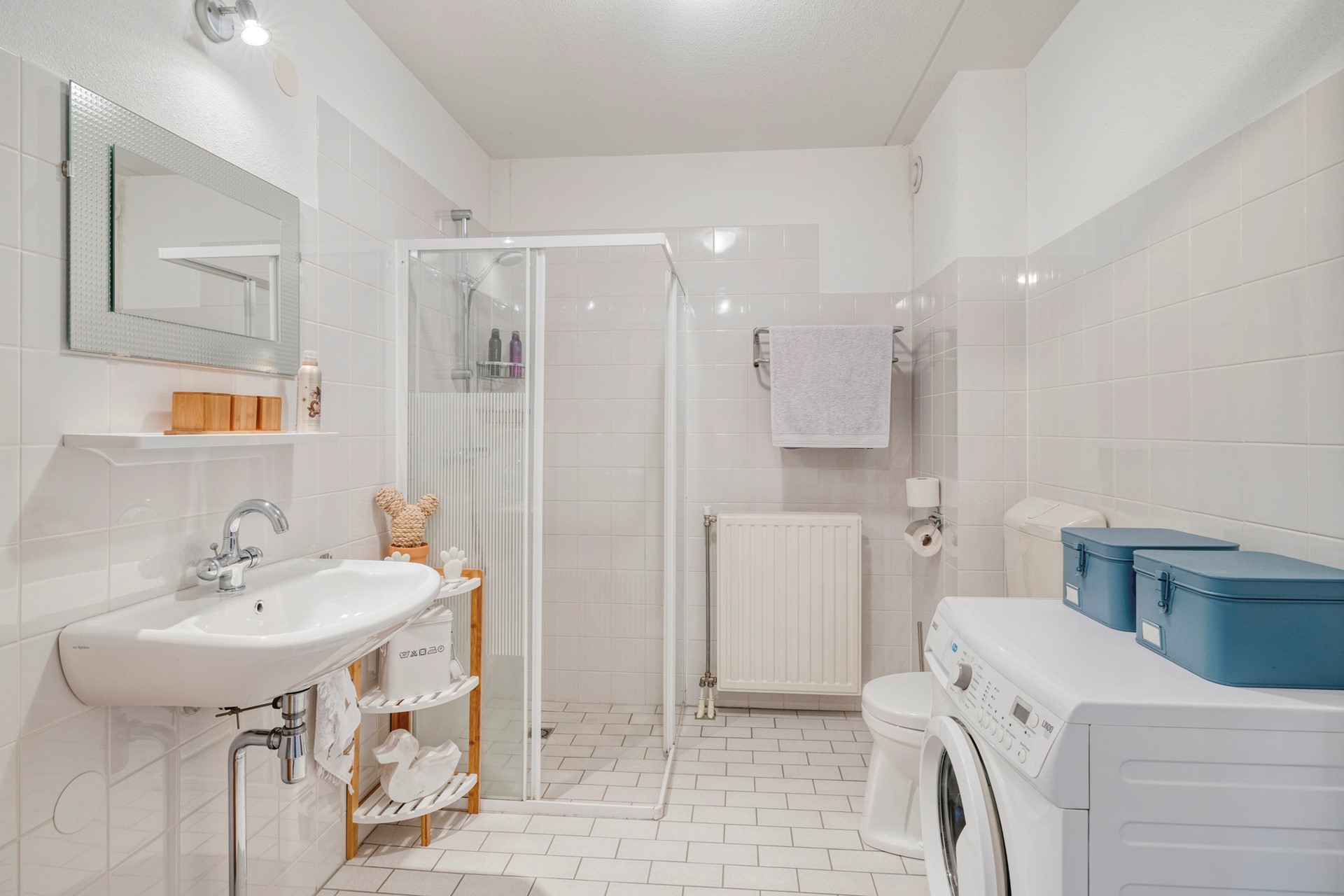 De badkamer is afgewerkt met een betegelde vloer, betegelde wanden en een spuitwerk plafond. De badkamer is voorzien van een wastafel, radiator, douchecabine en aansluiting wasmachine.