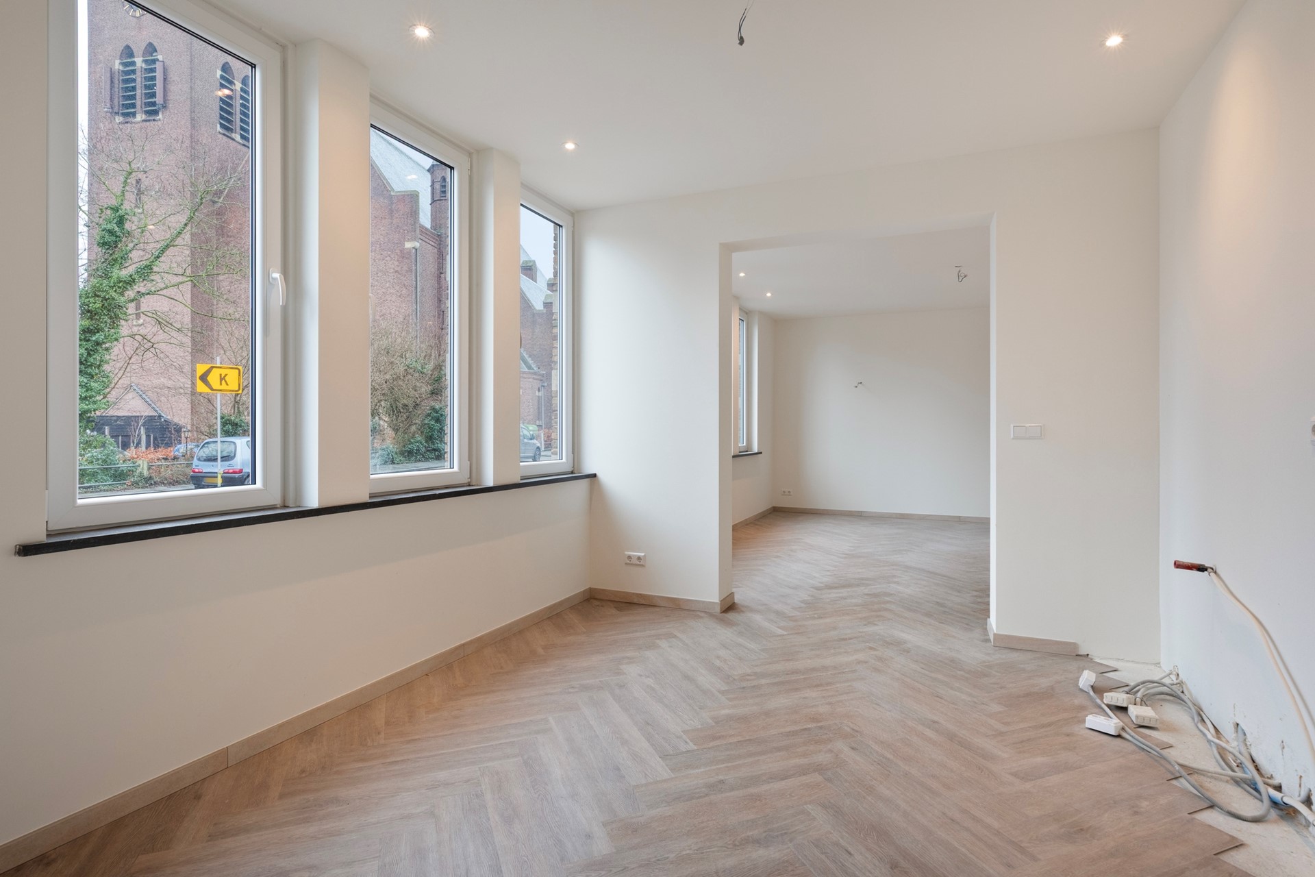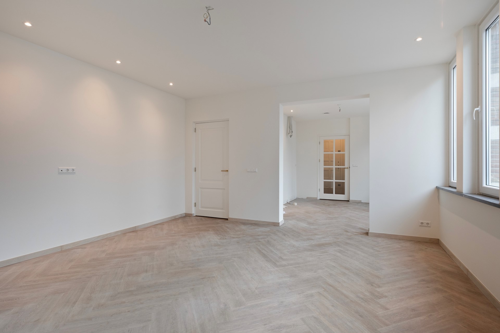 De living bestaat uit een riante woonkamer, open keuken en heeft bijzonder veel lichtinval door de kunststof raampartijen. De living is afgewerkt met een visgraat PVC-vloer, gestucte wanden en een gestuct plafond met inbouwverlichting. De aansluiting voor een moderne keuken zijn reeds aanwezig. U kunt deze dus zelf naar eigen smaak inrichten. Vanuit de woonkamer is er toegang tot de hal.