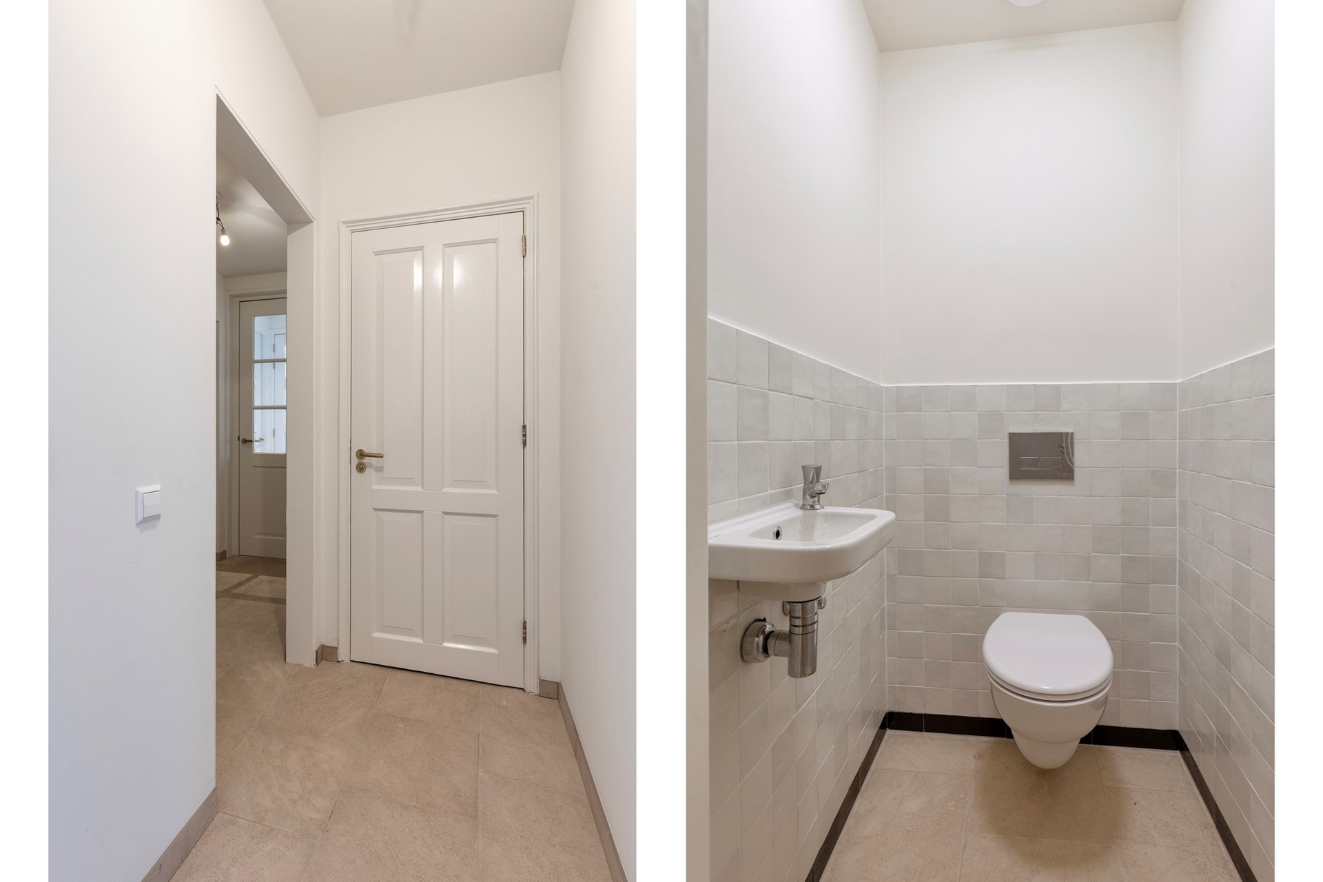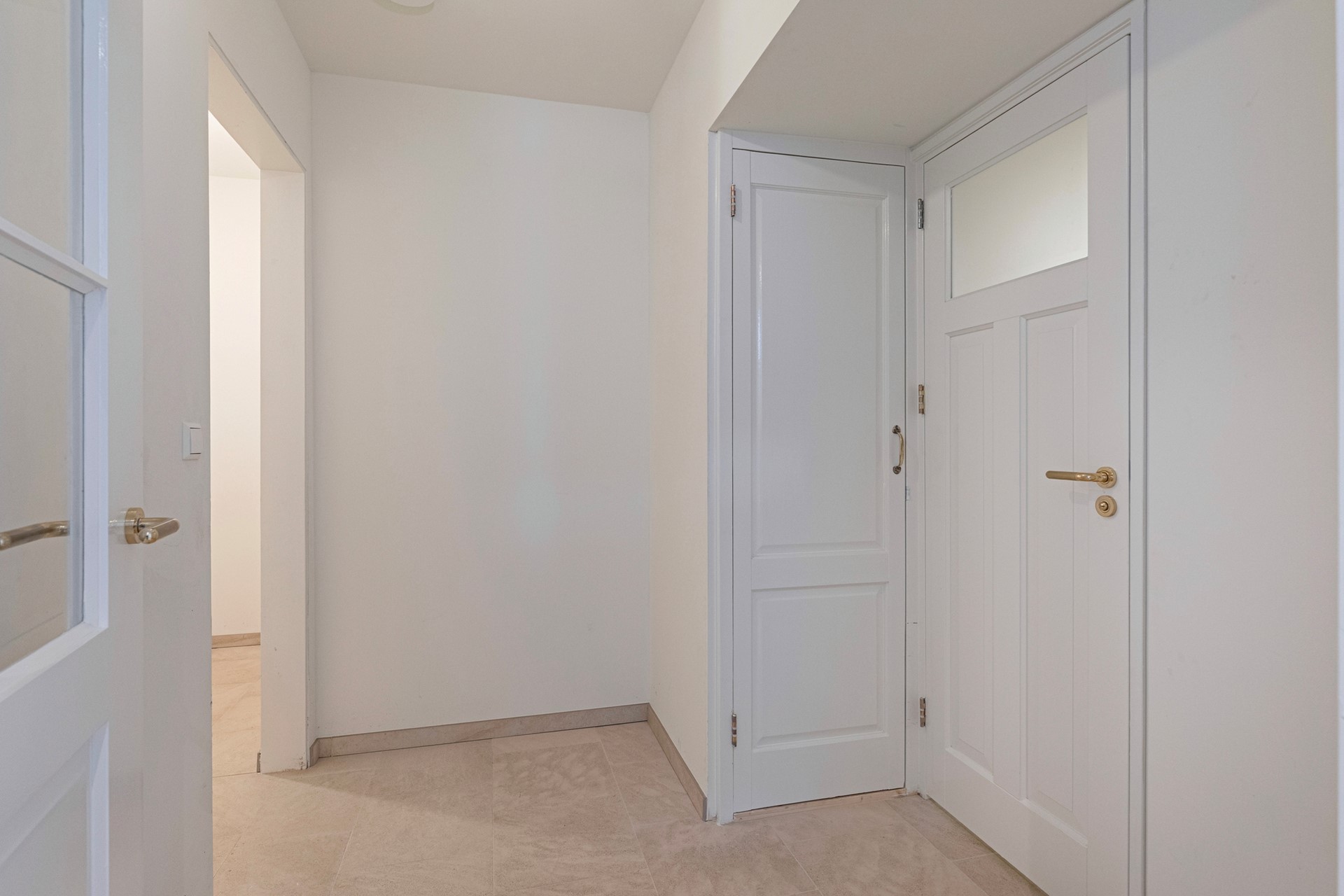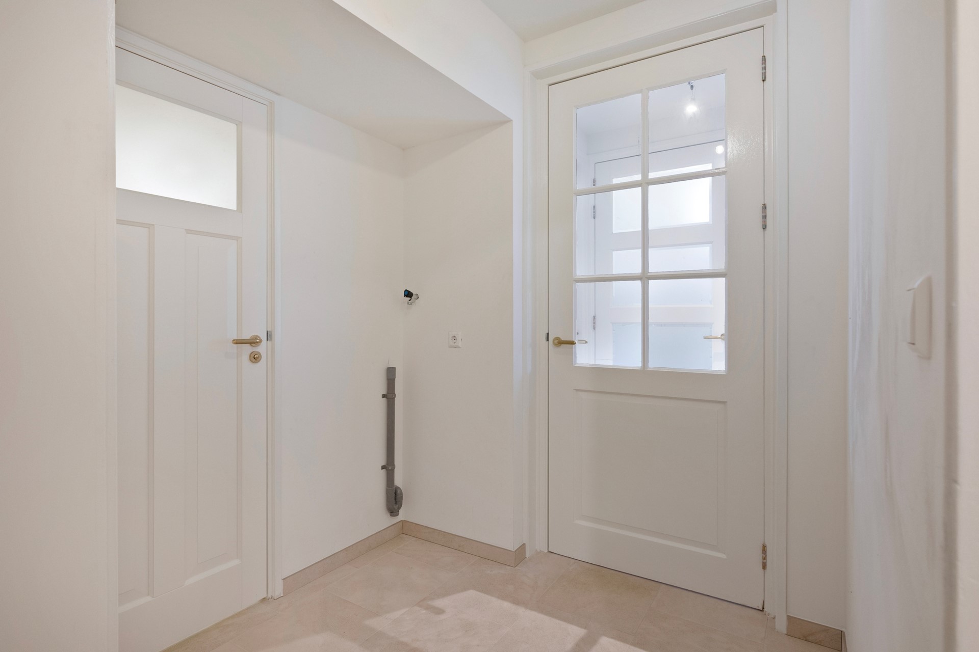 De hal is afgewerkt met een betegelde vloer, gestucte wanden en een gestuct plafond. De hal beschikt over de aansluiting voor witgoed en de technische ruimte met warmtepomp. Vanuit de hal is (ook middels een tweede hal) toegang tot het separaat toilet met fonteintje, drie slaapkamers en twee badkamers.
