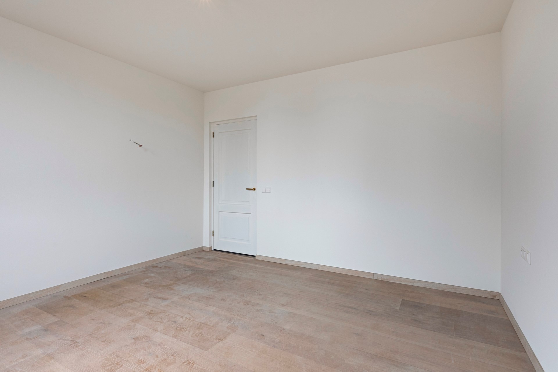 Slaapkamer 3 is afgewerkt met een in visgraat gelegde PVC-vloer, gestucte wanden en een gestuct plafond. Vanuit deze slaapkamer heeft u toegang tot de achtertuin middels een schuifpui. In deze ruimte zou het eventueel ook mogelijk zijn om de keuken te plaatsen.