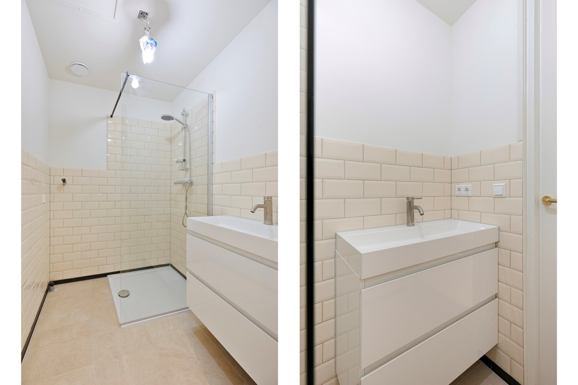 Badkamer 2 is afgewerkt met een betegelde vloer, deels gestuct en deels betegelde wanden en een gestuct plafond. De badkamer is voorzien van een douche en wastafelmeubel.