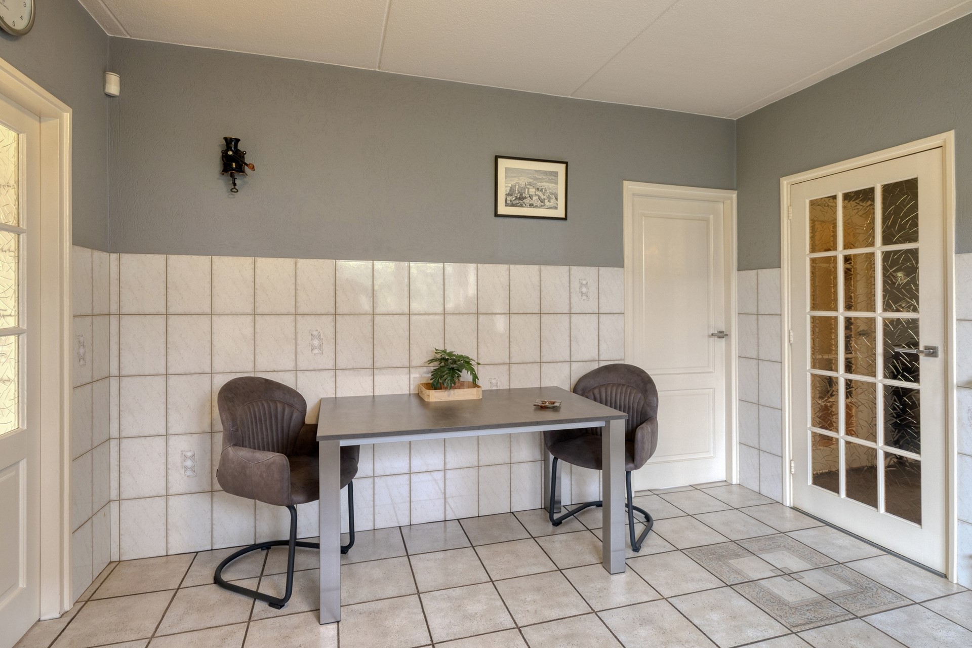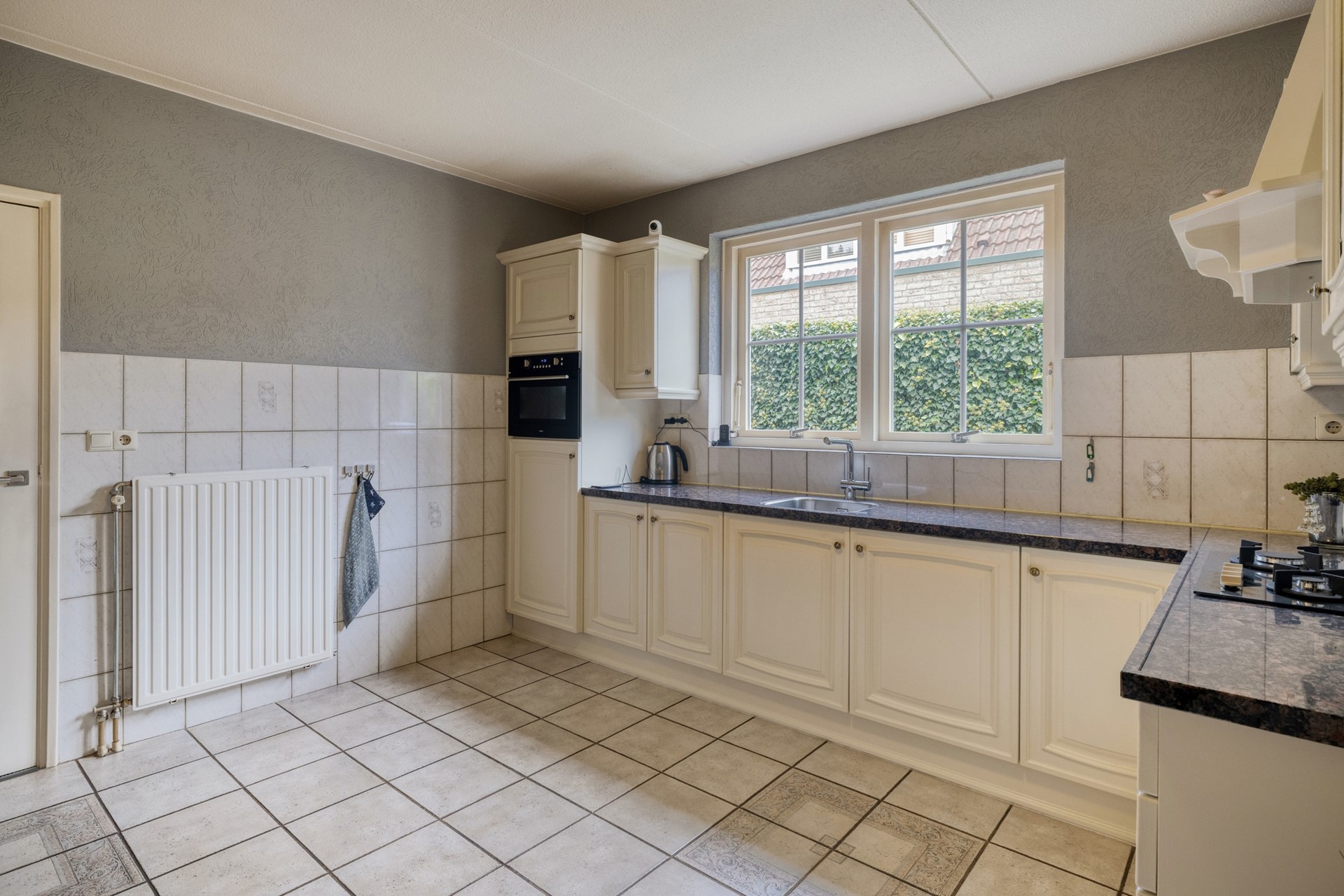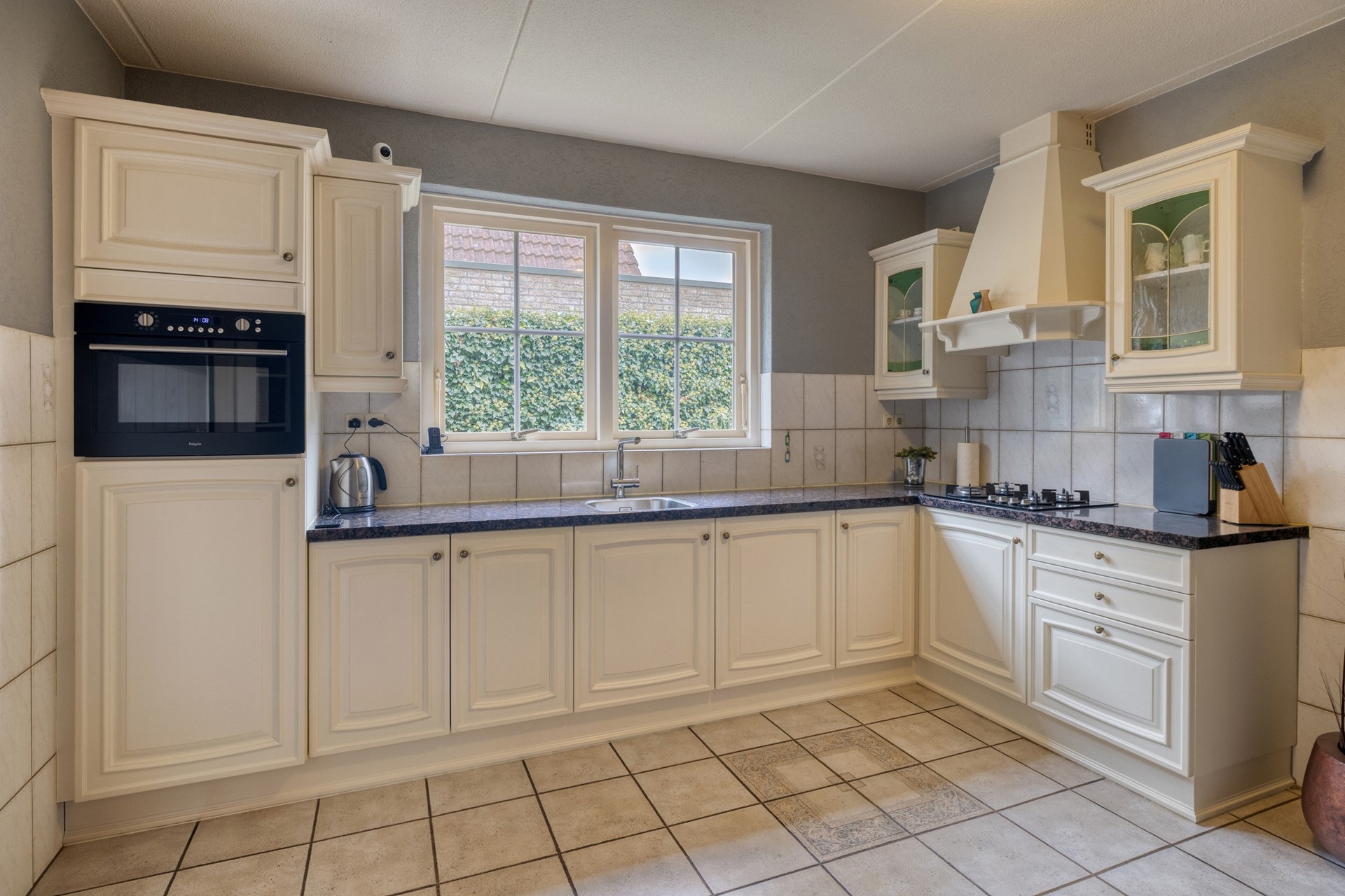 De gesloten woonkeuken is afgewerkt met een betegelde vloer, sierpleister en betegelde wanden en een spuitwerk plafond. Hier kunnen jullie heerlijke gerechten bereiden terwijl jullie gezellig kletsen met vrienden en familie. De keukeninrichting is voorzien van een marmer keukenblad uit 2021, spoelbak, onder- en bovenkastjes en diverse inbouwapparatuur (vernieuwd in 2021) zoals o.a. een afzuigkap, gasfornuis en oven. De keuken biedt toegang tot de bijkeuken.