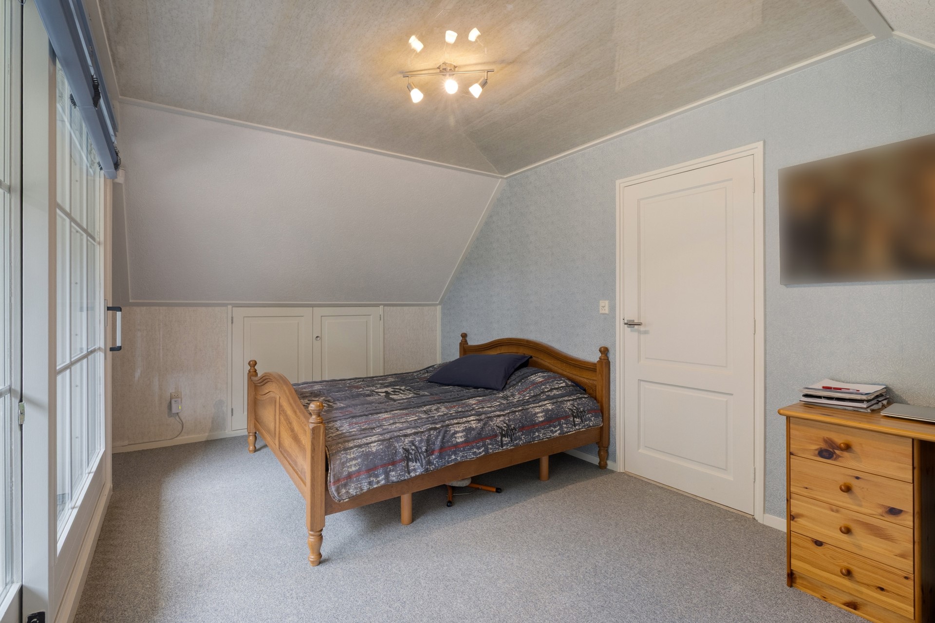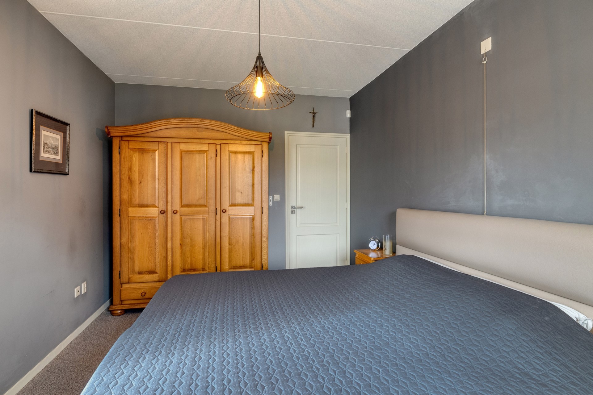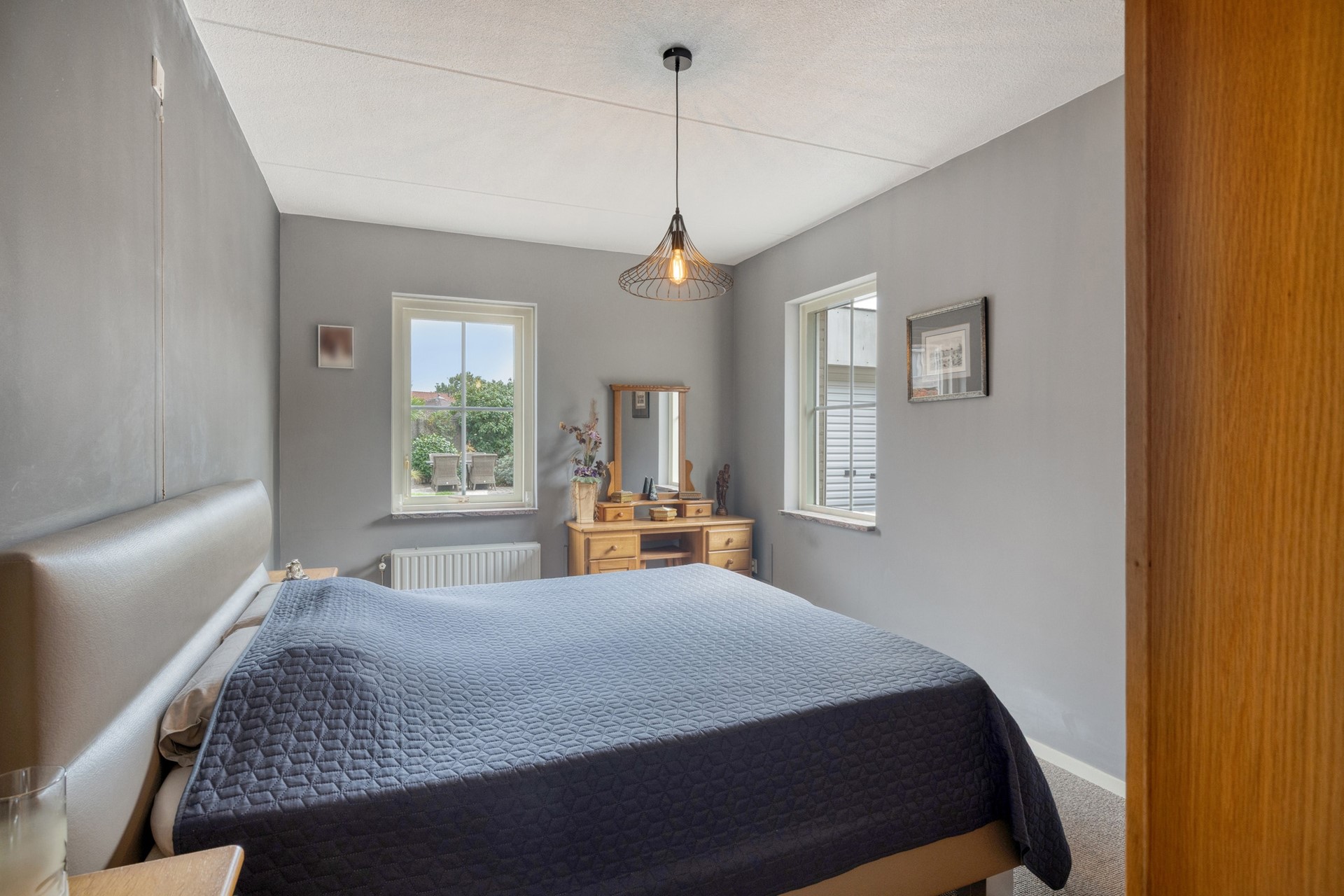 Slaapkamer 1 is afgewerkt met vloerbedekking, deels sierpleister en deels behangen wanden en een kunststof delen plafond. De slaapkamer is voorzien van knieschotkasten.