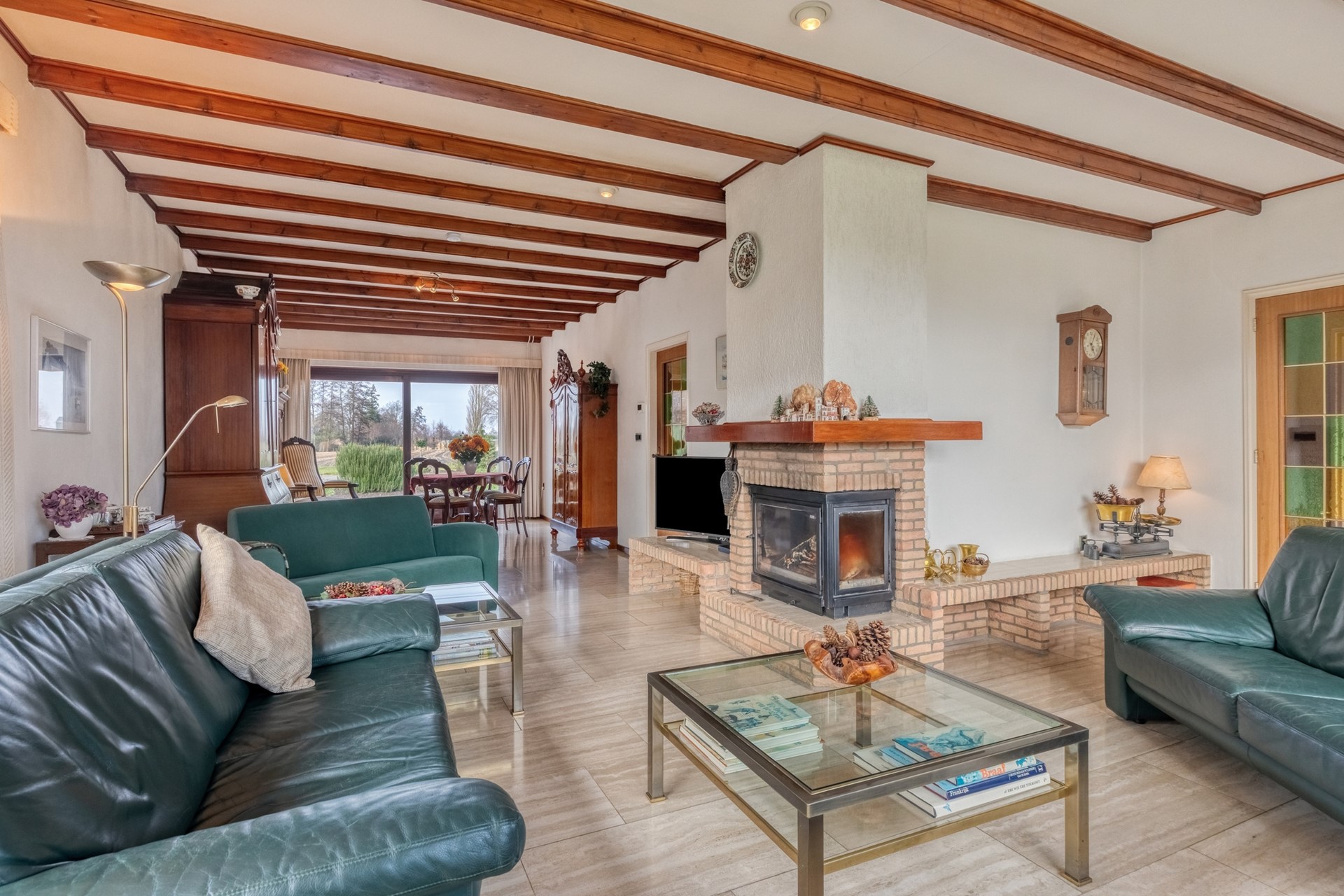 Kom met ons in de woonkamer zitten waar we een prachtig panoramisch uitzicht op prachtig groen hebben en jullie zijn verkocht! De woonkamer is afgewerkt met een travertin tegelvloer, gesauste wanden en een houten balken plafond. De woonkamer is voorzien van een openhaard, convectorputten, hardhouten schuifpuien en elektrische rolluiken.
