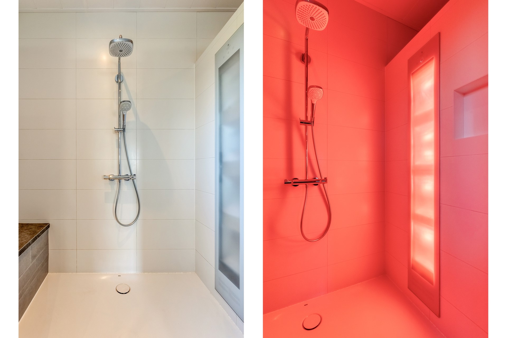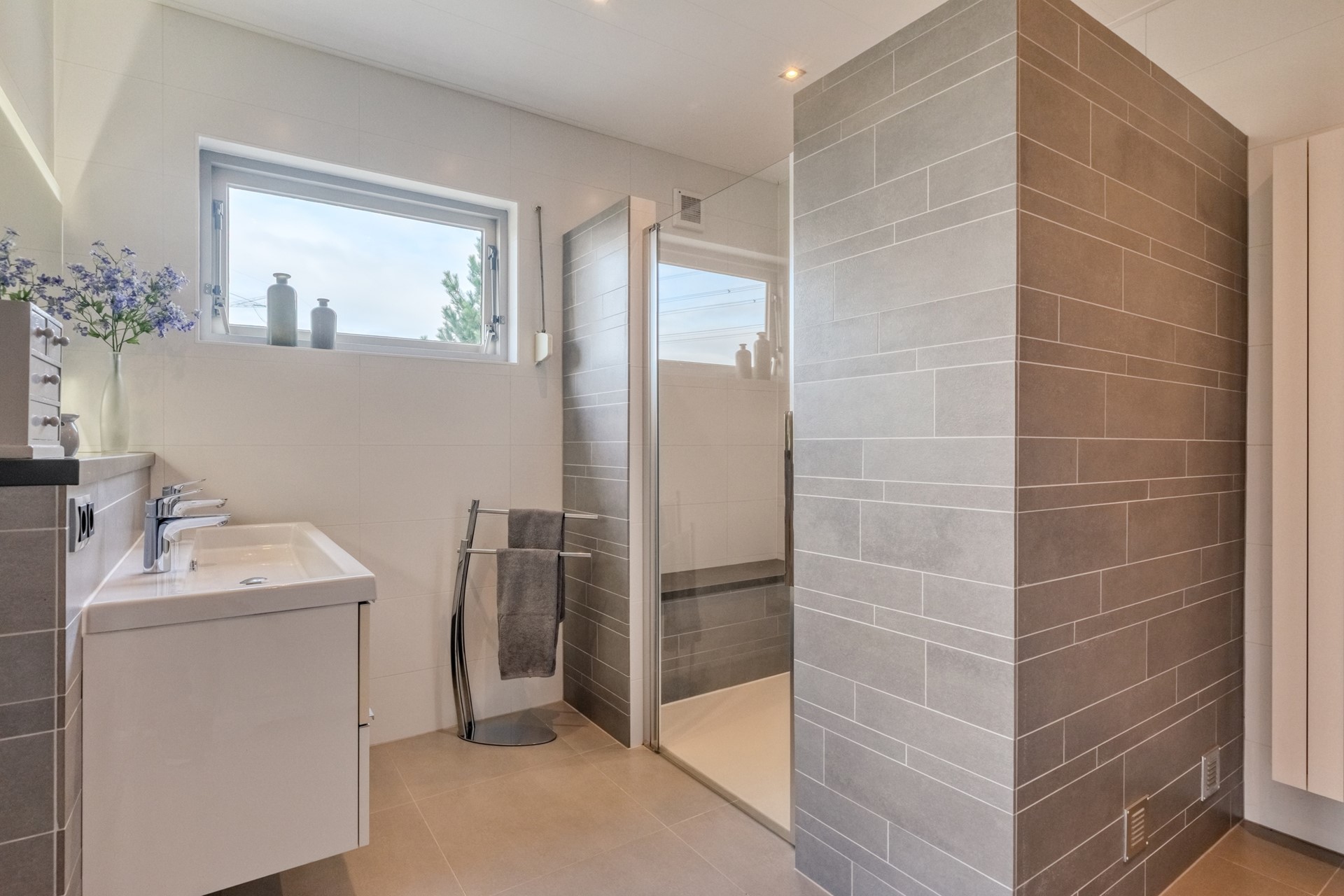 De badkamer is afgewerkt met een plavuizen vloer, betegelde wanden een kunststof delen plafond voorzien van inbouwverlichting. De badkamer is voorzien van een dubbel wastafelmeubel, riante inloopdouche met infrarood- en UV Sunshower, design radiator en mechanische ventilatie.