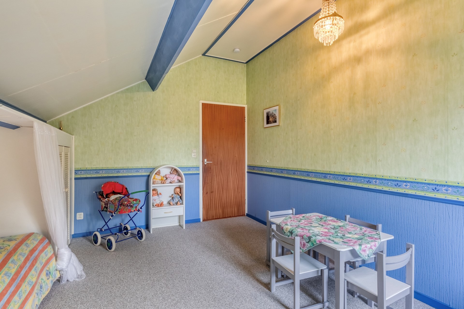 Slaapkamer 3 is afgewerkt met vloerbedekking, deels behangen en deels gesauste wanden en plafondplaten. De slaapkamer is voorzien van riante knieschotkasten.