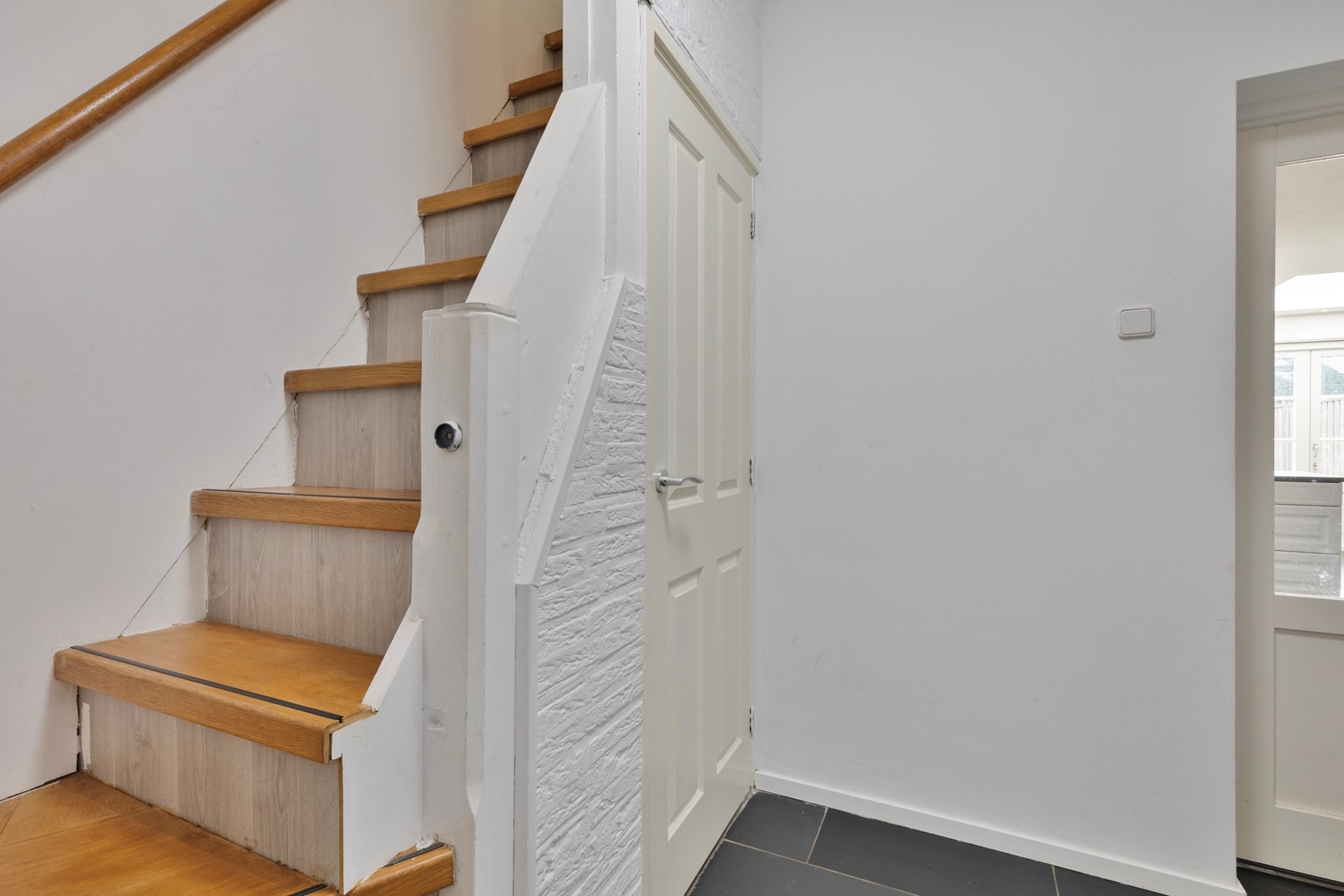 Jullie komen aan bij de woning, parkeren de auto en lopen middels de voortuin naar binnen. De entree is afgewerkt met een betegelde vloer, schoonmetselwerk wanden en een gestuct plafond. De hal c.q. entree biedt toegang tot het betegelde toilet met fonteintje, meterkast, woonkamer, woonkeuken en eerste verdieping middels een vaste trapopgang met trapkast.