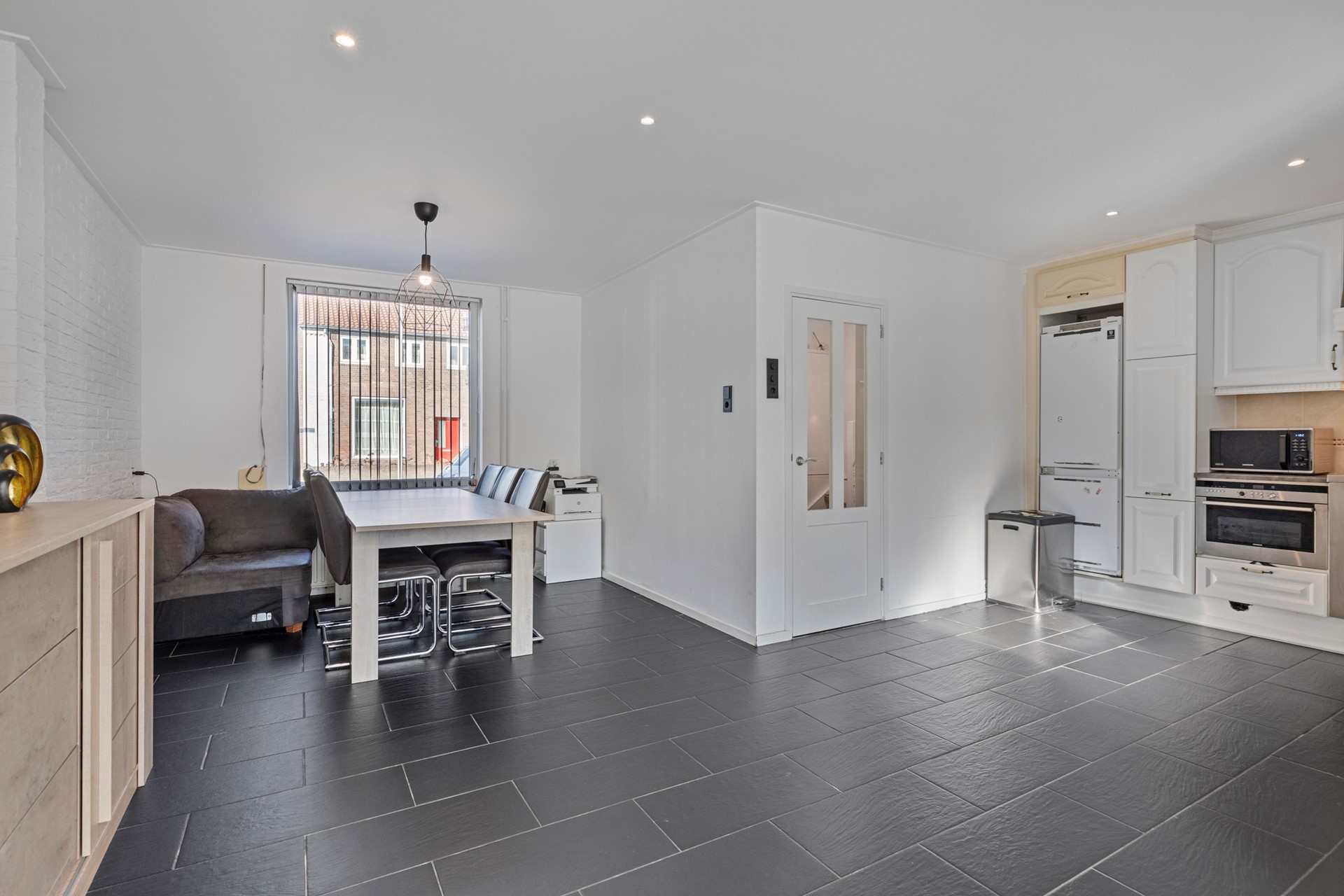 Plof in de woonkamer neer op de bank om je favoriete serie te kijken of organiseer een leuk etentje met vrienden of familie! De woonkamer is afgewerkt met een betegelde vloer, deels gestucte en deels schoonmetselwerk wanden en een gestuct plafond met inbouwverlichting. In de aanbouw van de woning is de vloer voorzien van vloerverwarming. De aanbouw is voorzien van een lichtkoepel en airconditioning. Vanuit hier is er tevens toegang tot de hal/bijkeuken en de achtertuin.