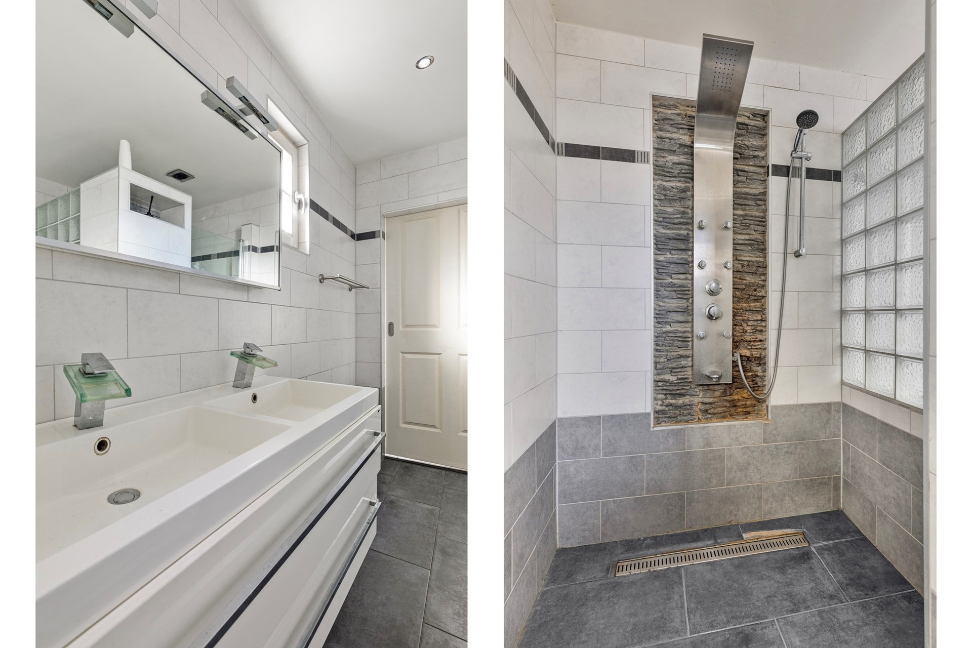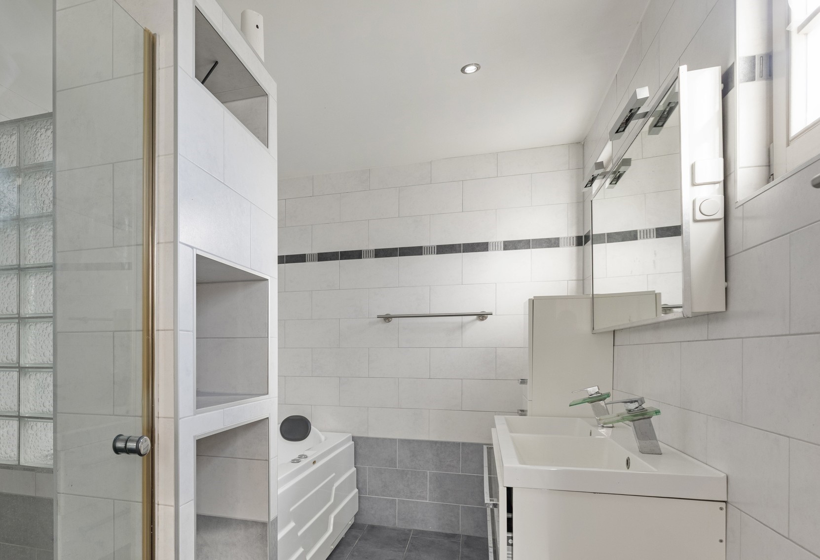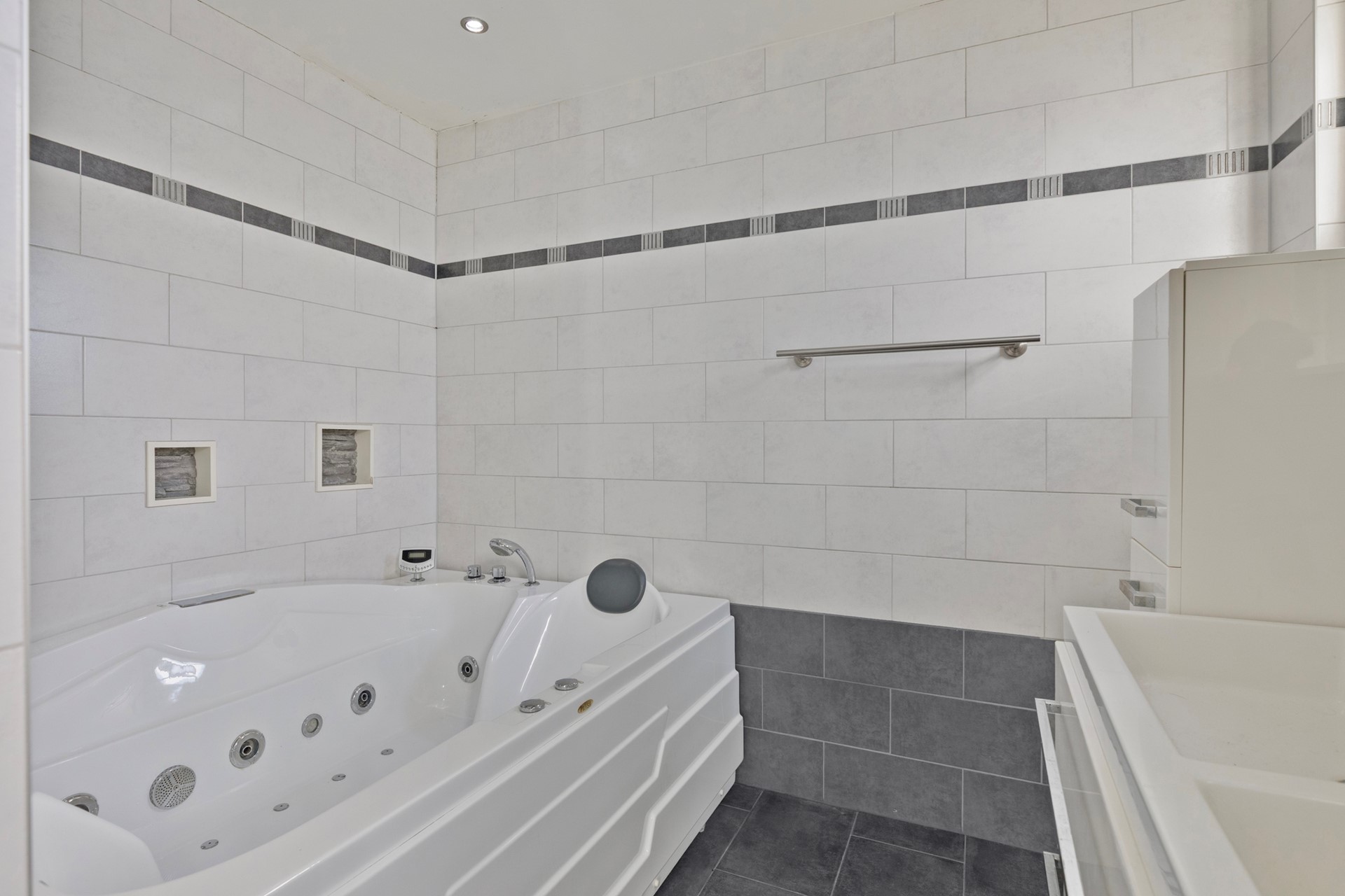 De badkamer is afgewerkt met een betegelde vloer, betegelde wanden en een gestuct plafond met inbouwverlichting. De badkamer is voorzien van een jacuzzi, riante inloopdouche, dubbel wastafelmeubel en natuurlijke ventilatie.