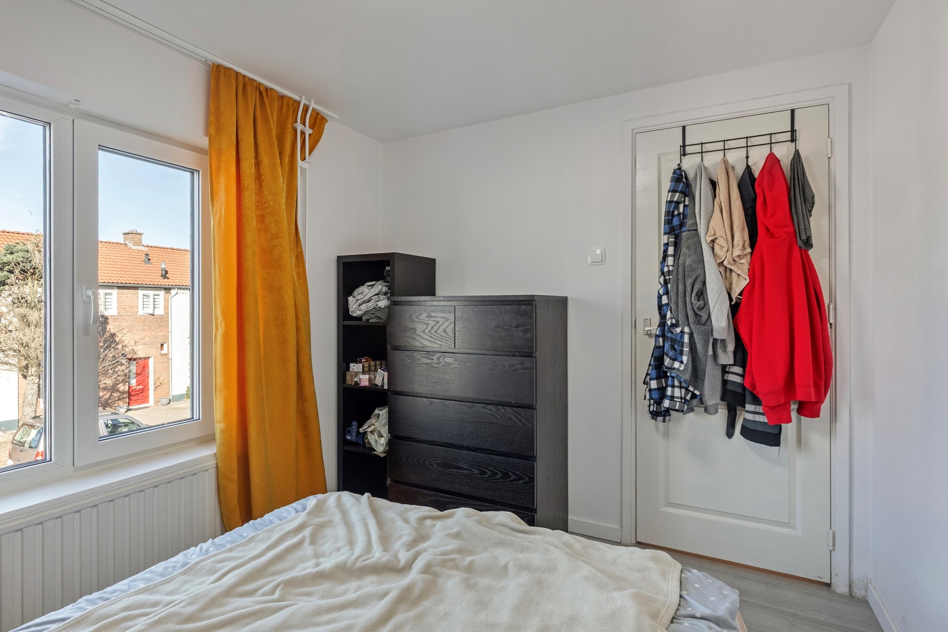 Slaapkamer 3 is afgewerkt met een laminaatvloer, deels gestuct en deels behangen wanden en een gestuct plafond. De slaapkamer is voorzien van een met de hand bedienbaar rolluik.