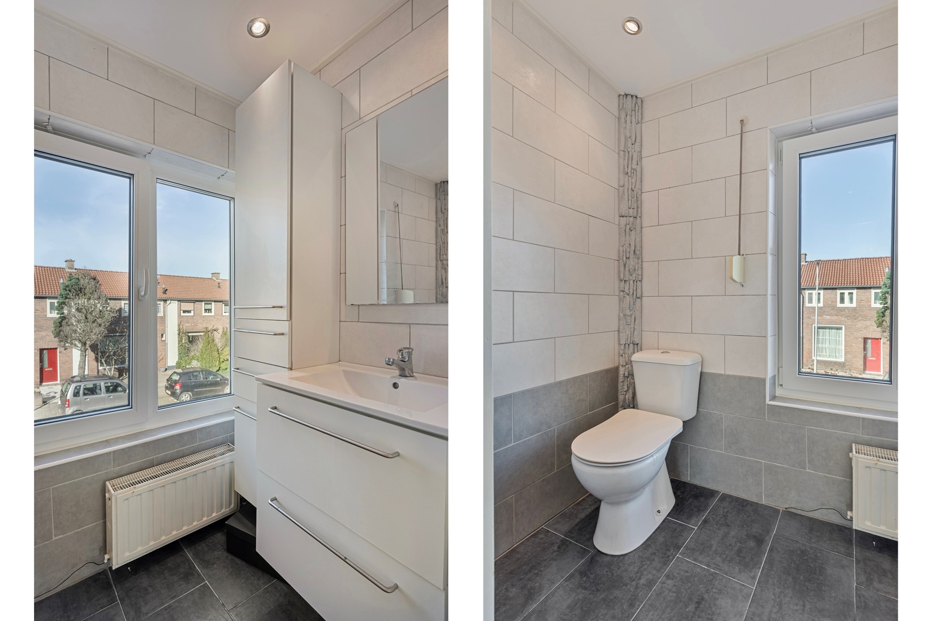 De badkamer is afgewerkt met een betegelde vloer, betegelde wanden en een gestuct plafond. De badkamer is voorzien van een toilet, douche en wastafel.