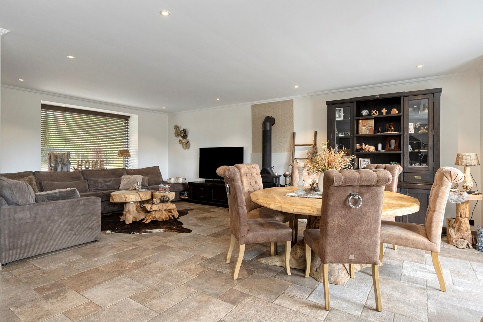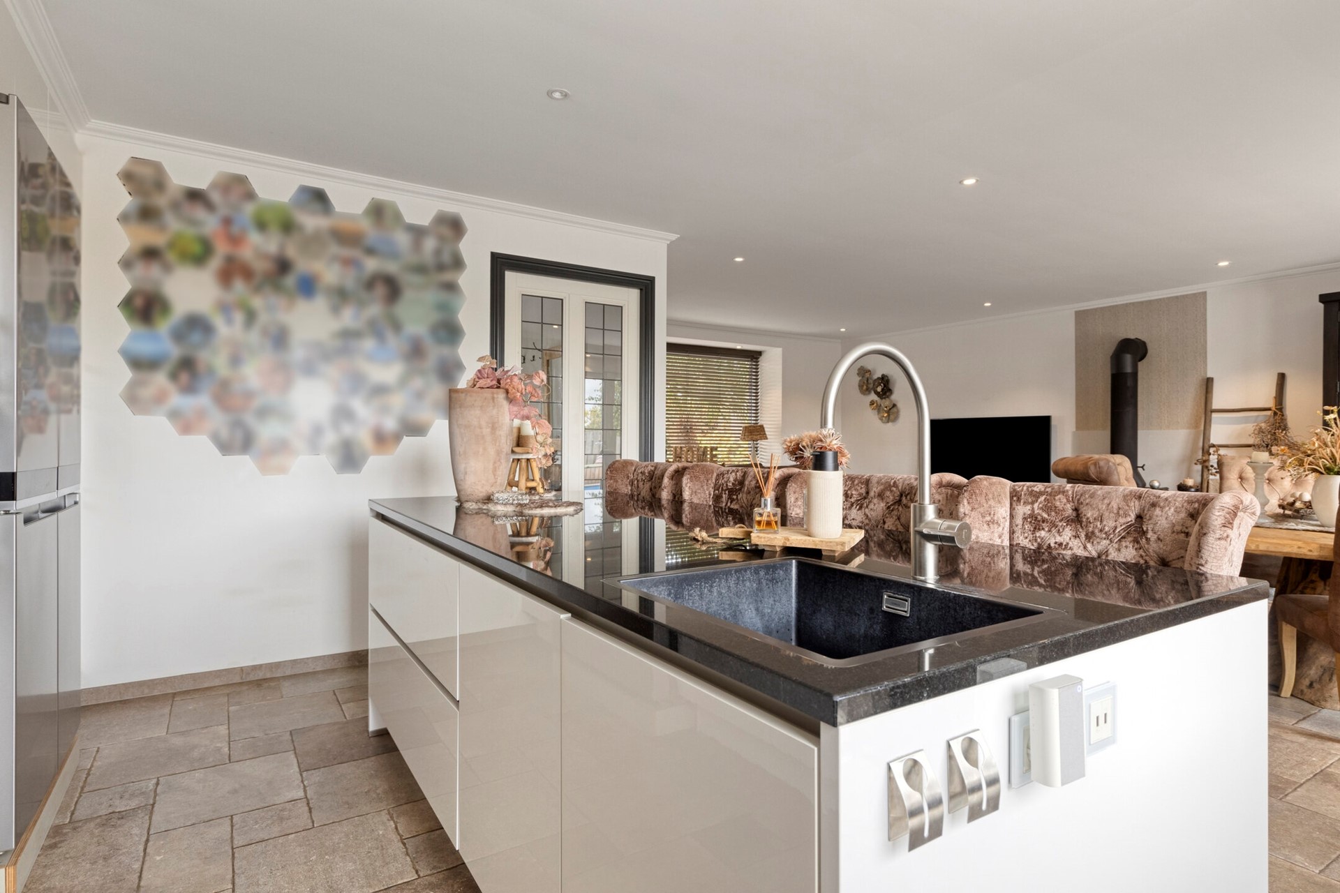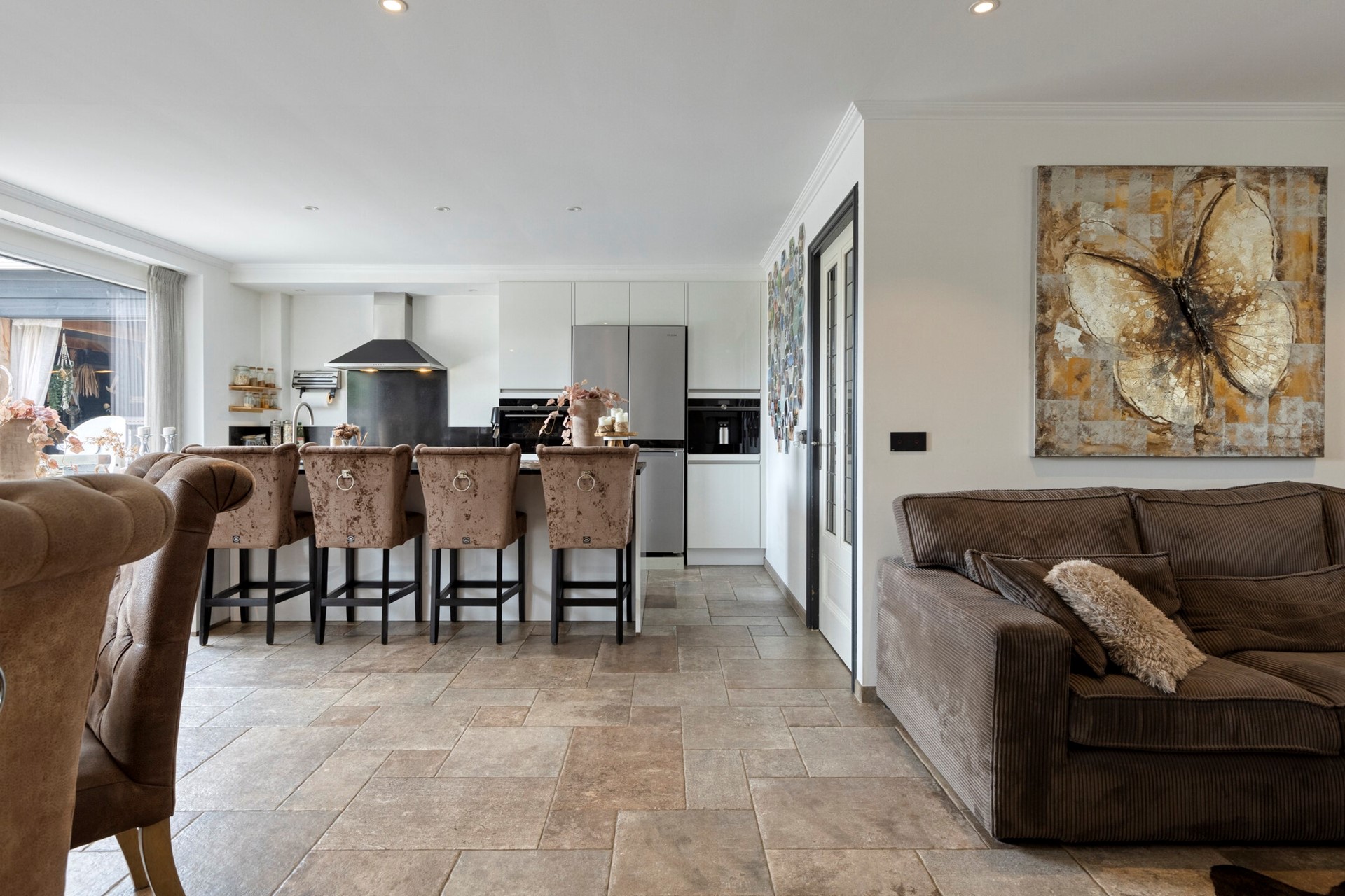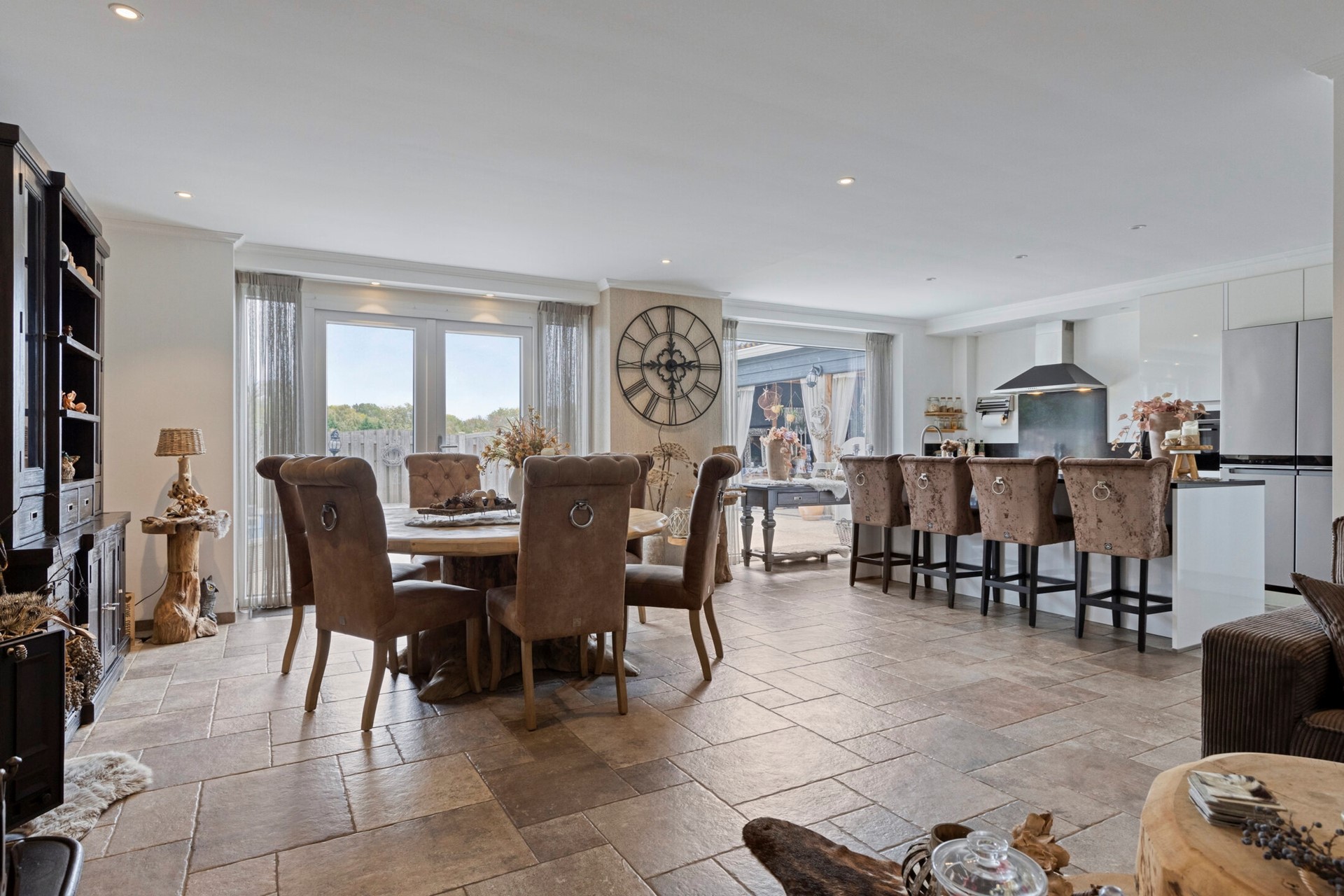 De woonkamer straalt een verfijnde sfeer uit, waar elegantie en warmte moeiteloos samenkomen. De woonkamer is afgewerkt met een betegelde vloer, gestucte wanden en een gestuct plafond. de woonkamer is voorzien van een houtkachel en biedt toegang tot de open keuken en achtertuin middels openslaande tuindeuren.