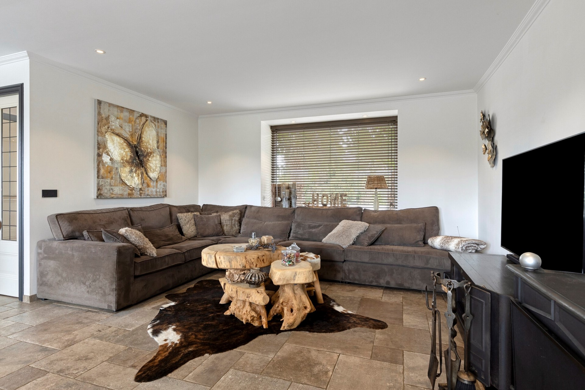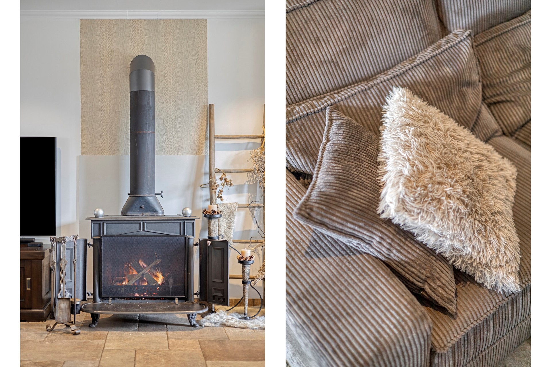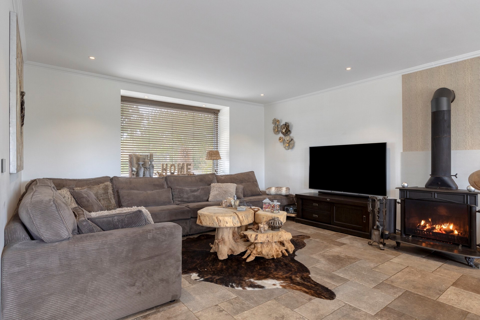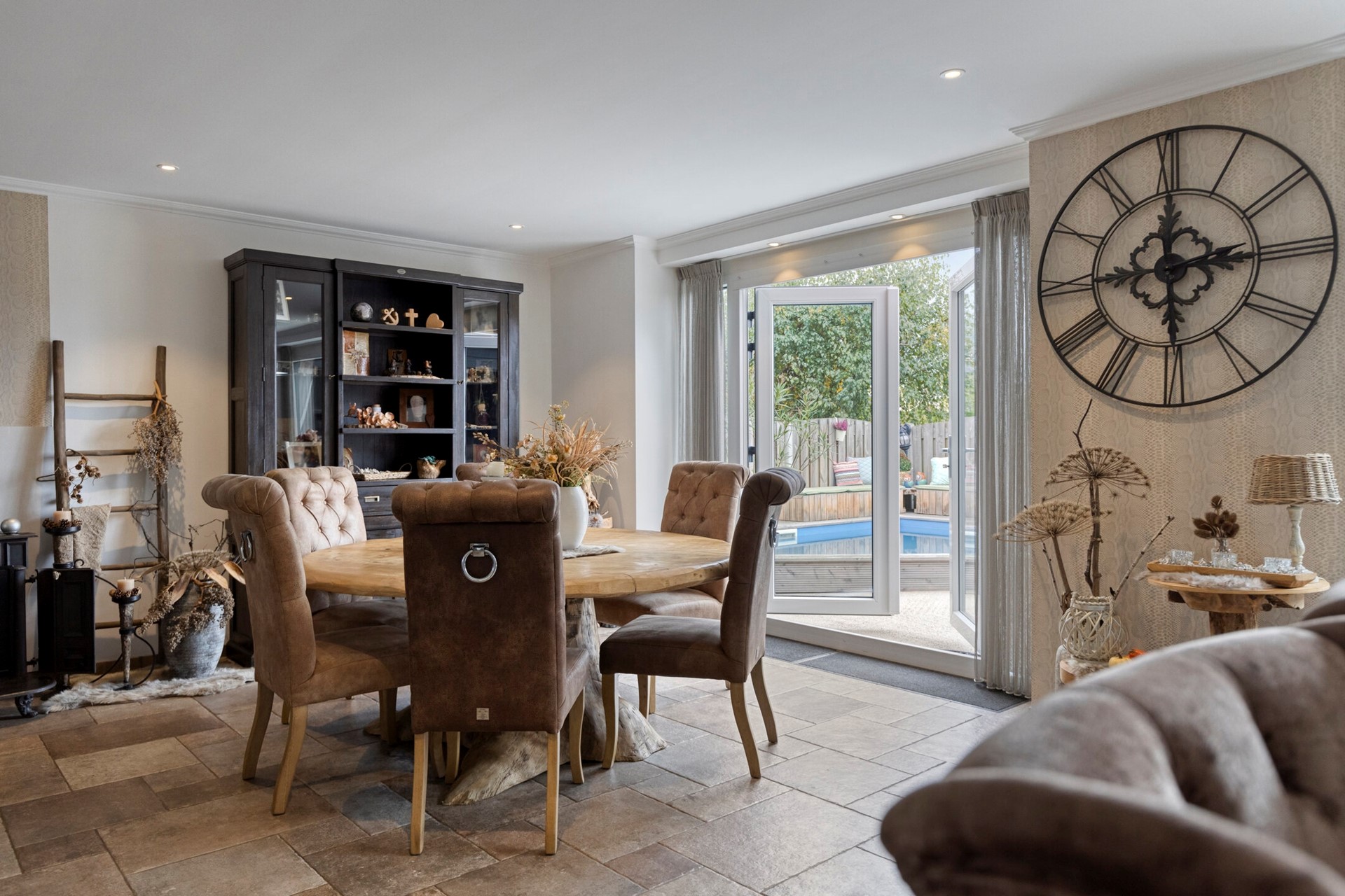 De woonkamer straalt een verfijnde sfeer uit, waar elegantie en warmte moeiteloos samenkomen. De woonkamer is afgewerkt met een betegelde vloer, gestucte wanden en een gestuct plafond. de woonkamer is voorzien van een houtkachel en biedt toegang tot de open keuken en achtertuin middels openslaande tuindeuren.