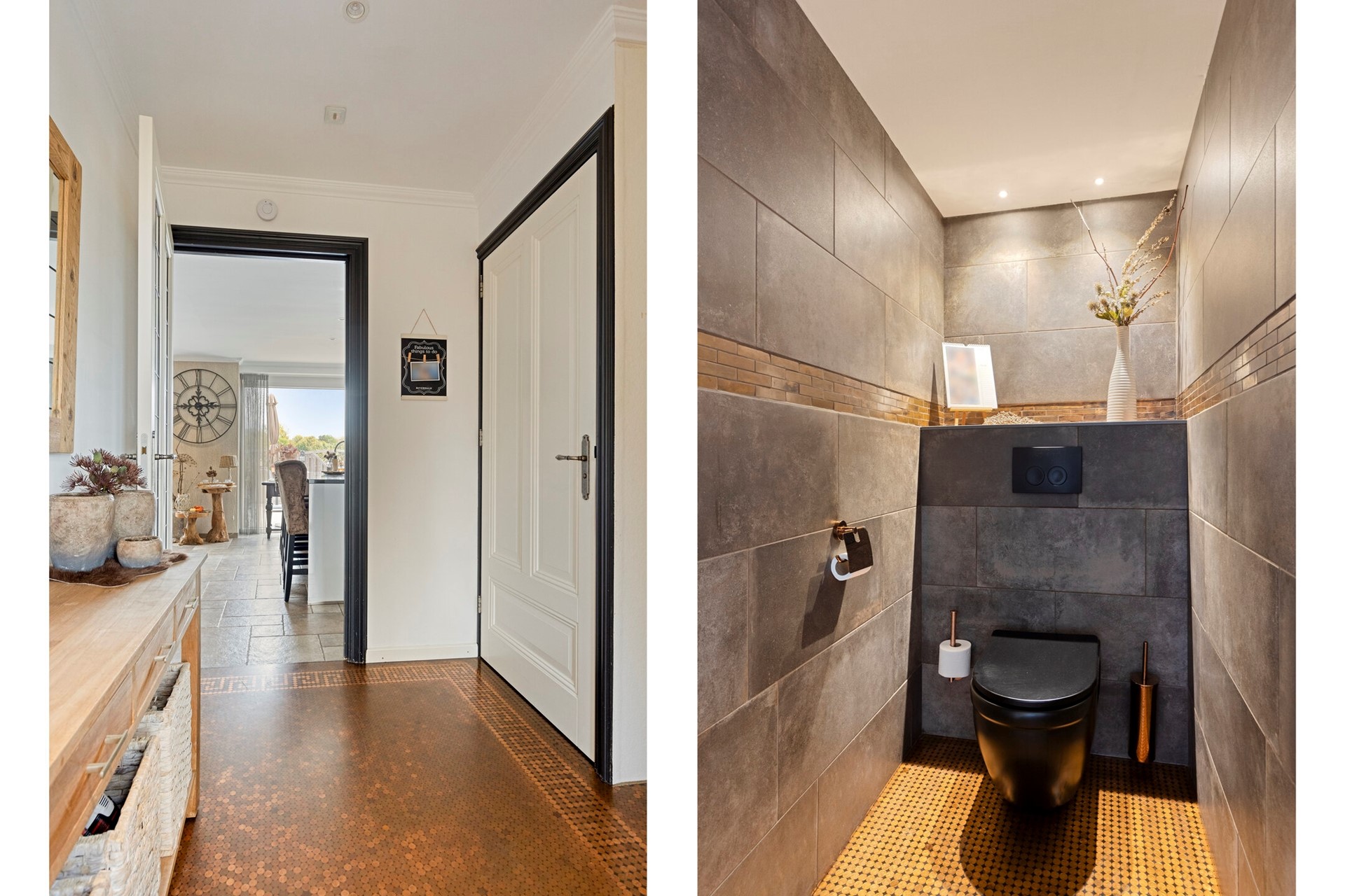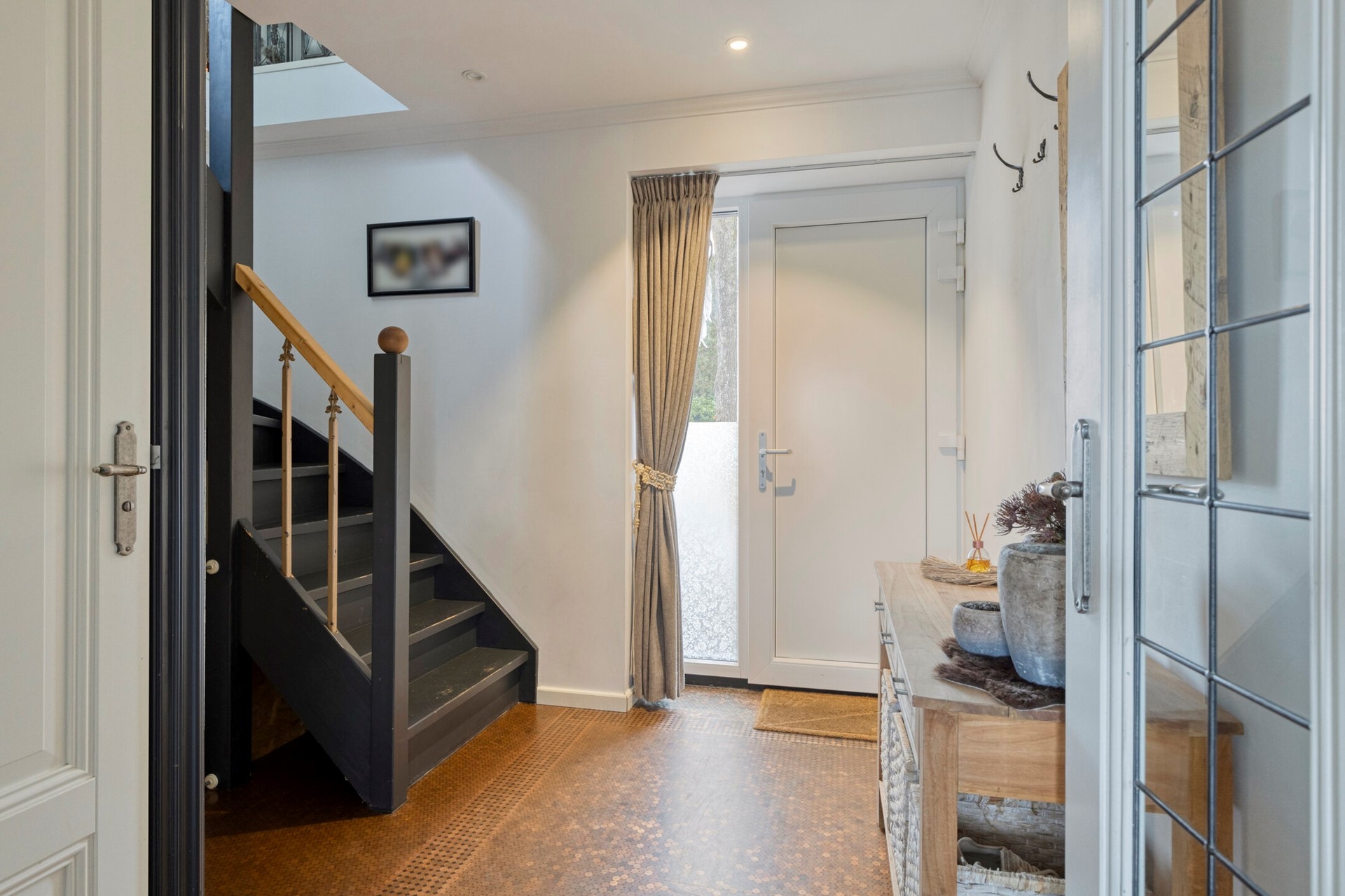 Jullie komen aan bij deze landelijk gelegen woning, parkeren de auto op de ruime oprit en lopen de woning binnen. De entree is afgewerkt met een in Versace patroon gelegde stuiver - epoxy vloer, gestucte wanden en een gestuct plafond. De hal biedt toegang tot de woonkamer en keuken, modern toilet en eerste verdieping middels een vaste trapopgang.