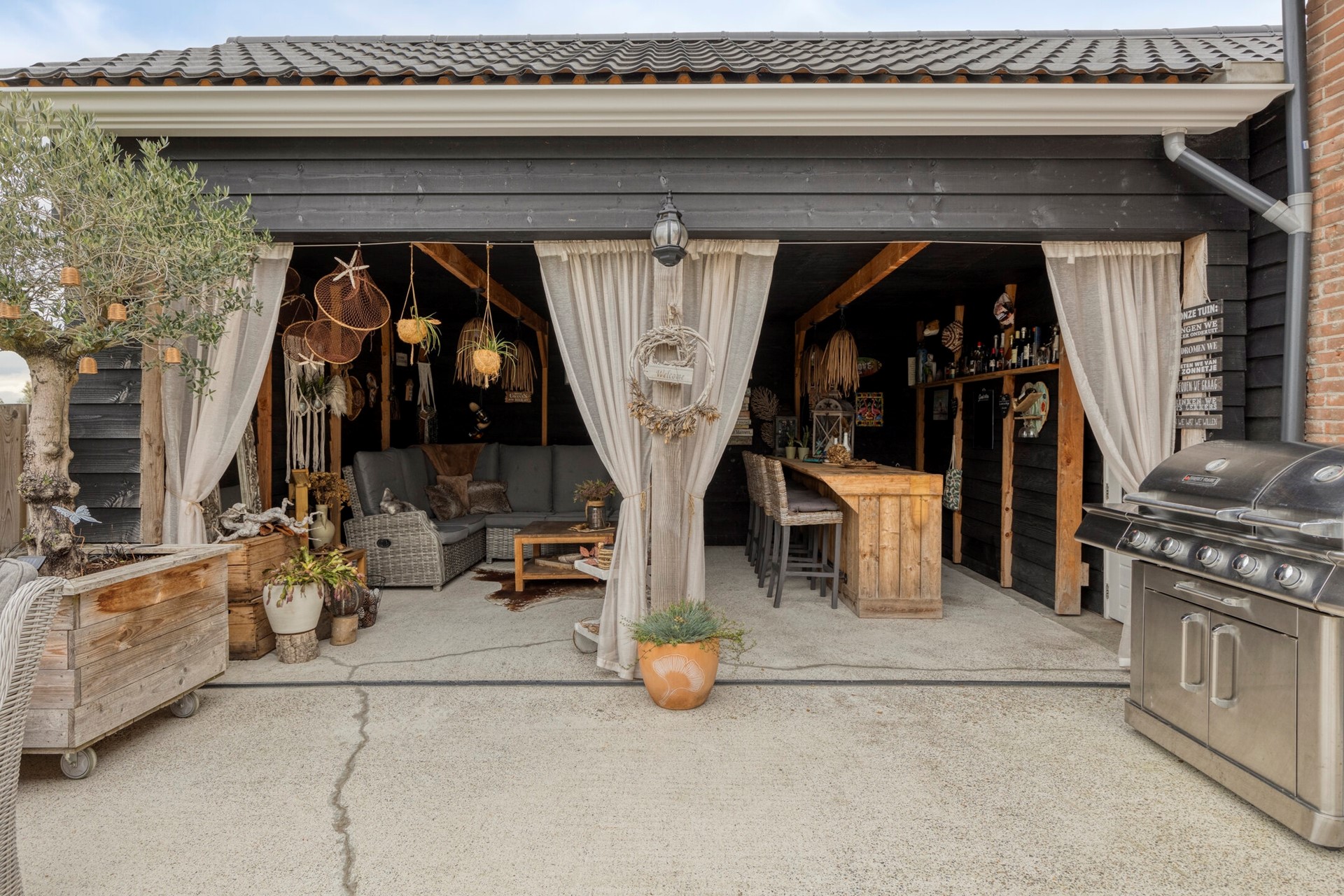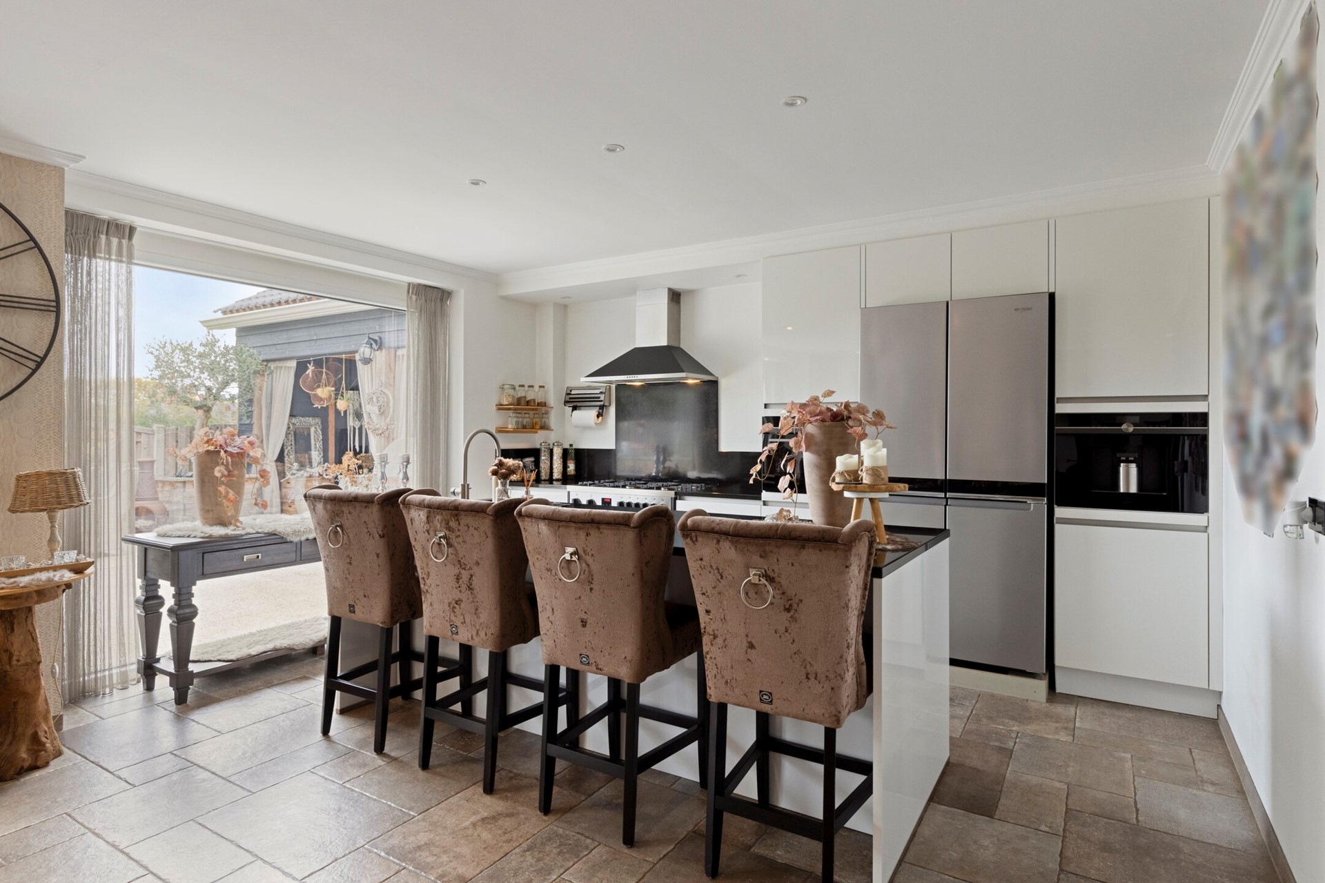 Wauw, wat een plaatje! Hier kunnen heerlijke recepten bereid worden. De moderne open keuken (2020) is afgewerkt met een betegelde vloer, gestucte wanden en een gestuct plafond met inbouwverlichting. De keukeninrichting is voorzien van onder- en bovenkastjes, inbouw koffiezetapparaat, oven met 6-pits gasfornuis, koelkast, magnetron en spoeleiland met vaatwasser en spoelbak.