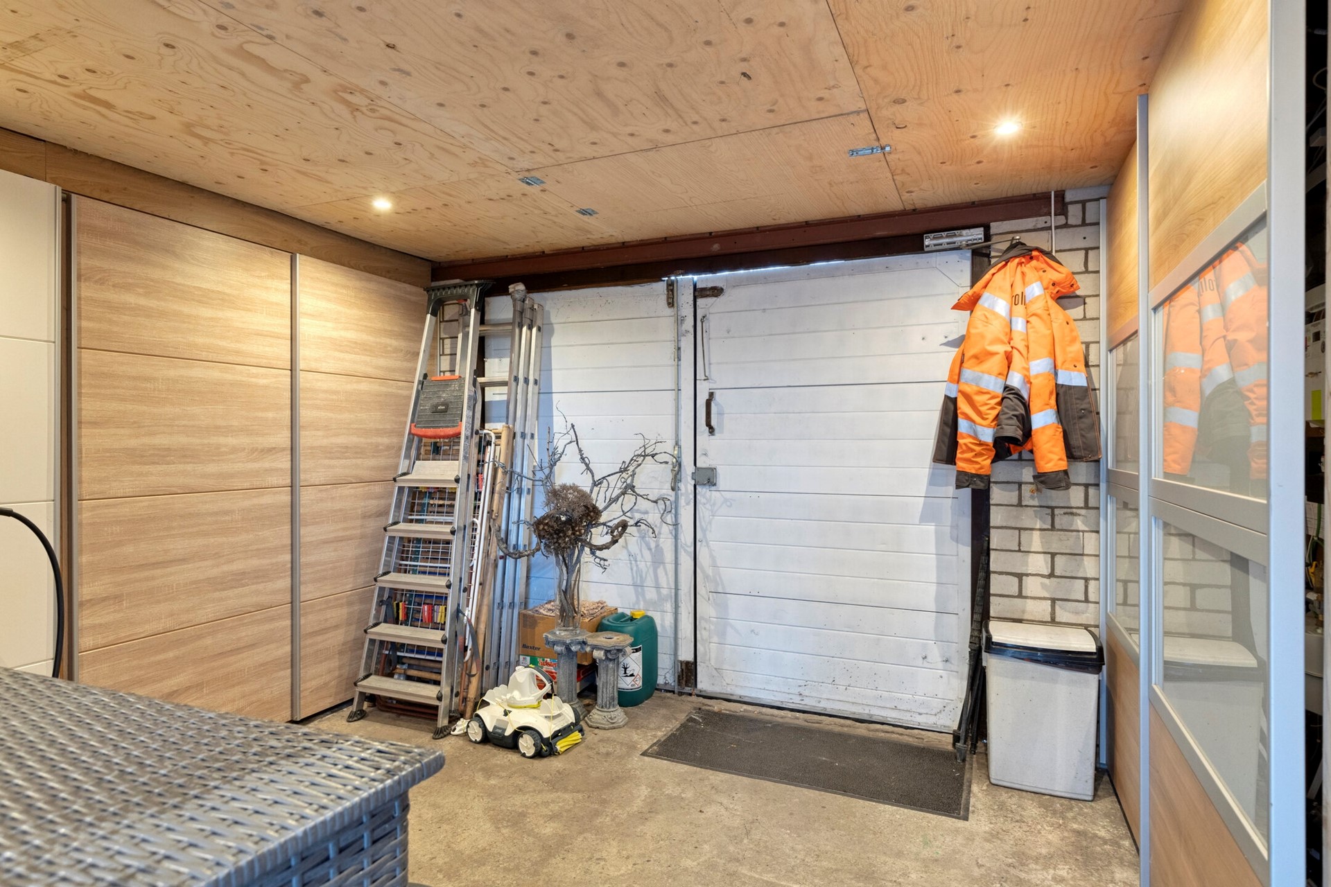 De garage is voorzien van een betonvloer, vliering, aansluiting wasmachine en droger, inbouwkasten en CV-Ketel (Intergas, 2019).