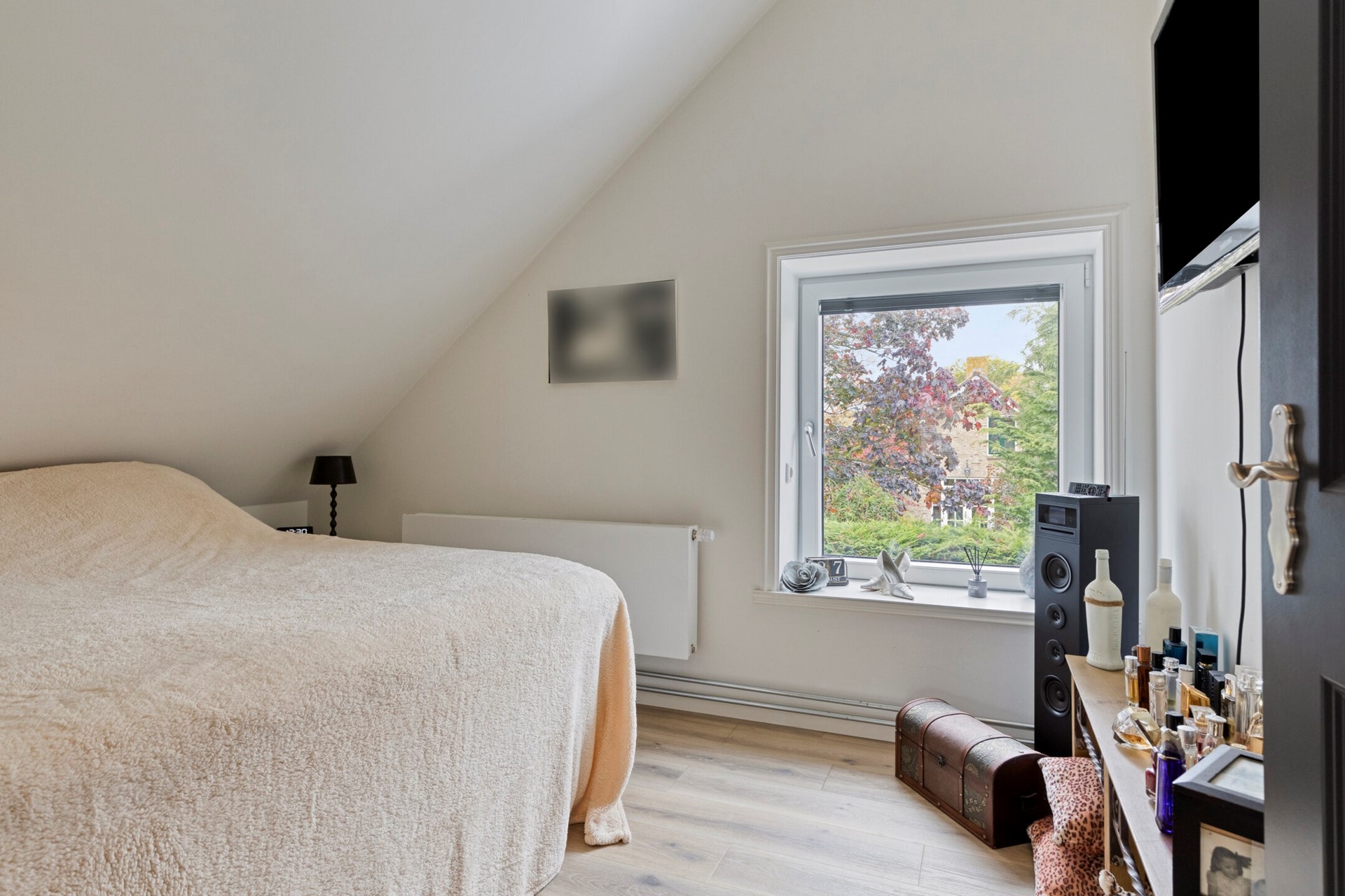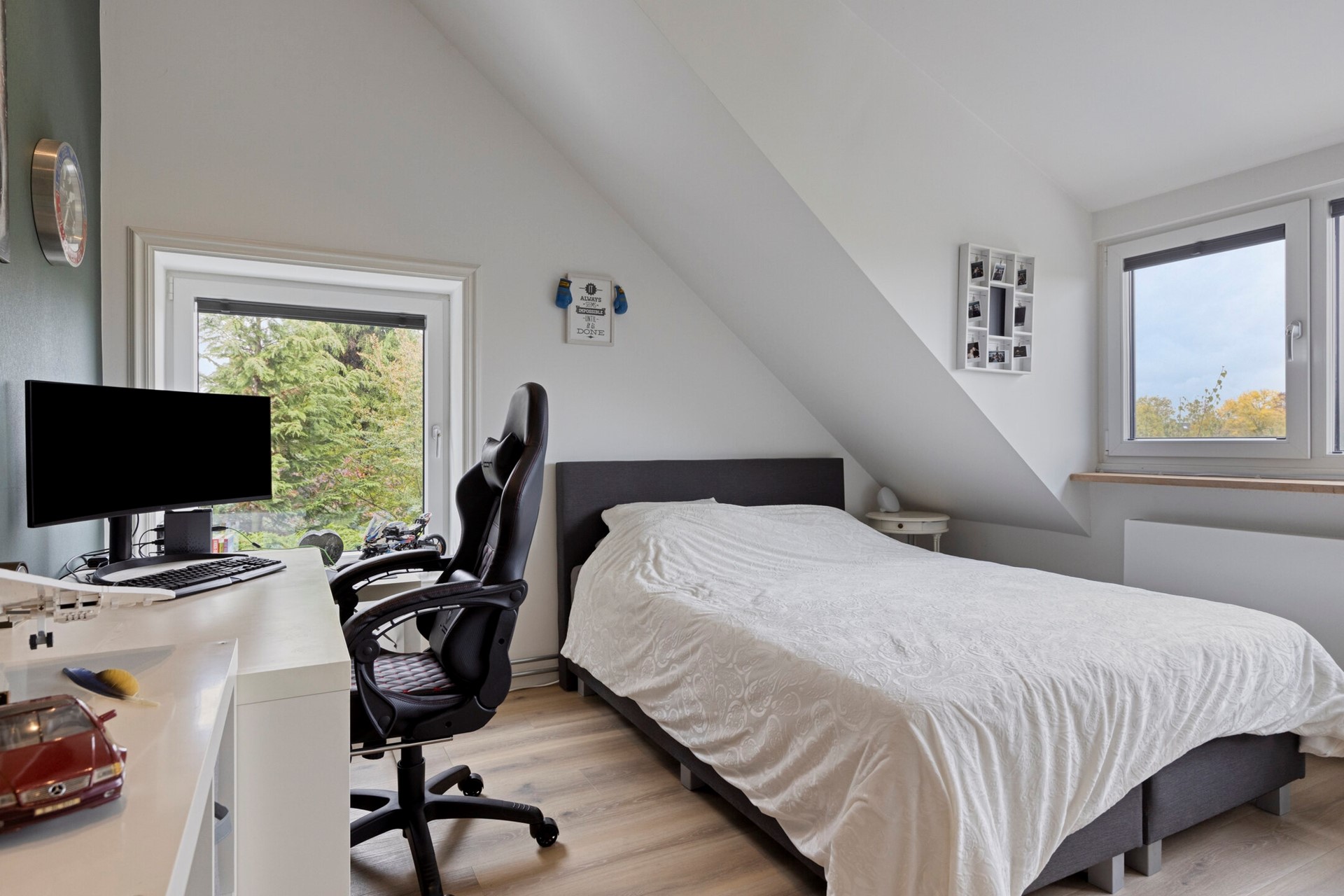 Slaapkamer 1 is afgewerkt met een PVC vloer, gestucte wanden en een gestuct plafond. De slaapkamer is voorzien van een dakkapel en elektrisch rolluik.