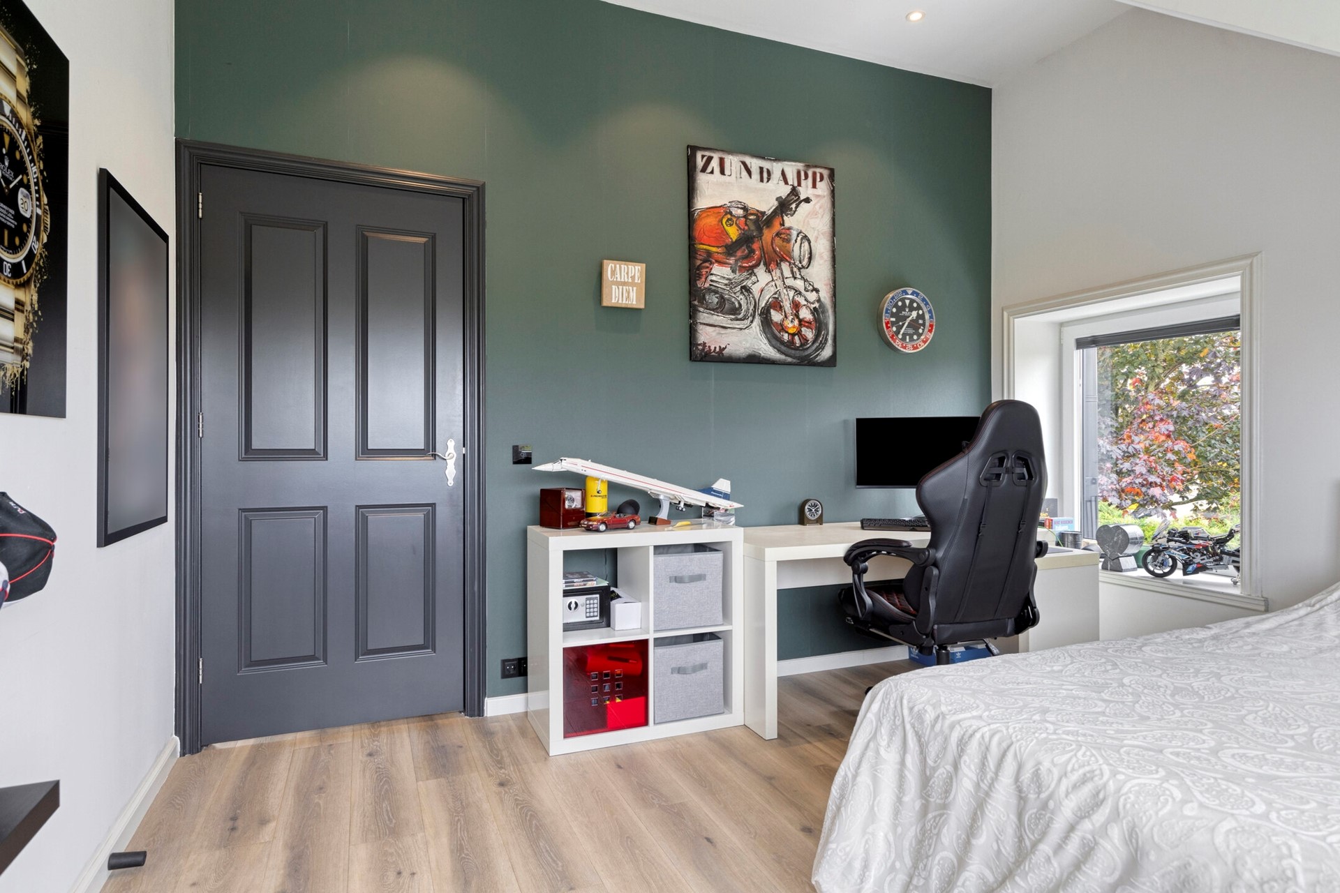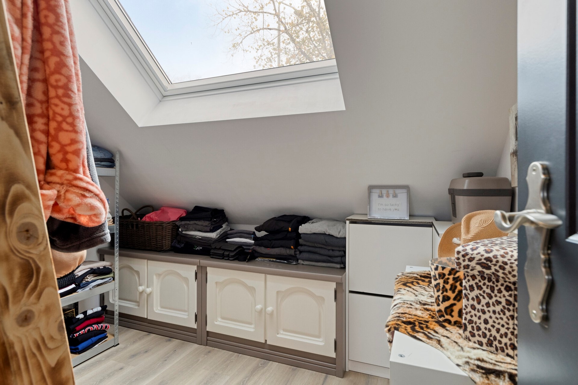 Slaapkamer 3 is afgewerkt met een PVC vloer, gestucte wanden en een gestuct plafond. De slaapkamer is voorzien van een Velux dakraam.