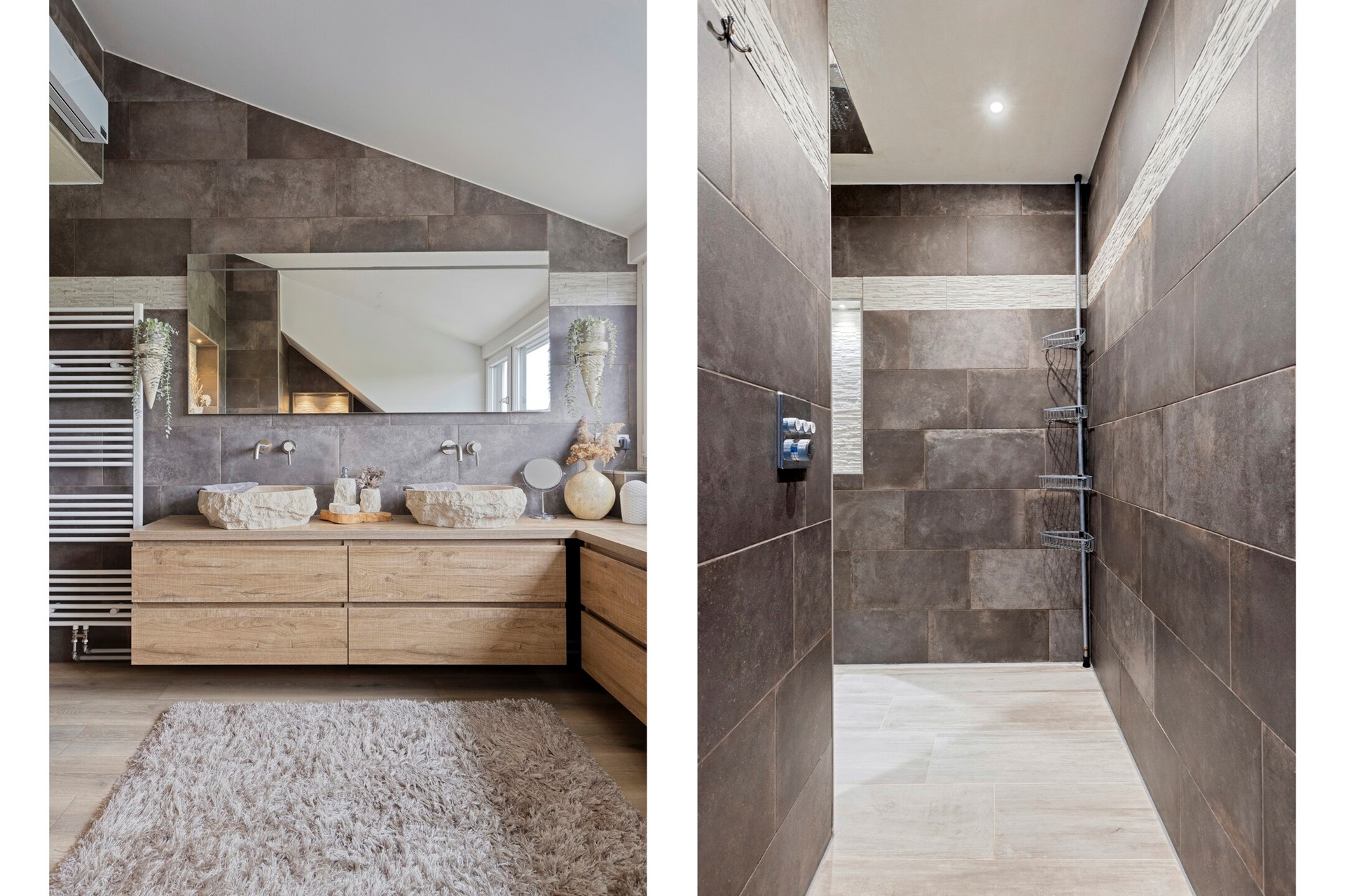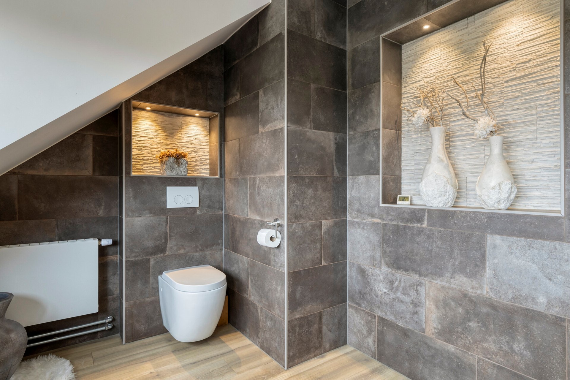 Me-Time! Kom tot rust in deze gave badkamer die het Wellness gevoel thuis brengt. De moderne badkamer is afgewerkt met een PVC vloer, betegelde wanden en een gestuct en deels polyester plafond. De badkamer is voorzien van een riante inloopdouche met stortdouche, wastafelmeubel met twee natuursteen wasbakken, 2e toilet, design radiator en dakkapel met elektrisch rolluik.